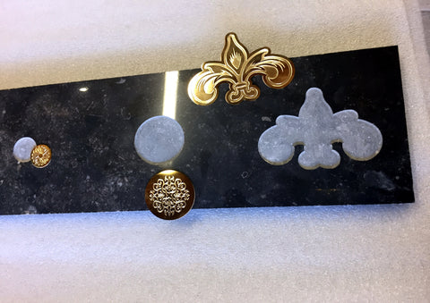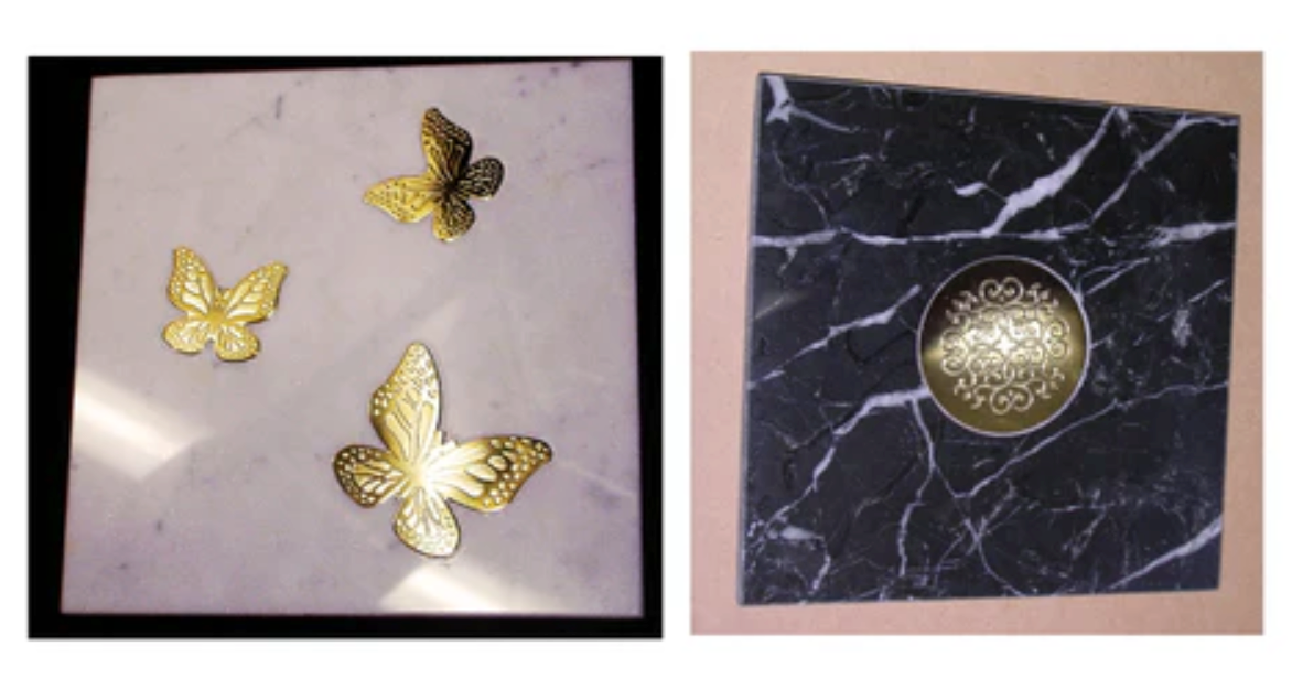 On demand we produce wood & marble tiles with 24k gold inserts and other metals inlaid,and also art metals slabs to decor  furniture, walls, doors, ceilings, lifts. Lately even artistic metal labels and inserts for various brands in different sectors.