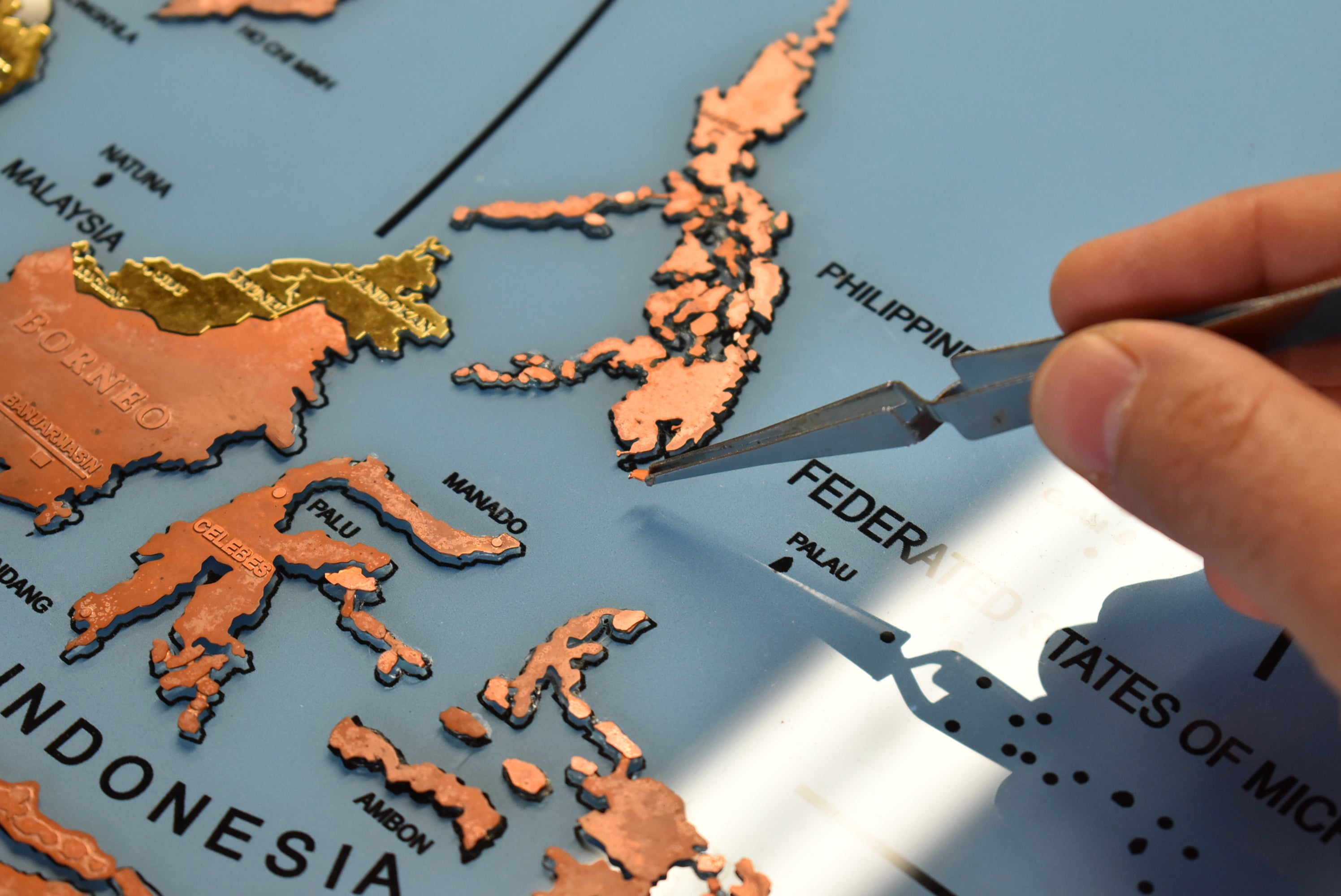 Extremely technical and geometrical precision allows faithful materials reinterpretation of paper maps turning into real wall jewels. Countries, islands, different elements and details made with metals where each insert is in fact like a real jewel.