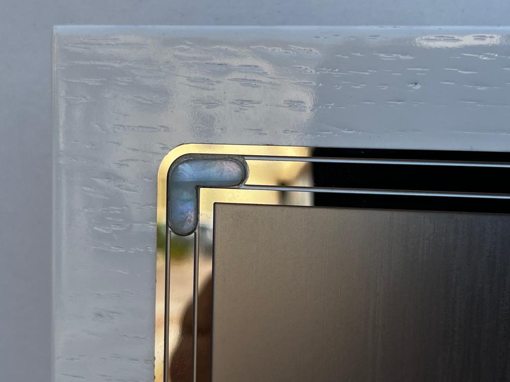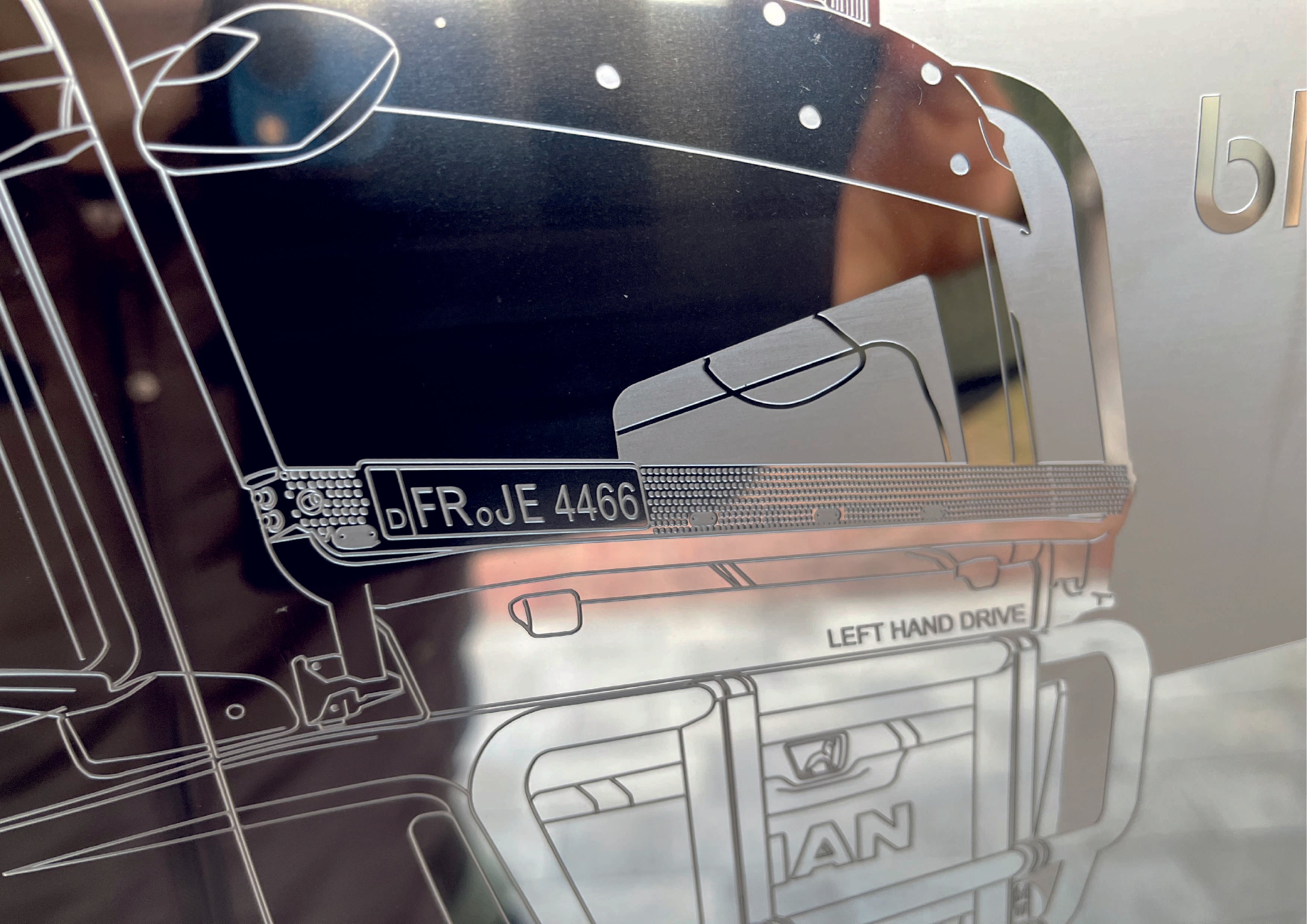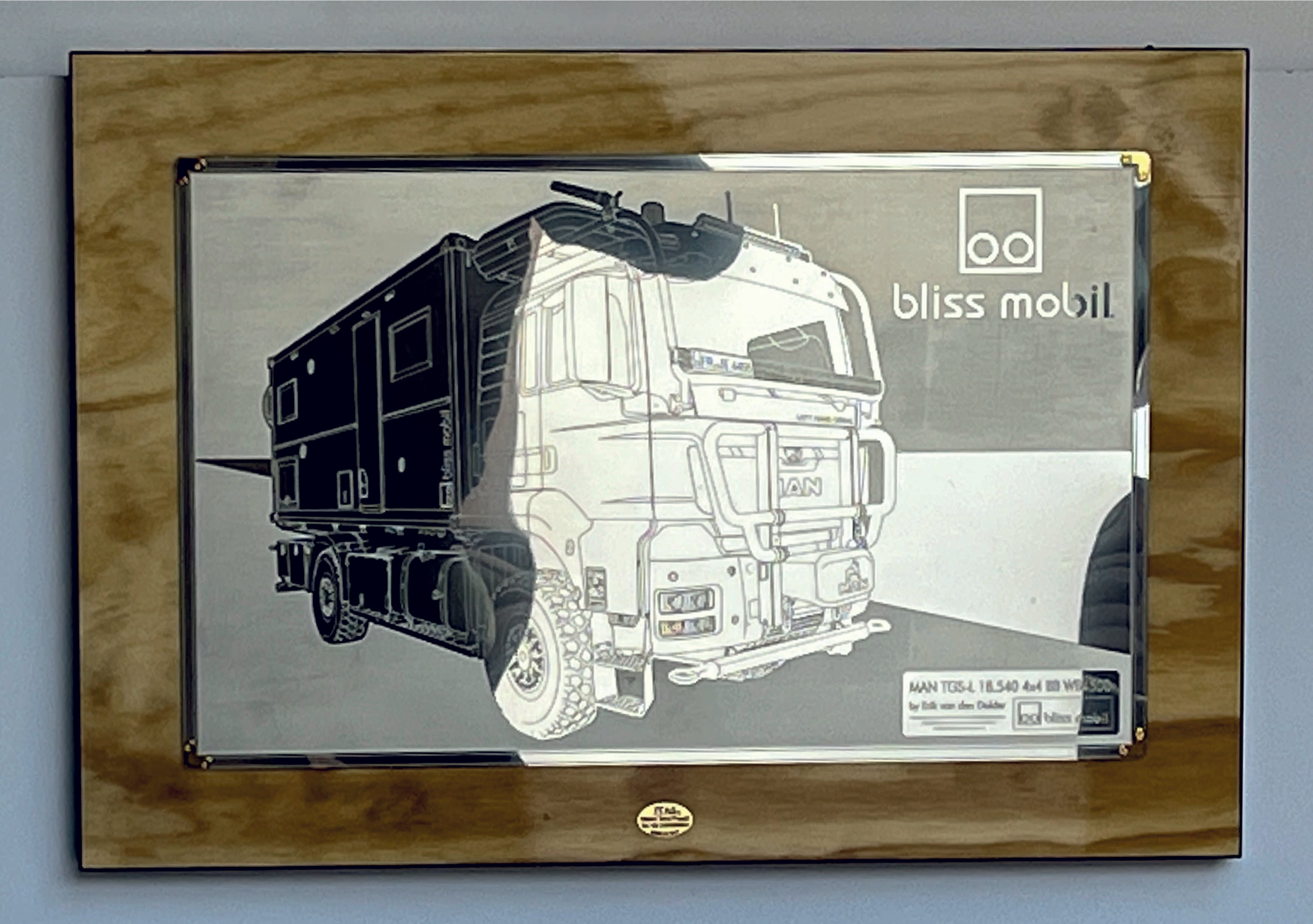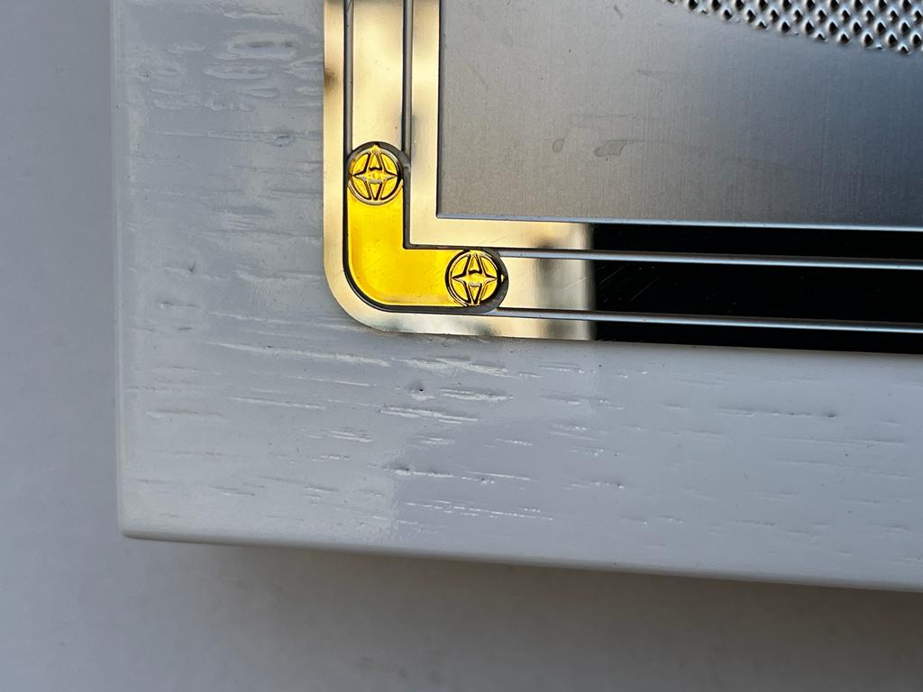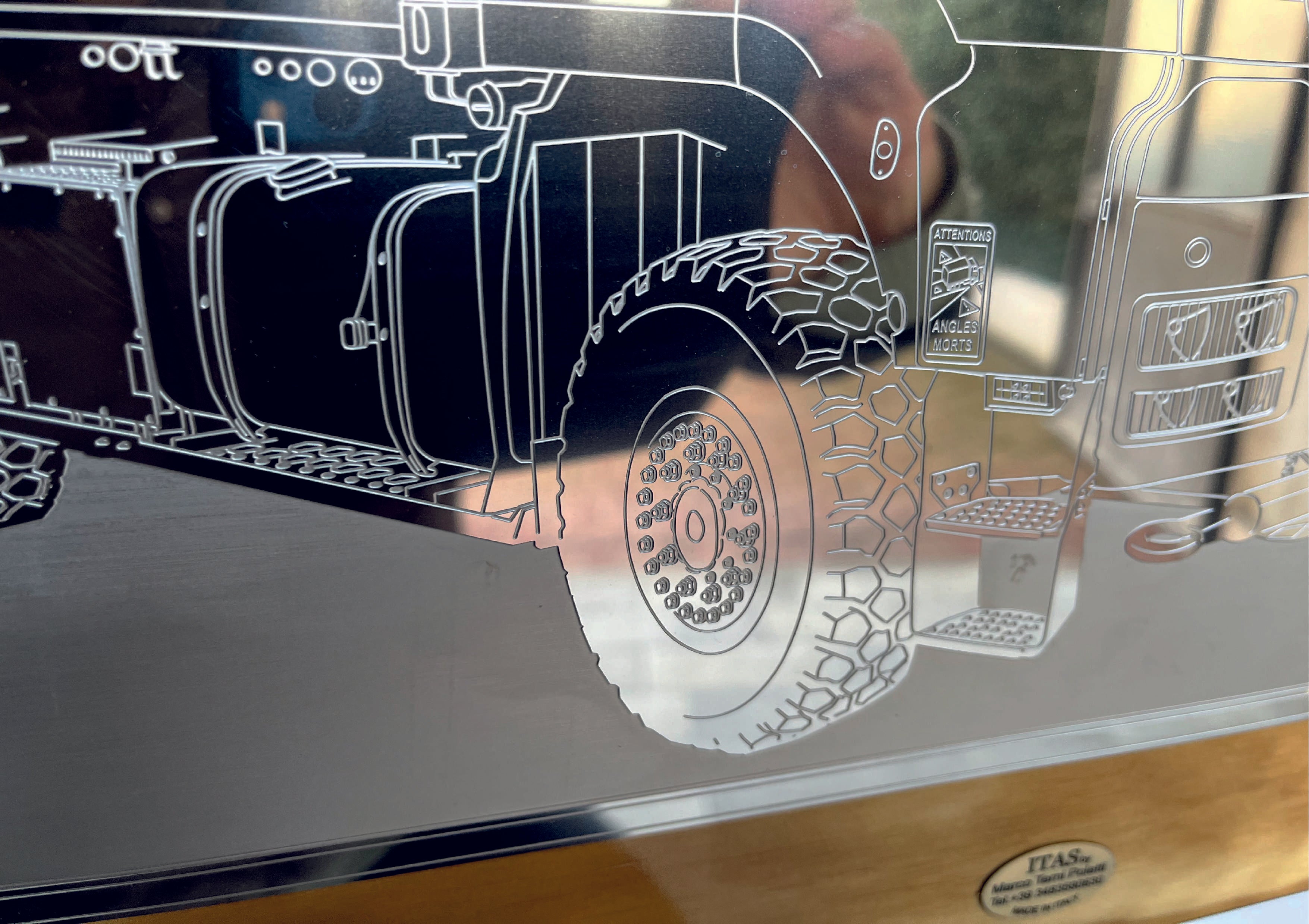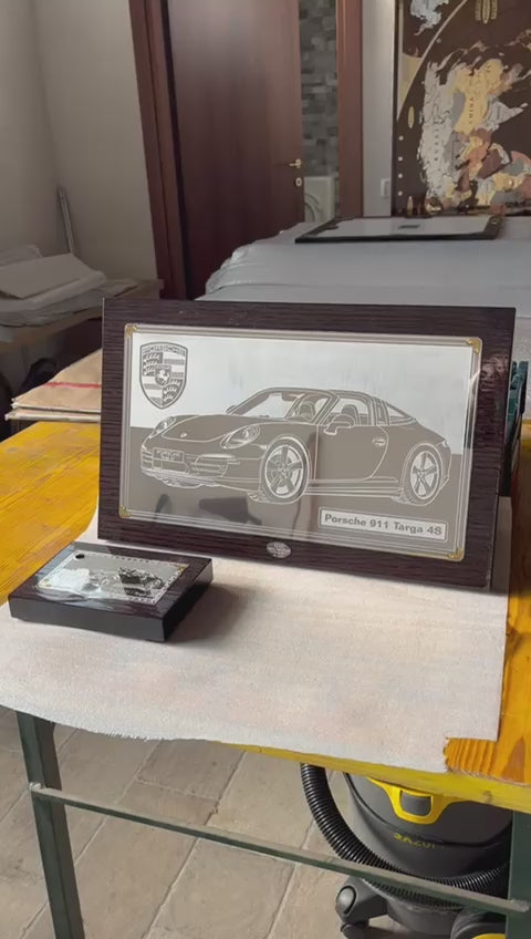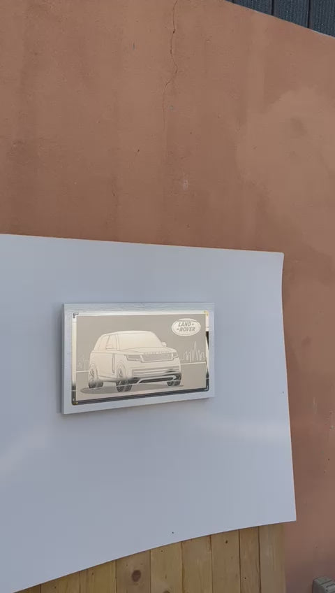 Decorative artwork made with engraved stainless steel and 24 k gold finishes 4 details. Artistically engraved metal inserts are fixed on a wood panel to obtain the most exclusive and pertinent decor dedicated to your car or other vehicle.