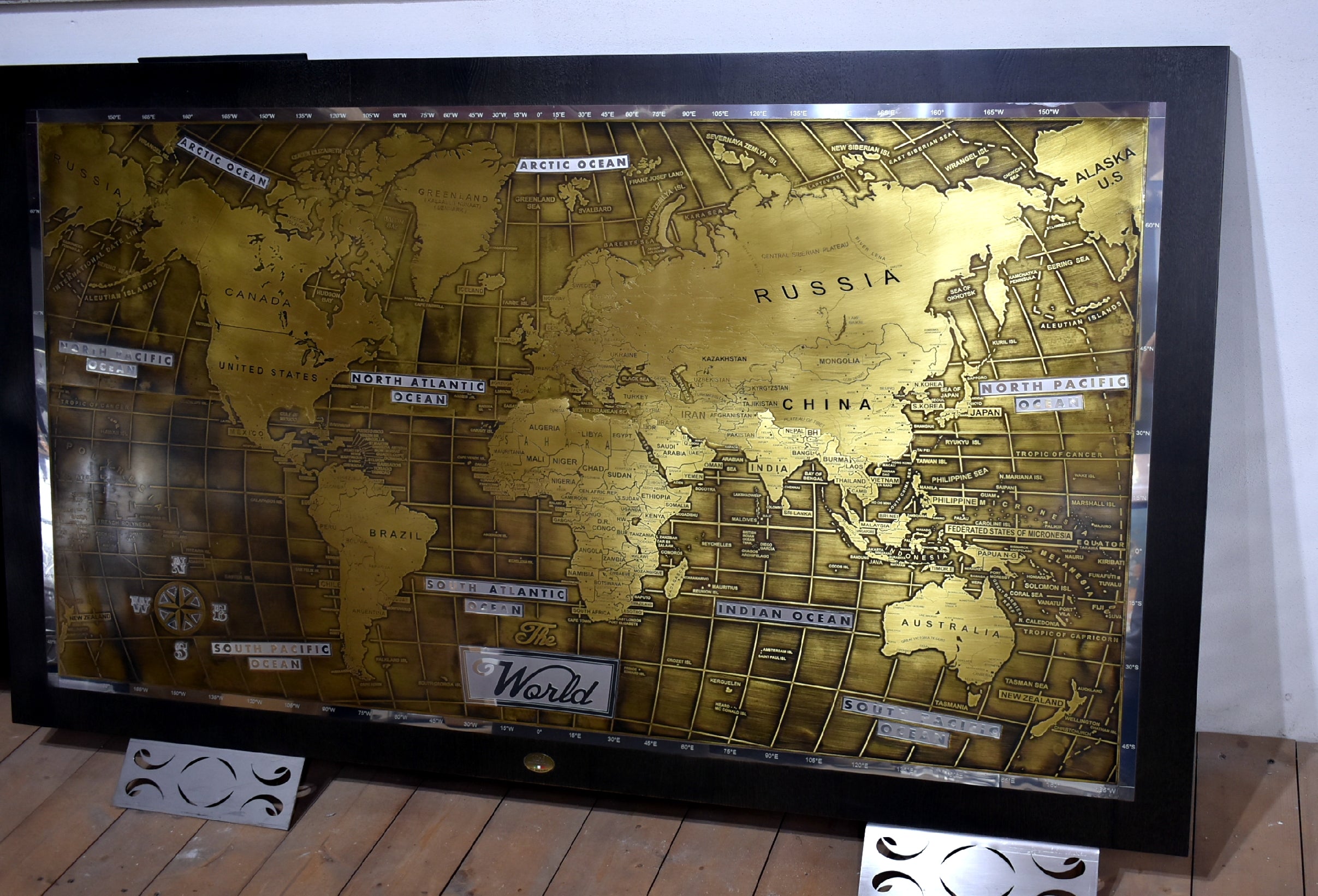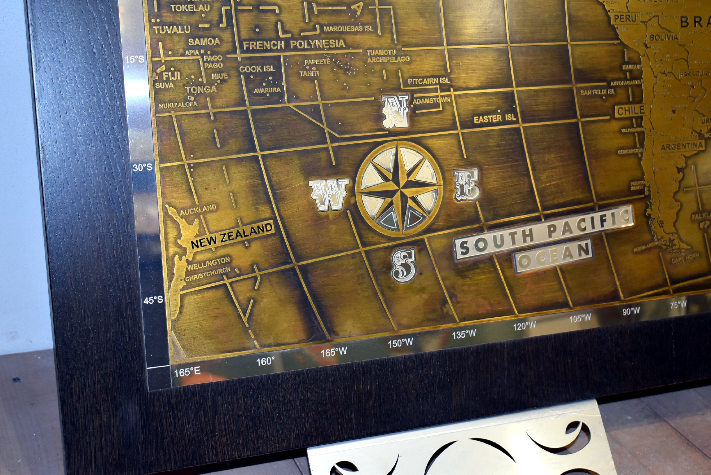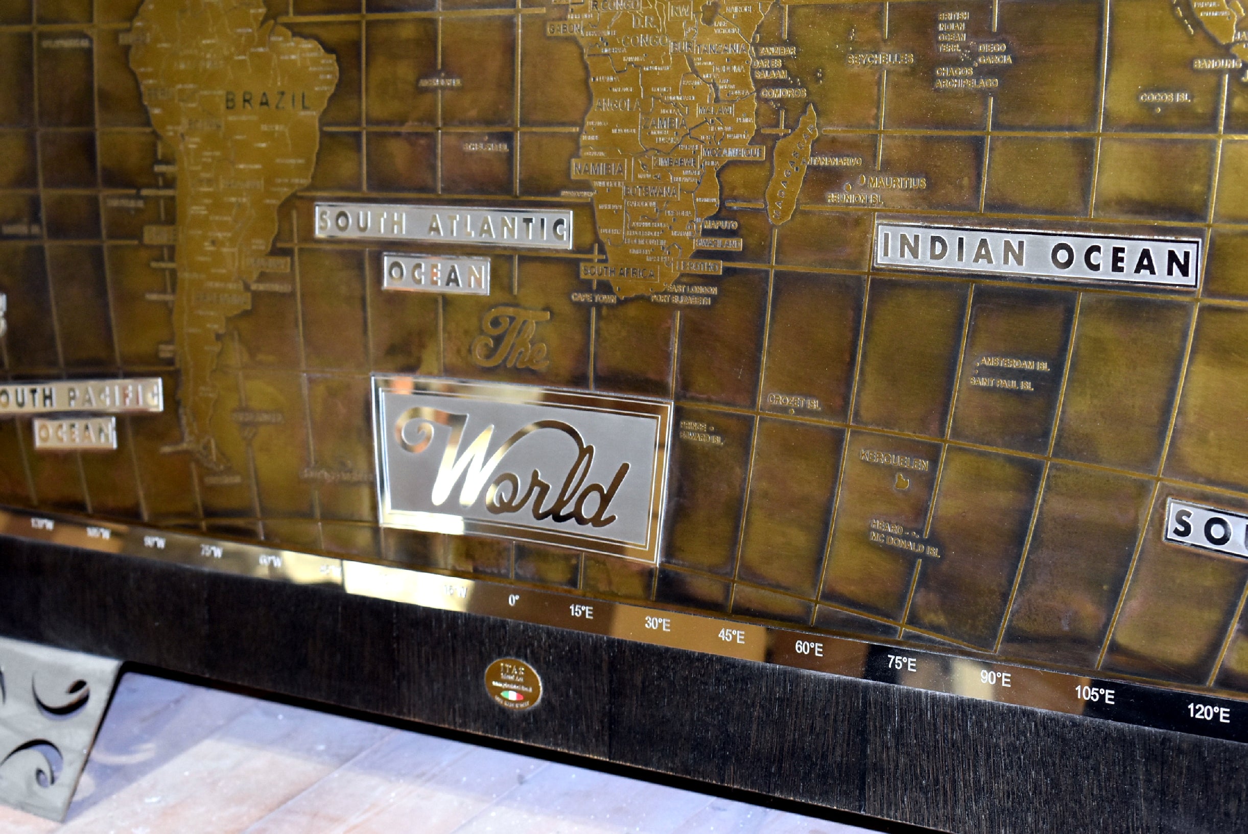 Antiqued with citric acid, brushed by hand, and furthermore coated with transparent varnish it contains more than 200 writes engraved and enameled one by one by hand. The slab is inlaid with other 24 stainless steel inserts ( the words - The World, the compass rose, cardinal points, and the names of the oceans). The 24 steel inserts are engraved and hand-polished too. Overall all metals worked are fixed on a special light wood or oak panel painted wengè.