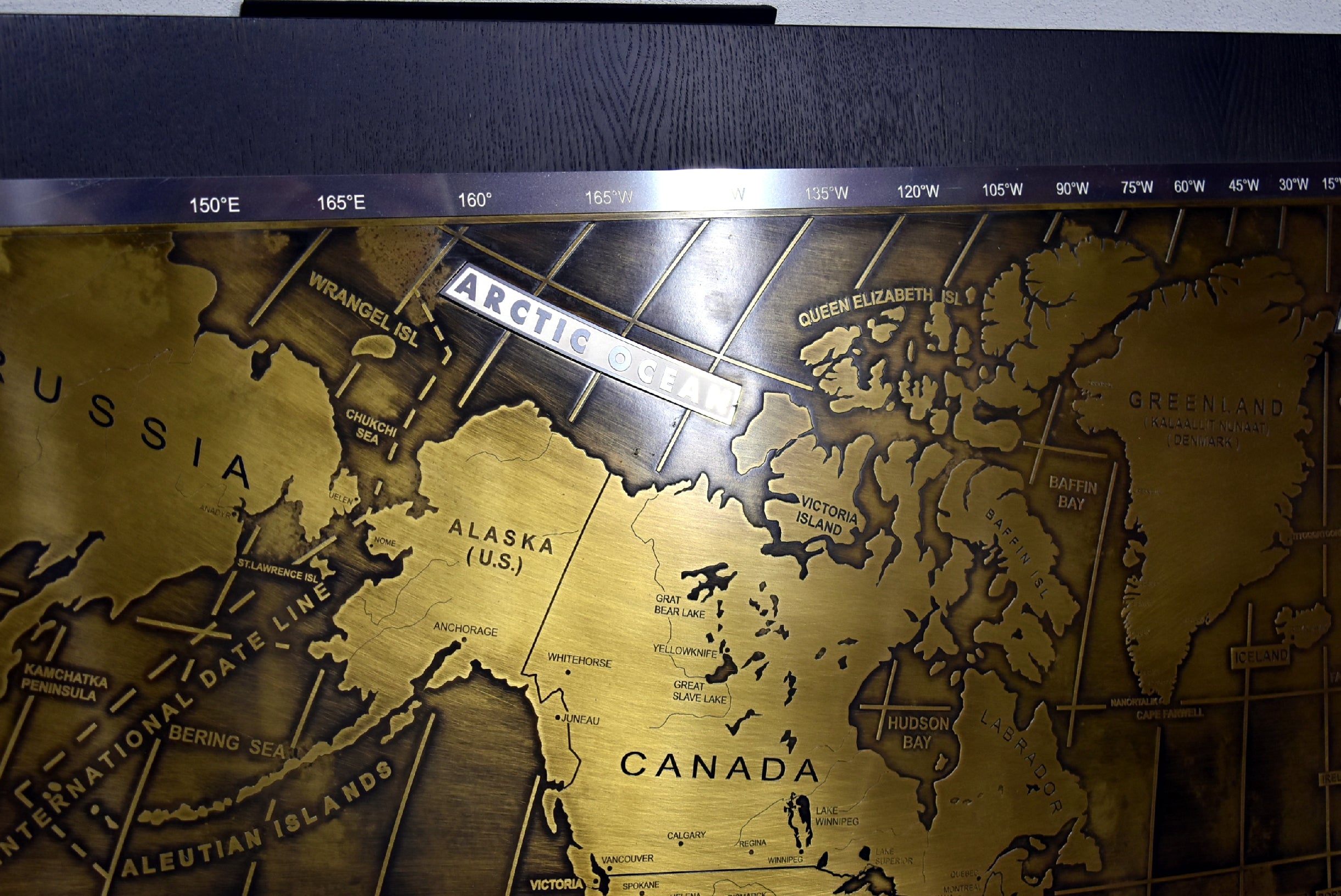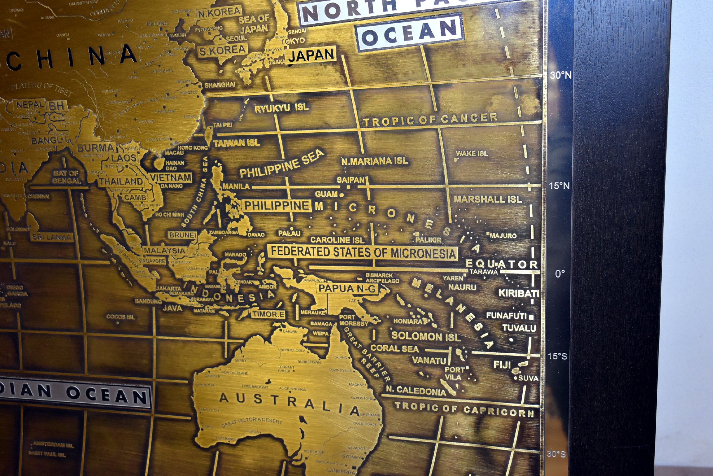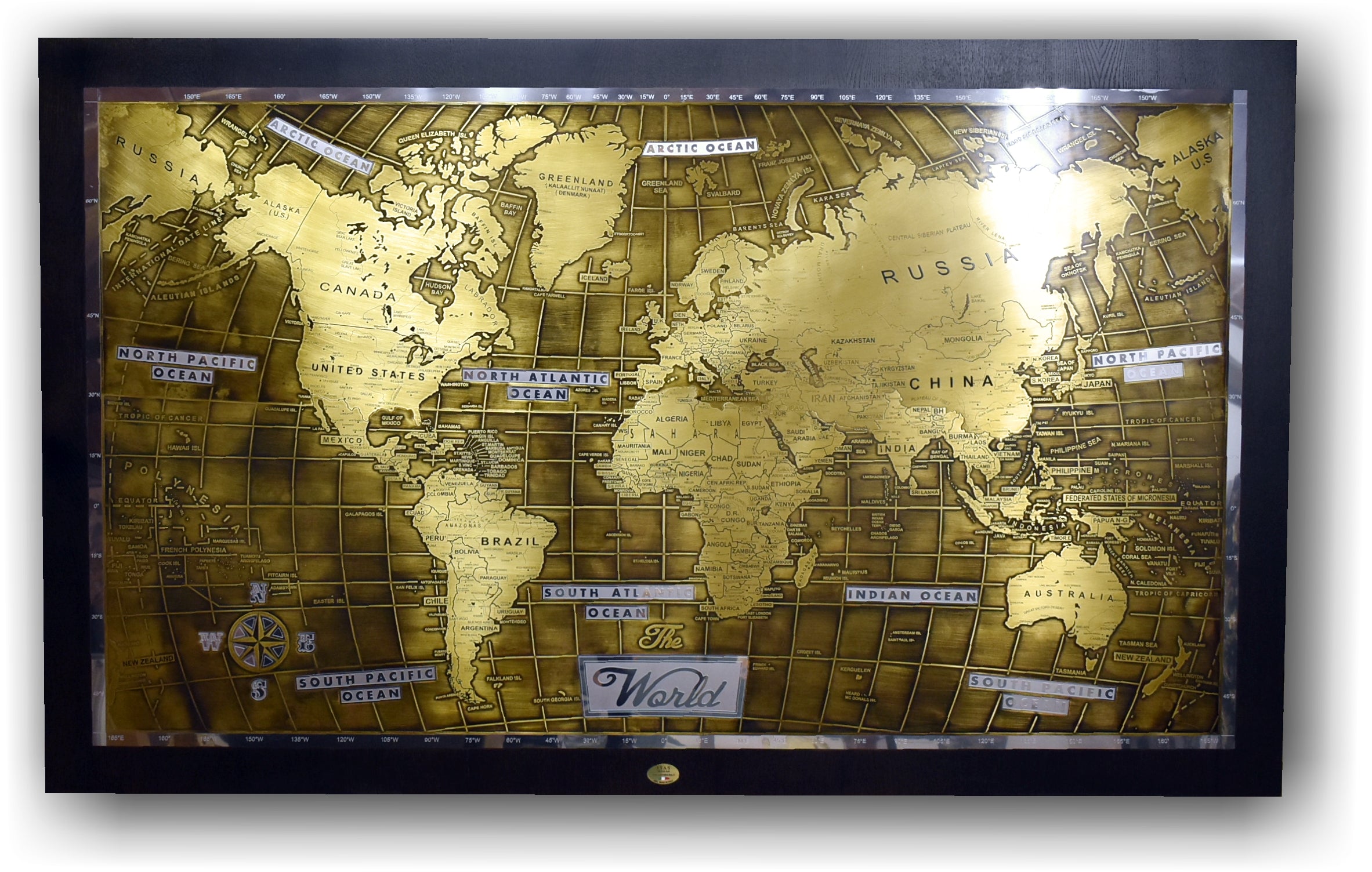 Antiqued with citric acid, brushed by hand, and furthermore coated with transparent varnish it contains more than 200 writes engraved and enameled one by one by hand. The slab is inlaid with other 24 stainless steel inserts ( the words - The World, the compass rose, cardinal points, and the names of the oceans). The 24 steel inserts are engraved and hand-polished too. Overall all metals worked are fixed on a special light wood or oak panel painted wengè.