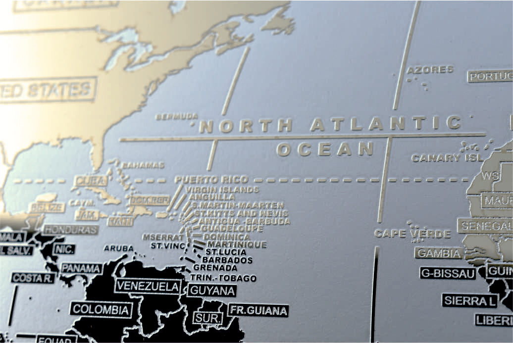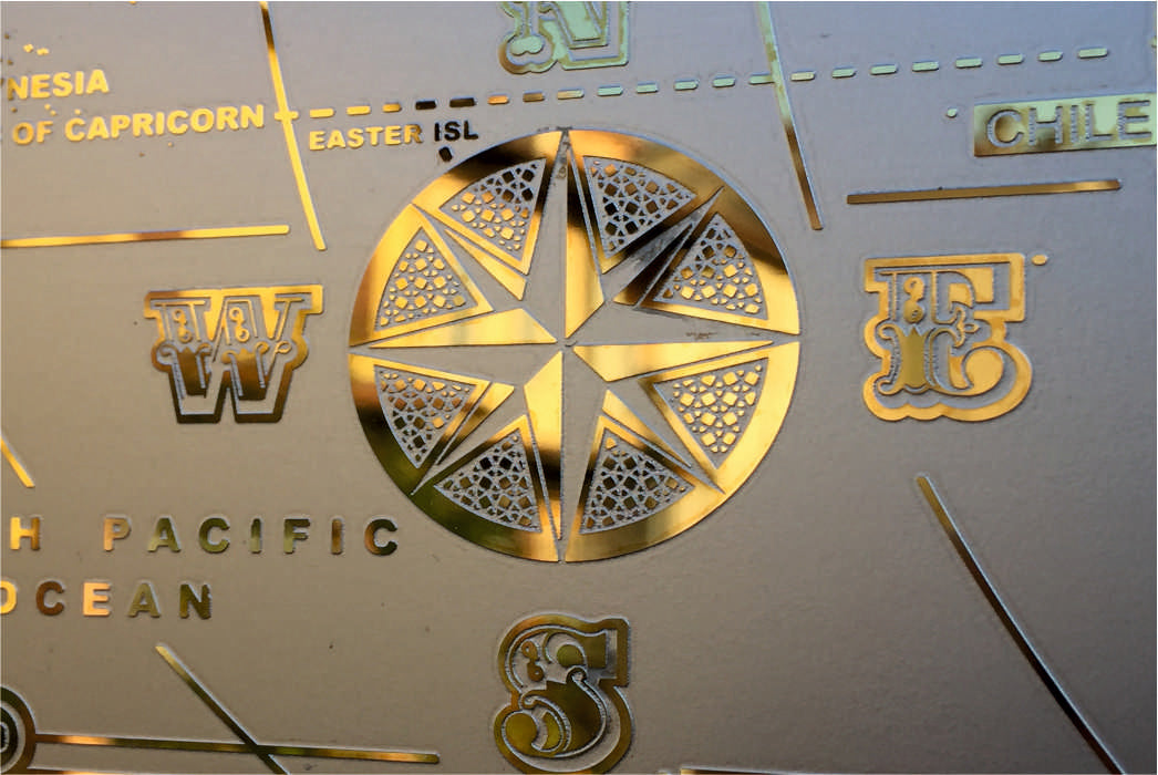 Decorative world map made with Stainless 24 gold finishes, where engraved metals are fixed on wood panels to obtain elegant decorations. Pieces unique that confer prestige and originality.