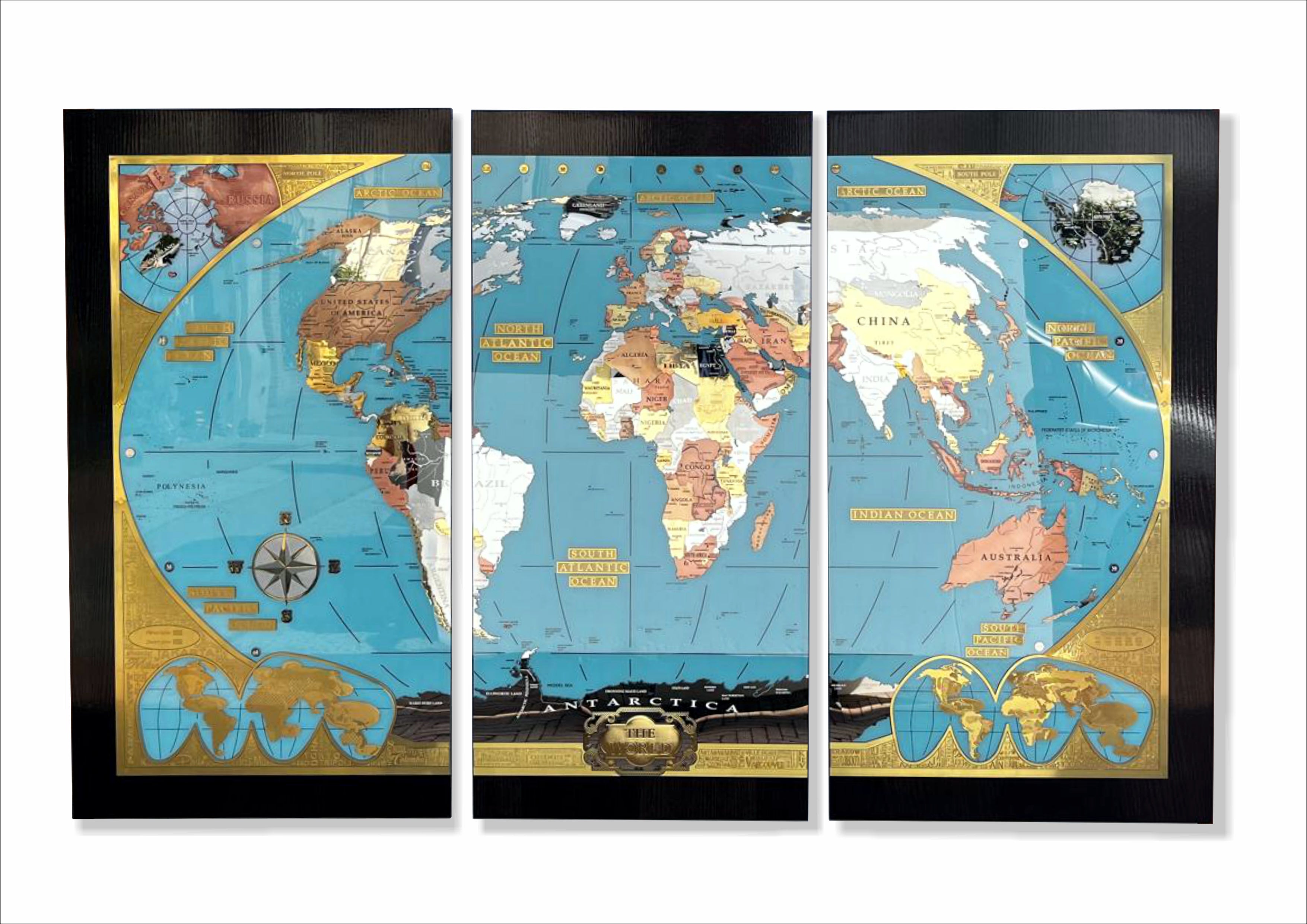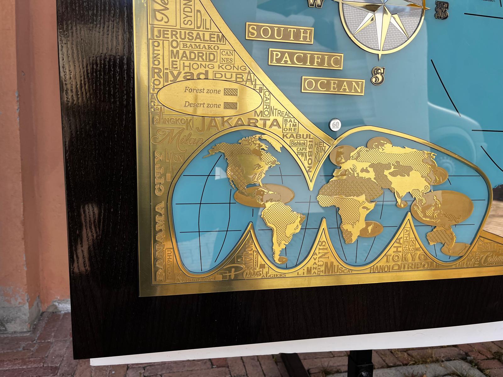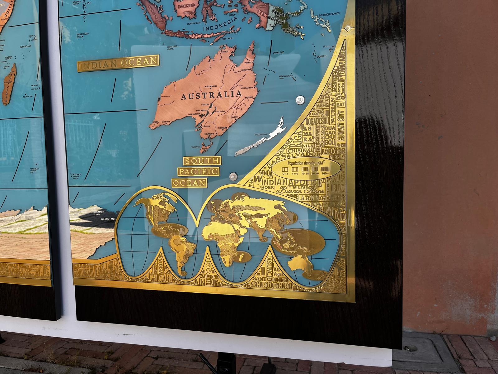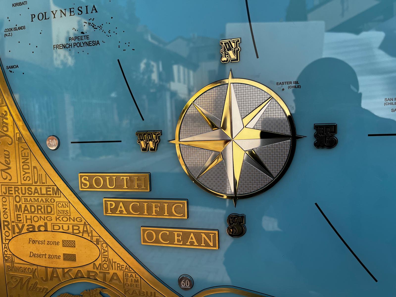 A good part of the metal inserts contains engraved writings, the around  400 present writings are glazed by hand one by one. Each nation is a different insert made with different metal as well as the most important islands and the poles too. All the pieces are set on 3 sheets of synthetic blue crystal shaped by CNC pantograph and then digitally printed. The 3 crystal sheets ( Lexan polycarbonate) completed with metals are fixed on 3 oak wood panels. The wood panels are varnished and polished with wax by hand.