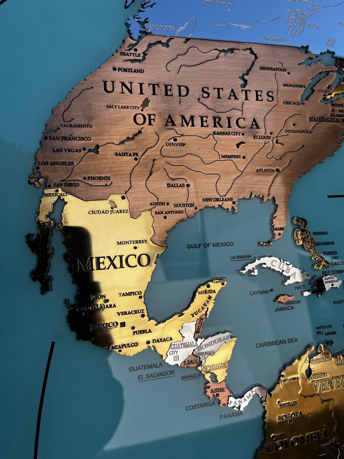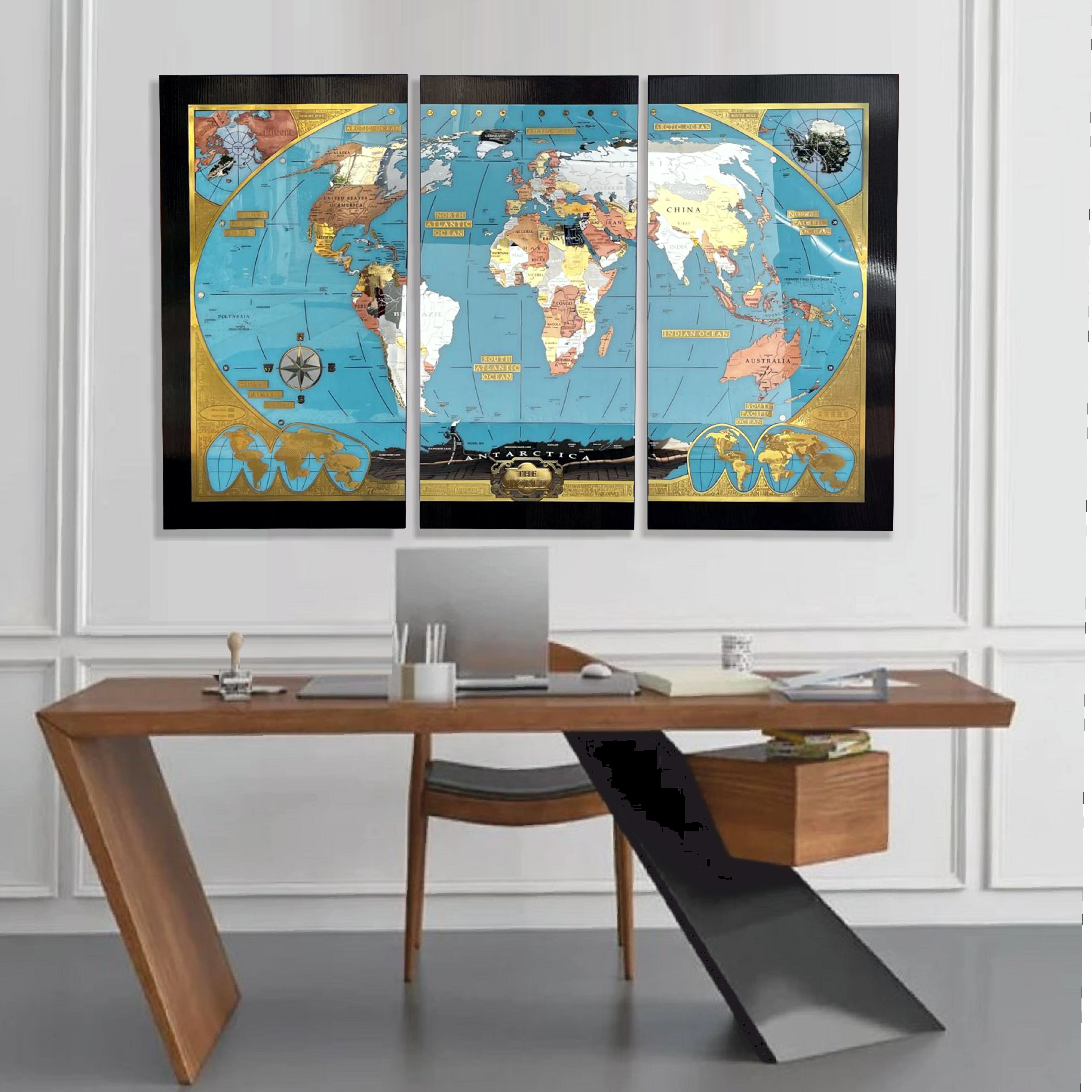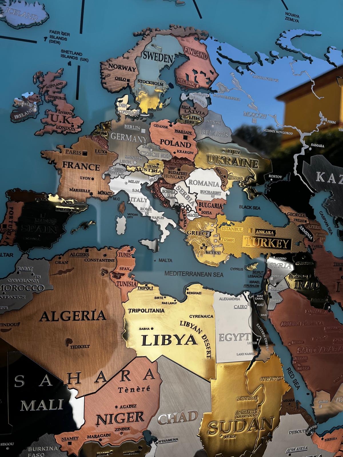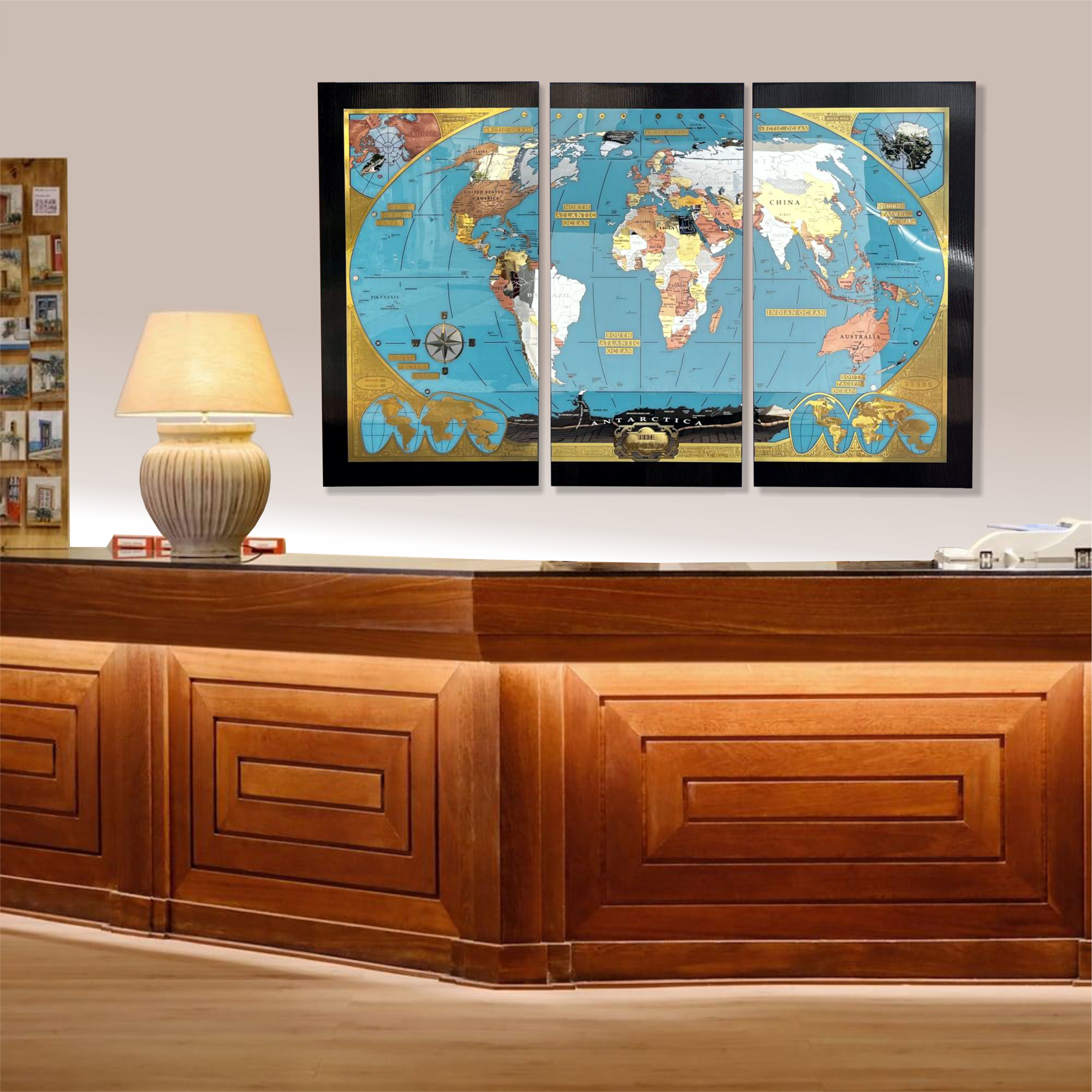 A good part of the metal inserts contains engraved writings, the around  400 present writings are glazed by hand one by one. Each nation is a different insert made with different metal as well as the most important islands and the poles too. All the pieces are set on 3 sheets of synthetic blue crystal shaped by CNC pantograph and then digitally printed. The 3 crystal sheets ( Lexan polycarbonate) completed with metals are fixed on 3 oak wood panels. The wood panels are varnished and polished with wax by hand.