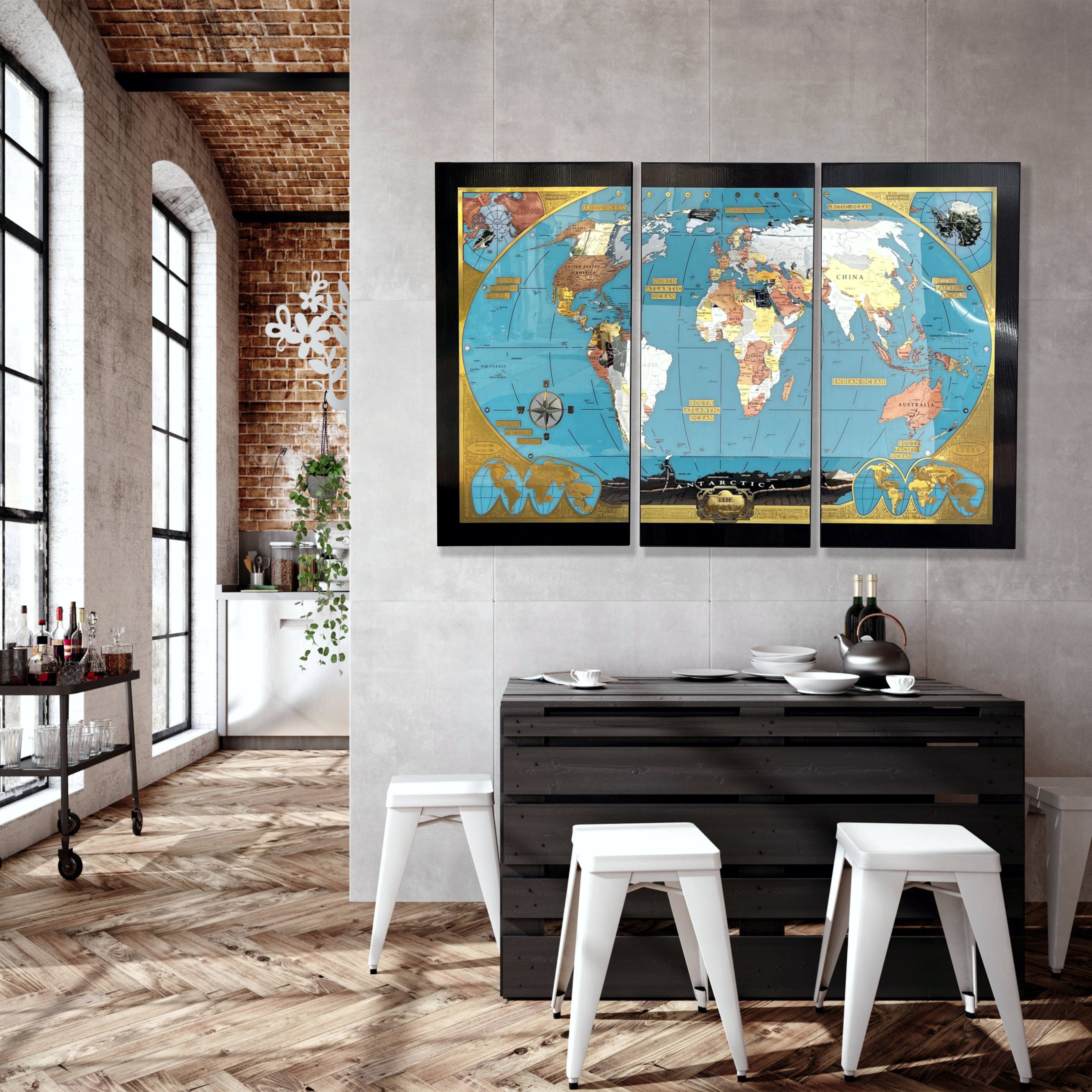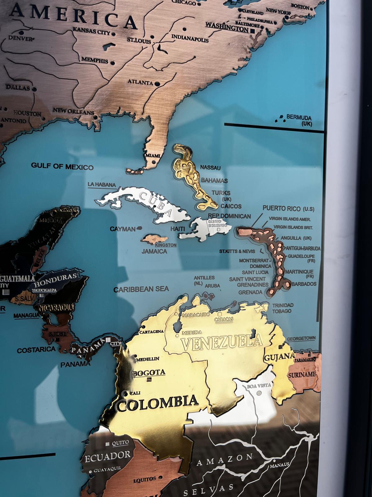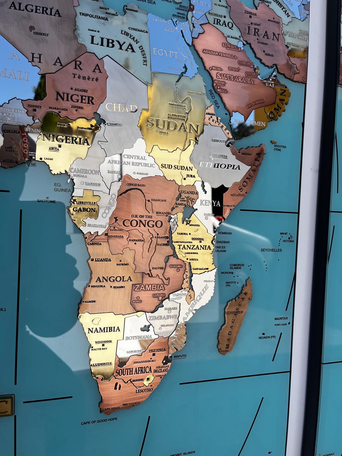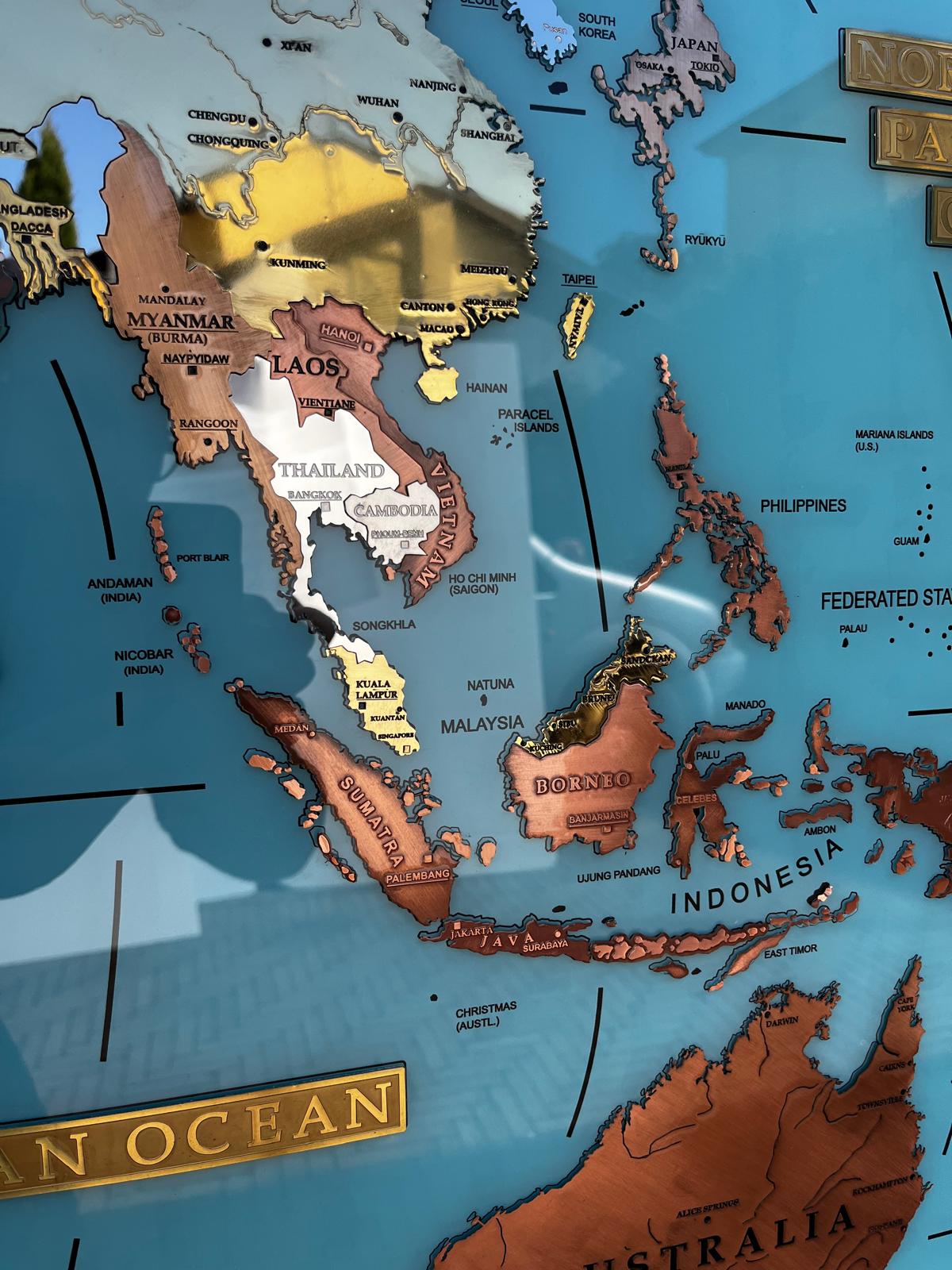A good part of the metal inserts contains engraved writings, the around  400 present writings are glazed by hand one by one. Each nation is a different insert made with different metal as well as the most important islands and the poles too. All the pieces are set on 3 sheets of synthetic blue crystal shaped by CNC pantograph and then digitally printed. The 3 crystal sheets ( Lexan polycarbonate) completed with metals are fixed on 3 oak wood panels. The wood panels are varnished and polished with wax by hand.