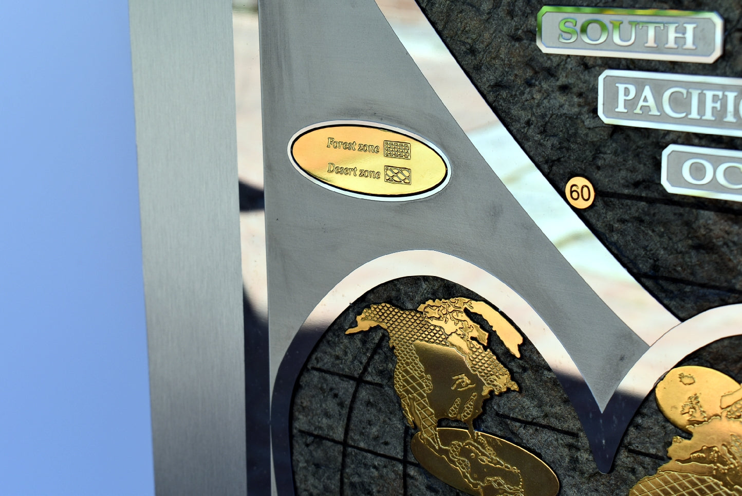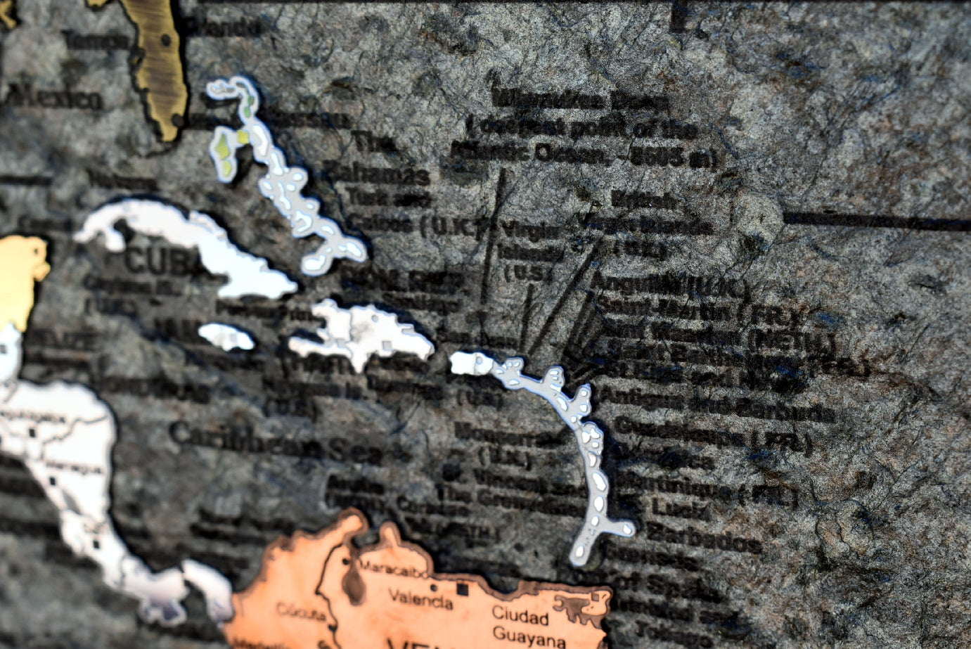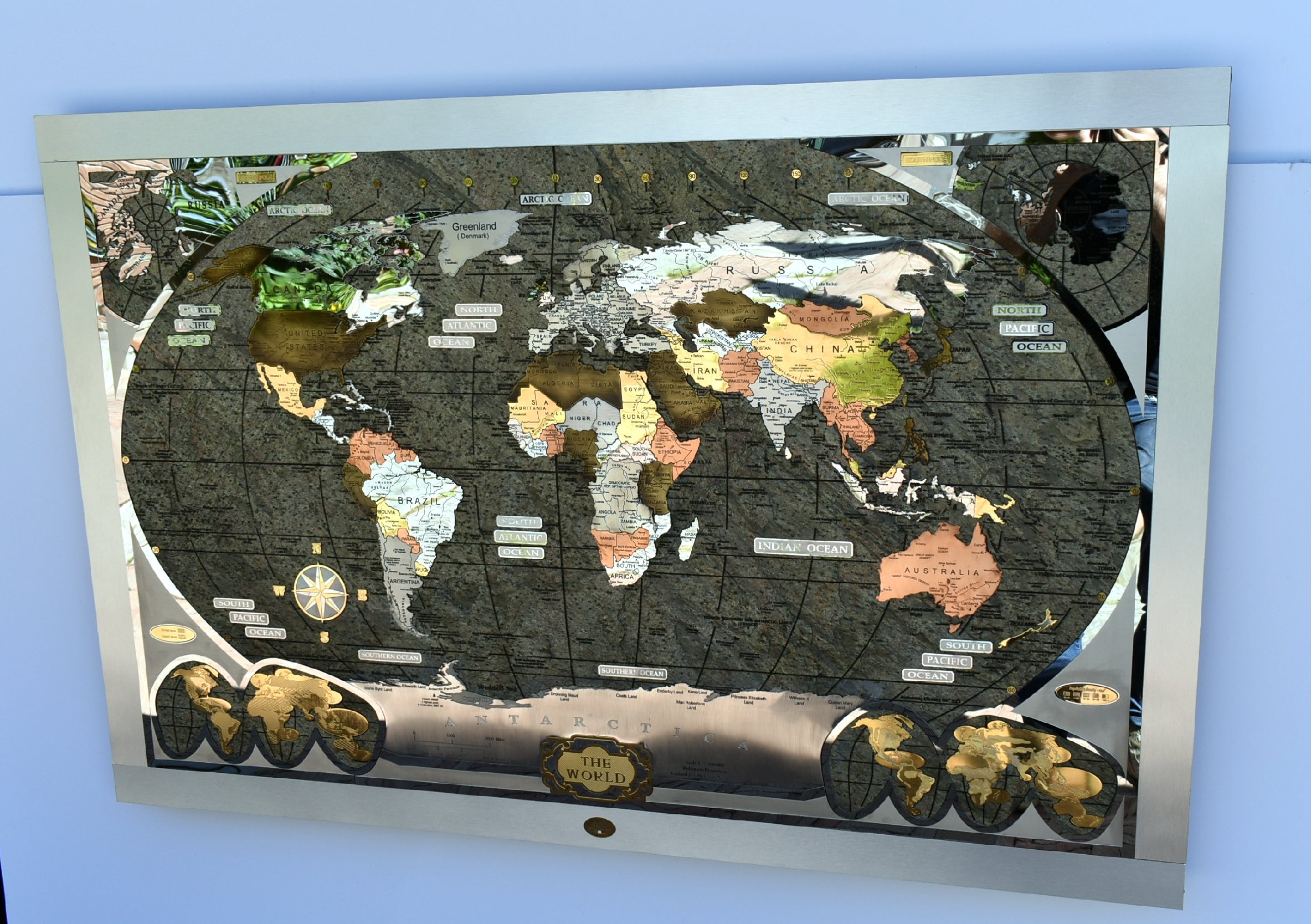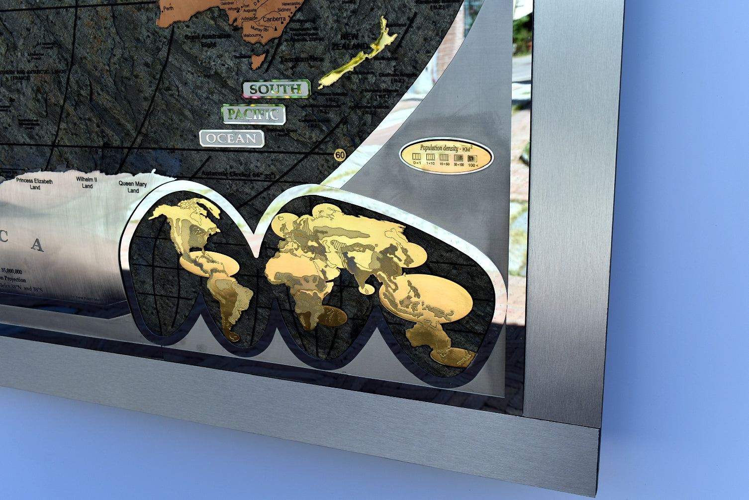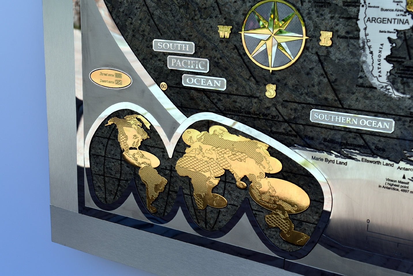 The kind of stone is ''Grey Slate'' it is all frosted and leveled by hand in order to apply all the metals in such a way as not to create height differences between the metals. The art metals are mounted on the sheet stone cut, varnished, and printed with digital technologies (islands, meridians, parallels, etc). The worked stone is fixed on a laminate wood base panel.