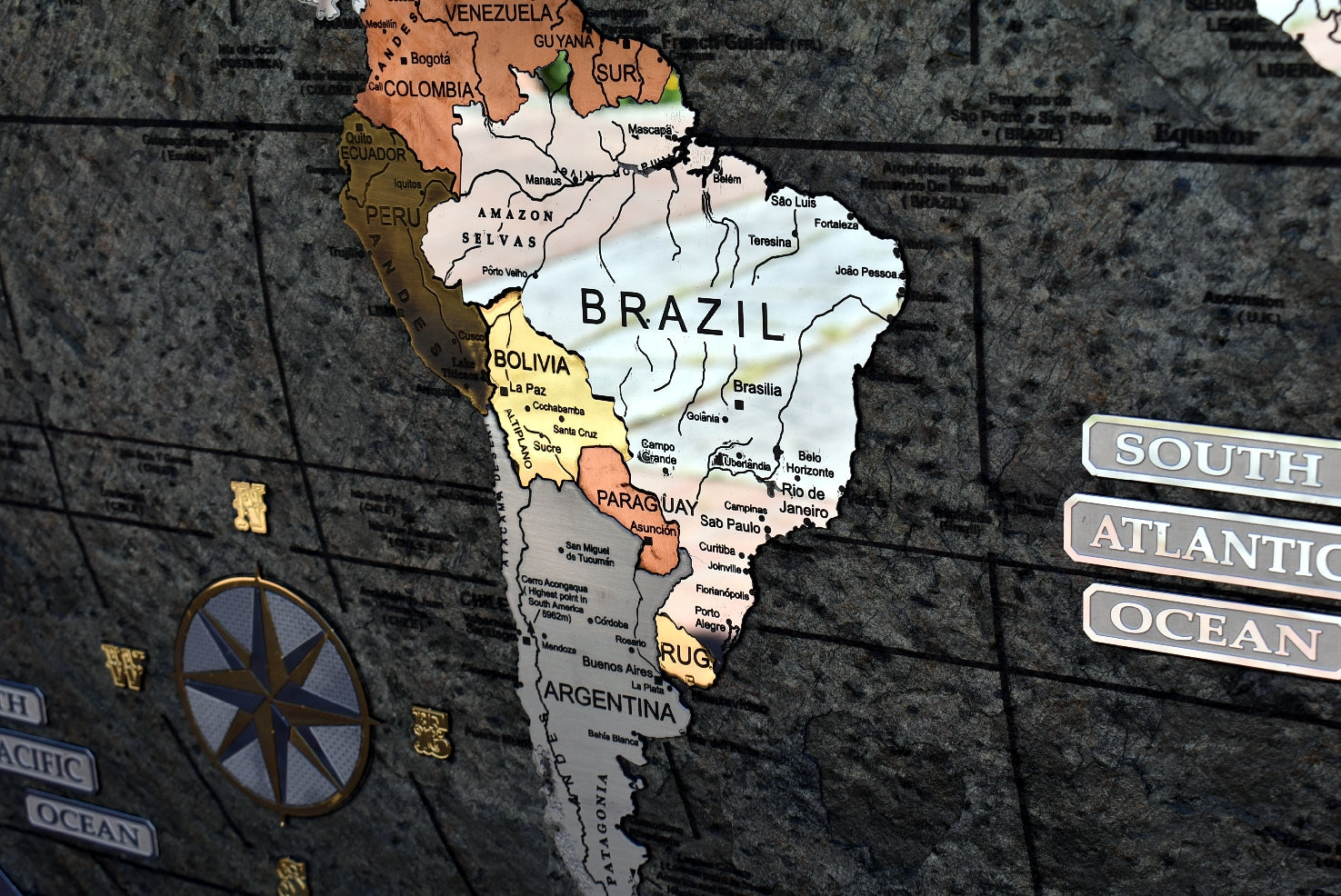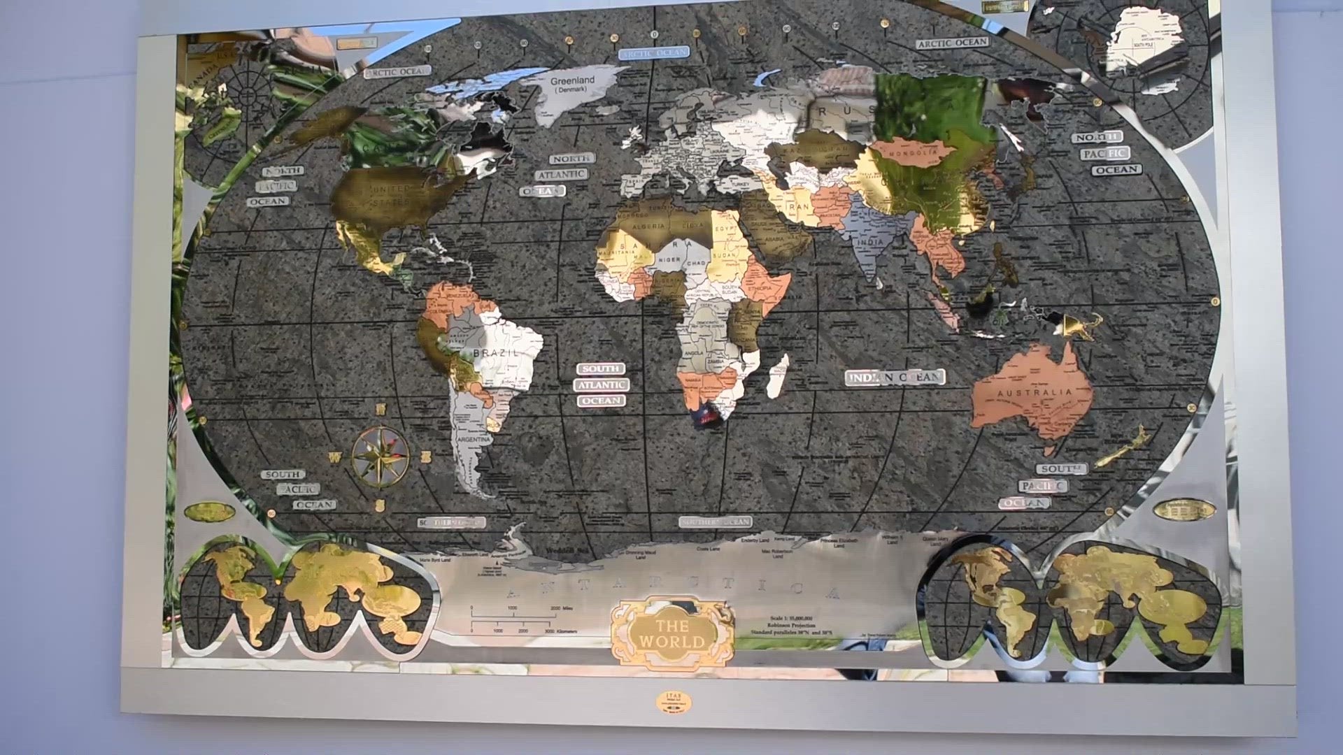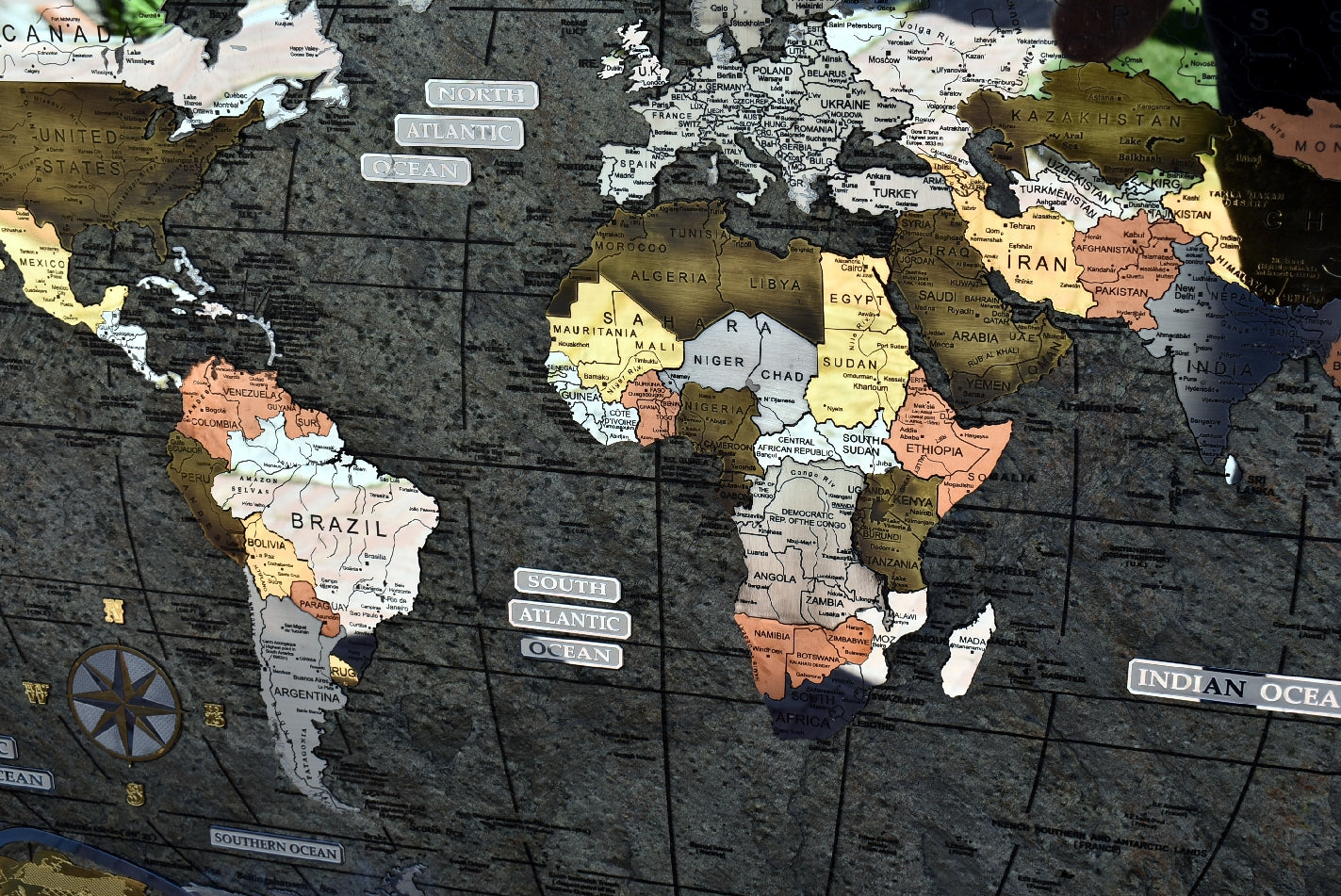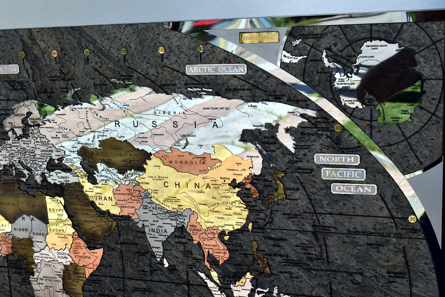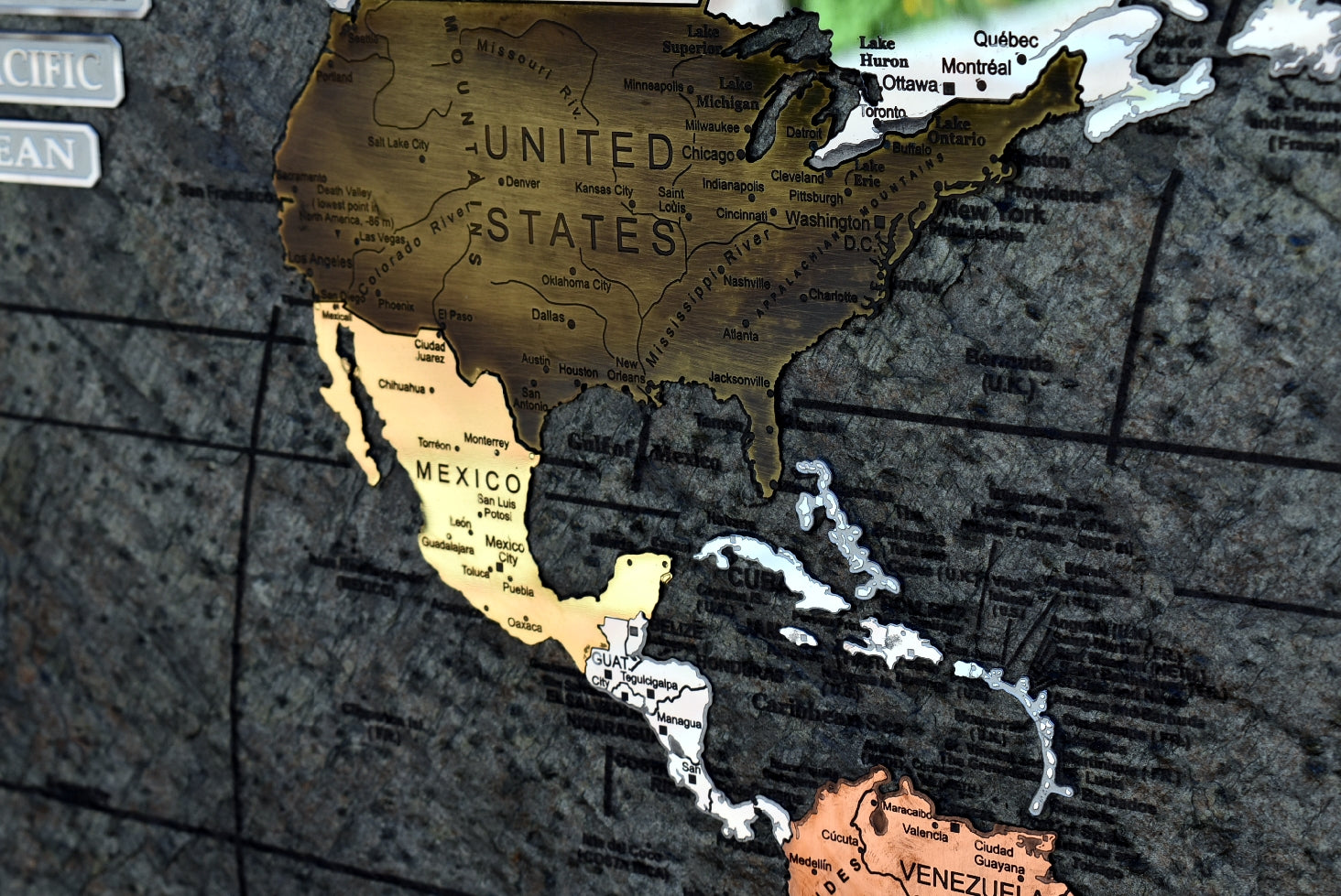 The kind of stone is ''Grey Slate'' it is all frosted and leveled by hand in order to apply all the metals in such a way as not to create height differences between the metals. The art metals are mounted on the sheet stone cut, varnished, and printed with digital technologies (islands, meridians, parallels, etc). The worked stone is fixed on a laminate wood base panel.