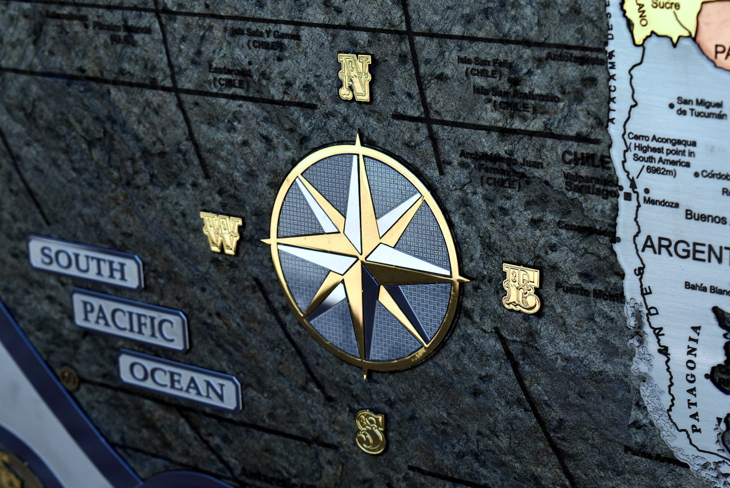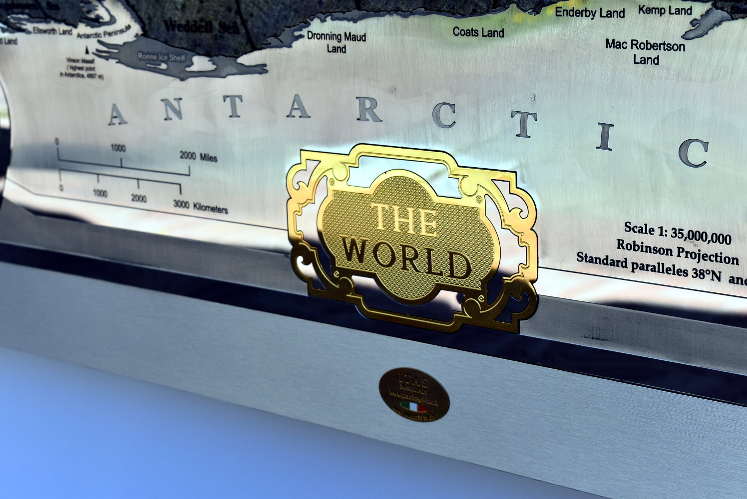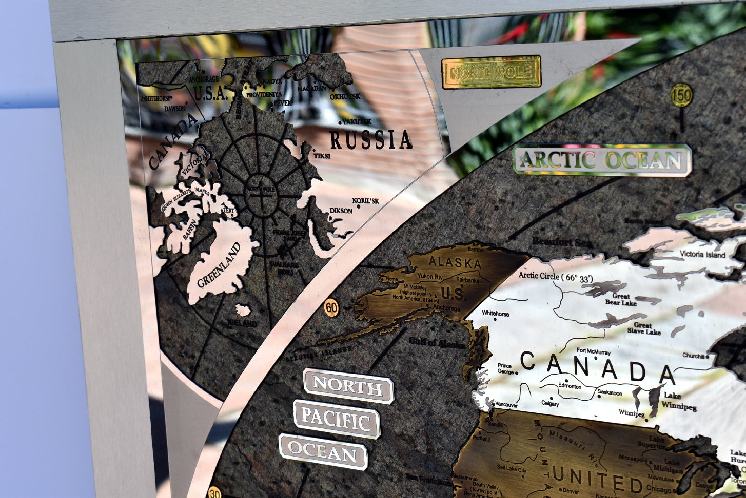 Usually are used pacific's pinewood varnished walnut color or oak wood wengè. Are present also 24 stainless steel engraved labels ( names of the oceans) they too engraved and fixed by hand on the stone. The panel also contains various 24k gold finished inserts pieces that is all the parts of the countries made with brass instead of the external frame is made with aluminum.