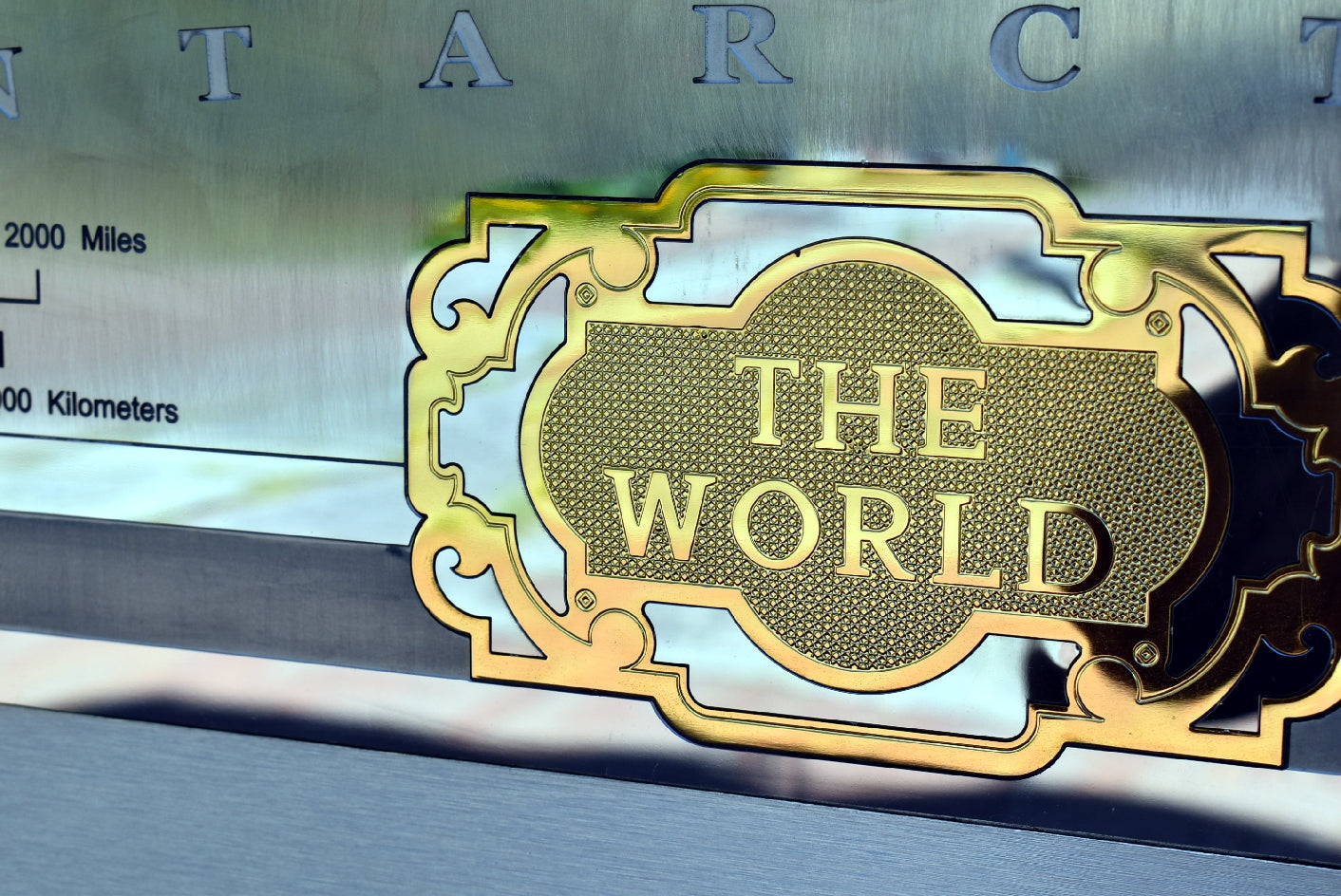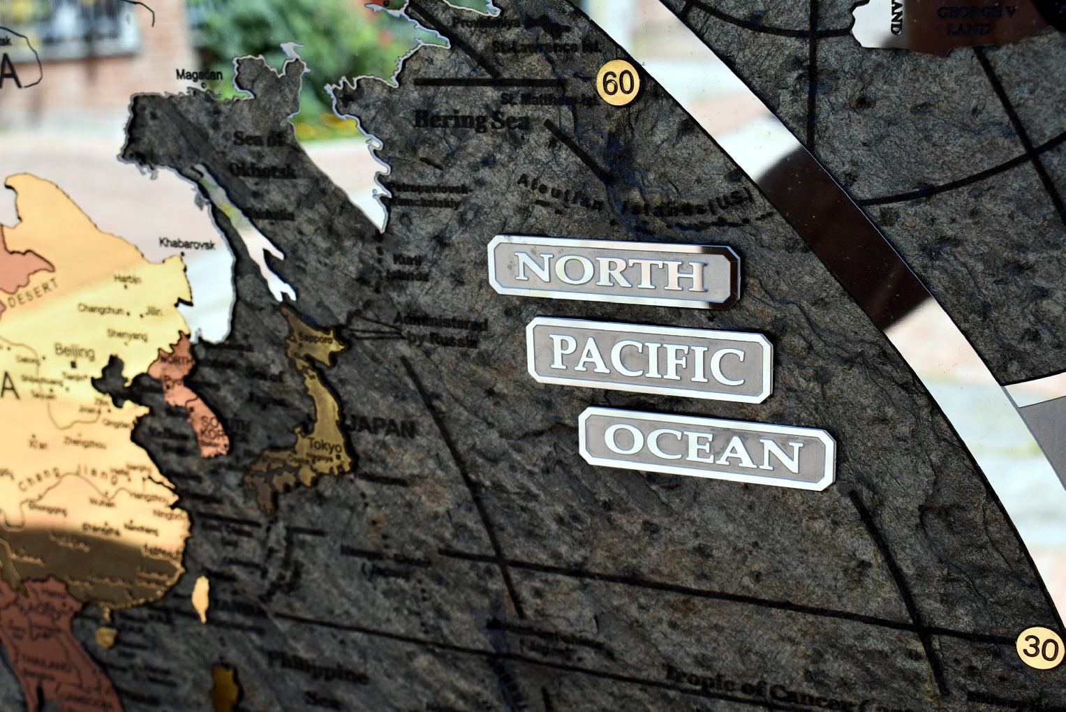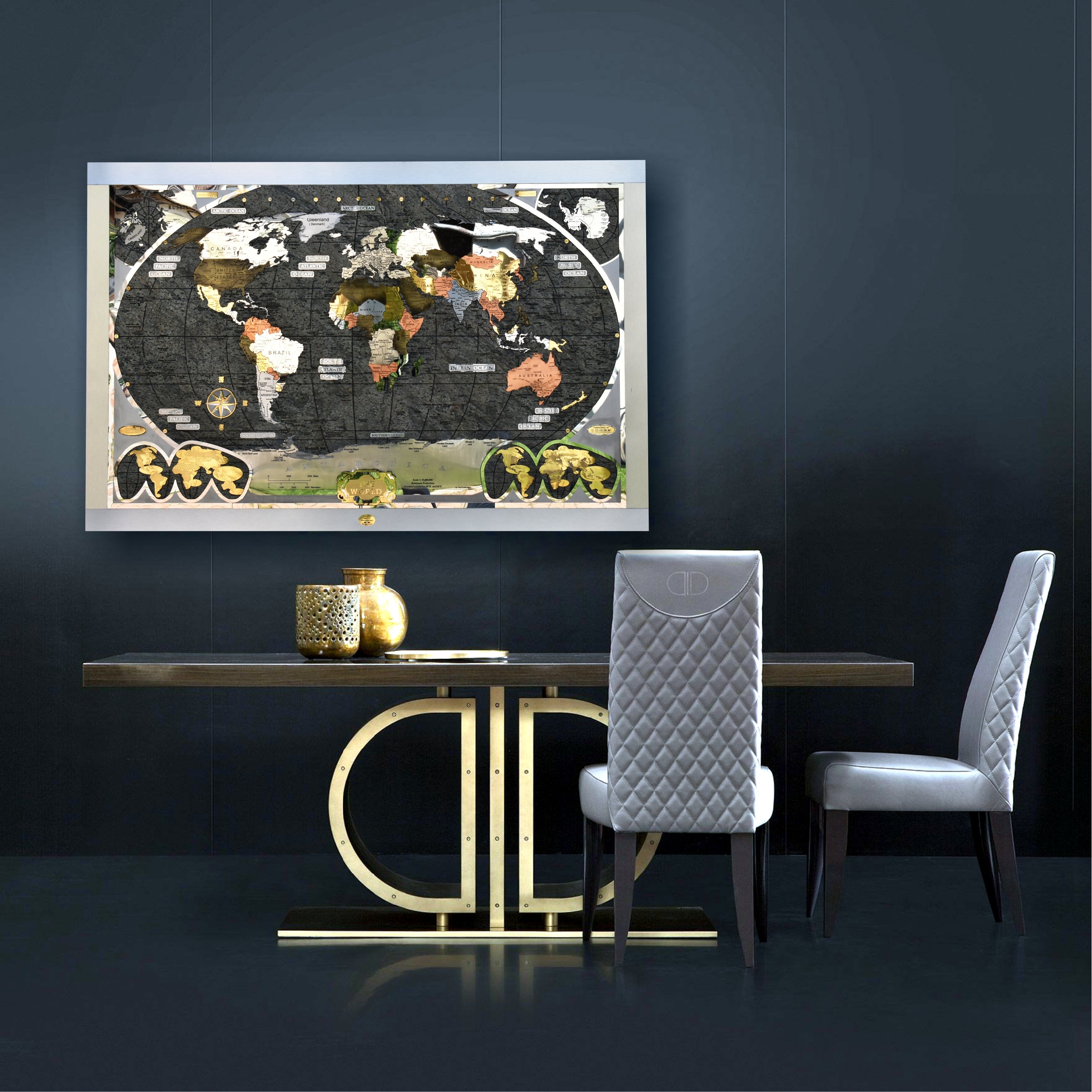 Usually are used pacific's pinewood varnished walnut color or oak wood wengè. Are present also 24 stainless steel engraved labels ( names of the oceans) they too engraved and fixed by hand on the stone. The panel also contains various 24k gold finished inserts pieces that is all the parts of the countries made with brass instead of the external frame is made with aluminum.