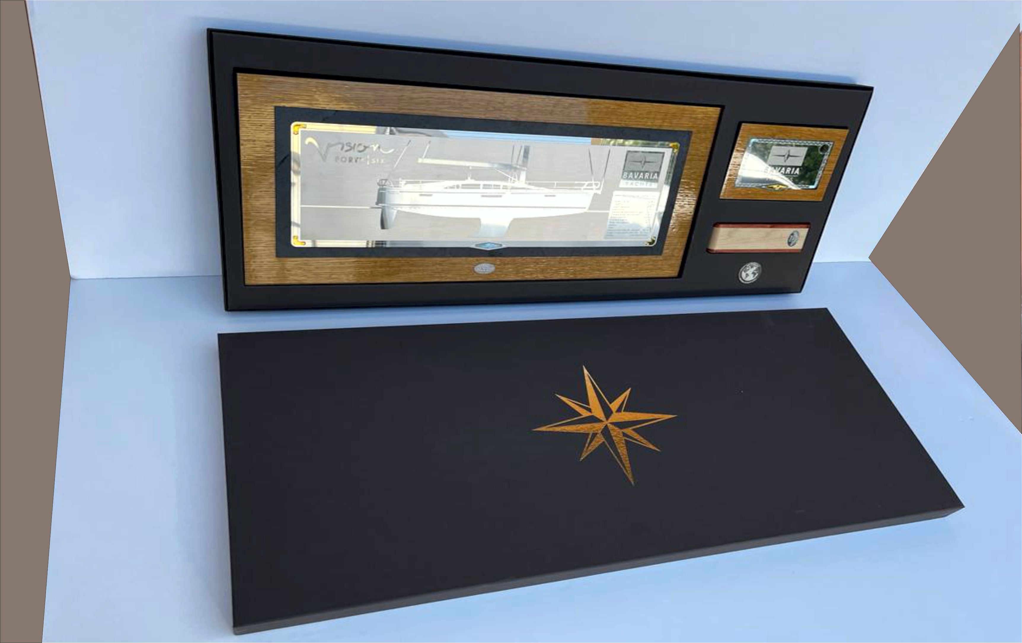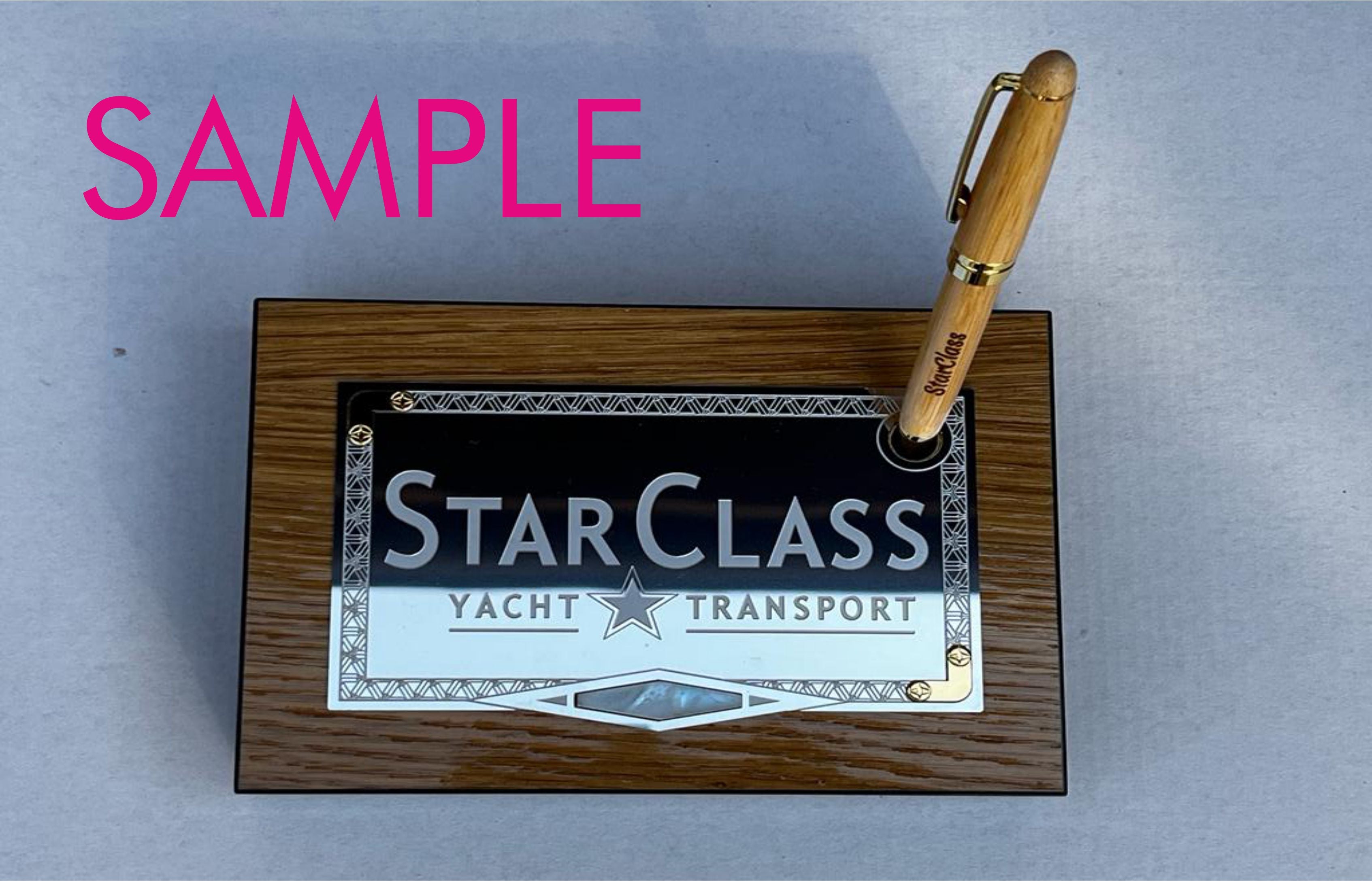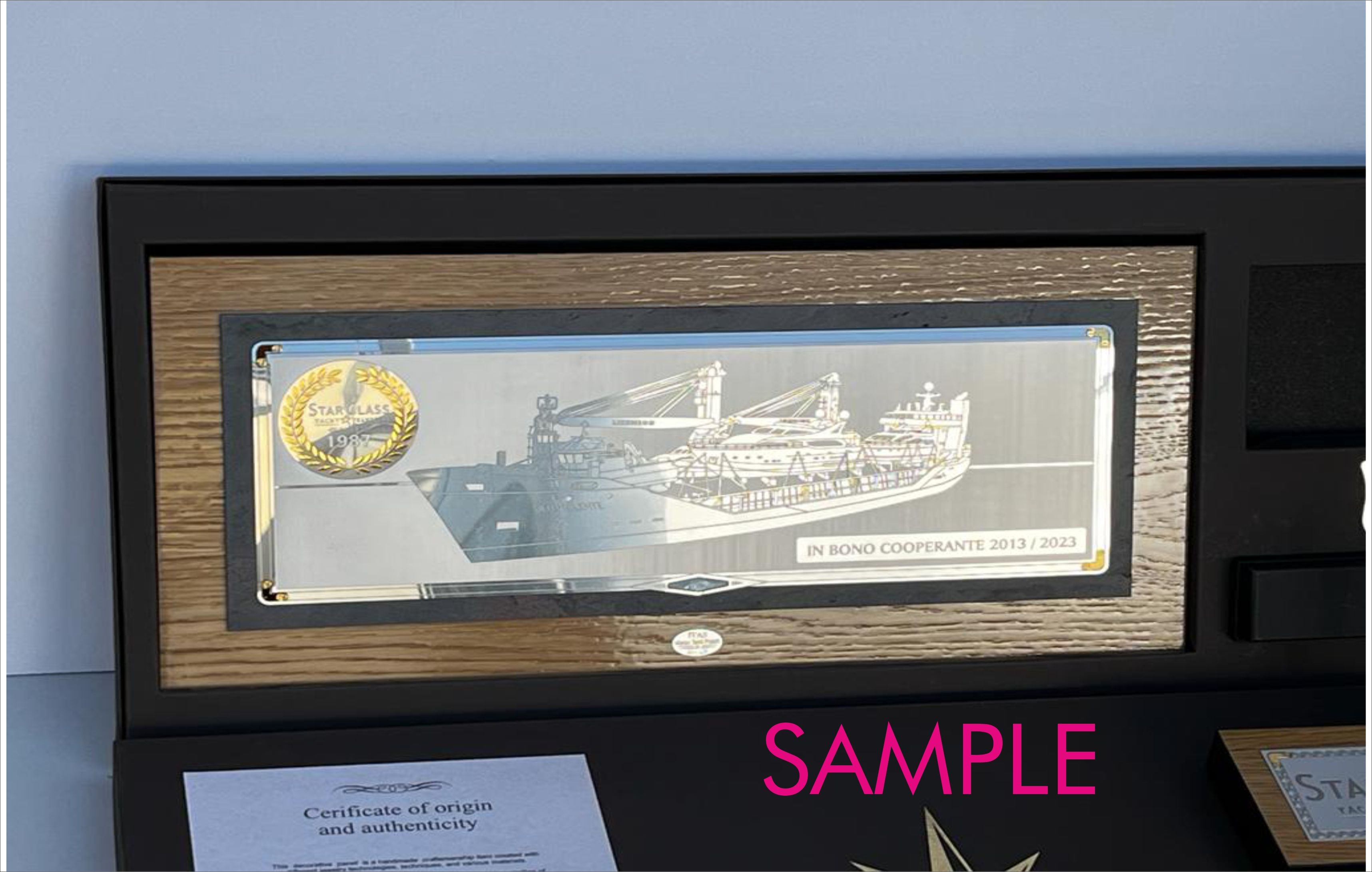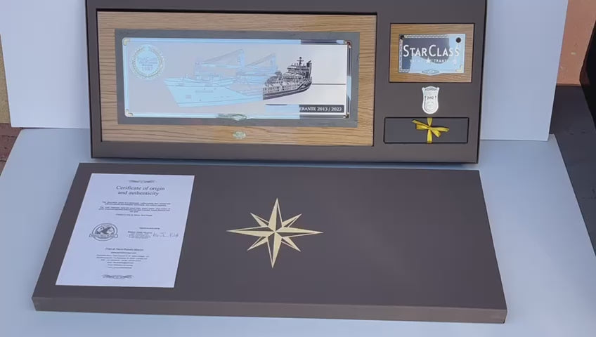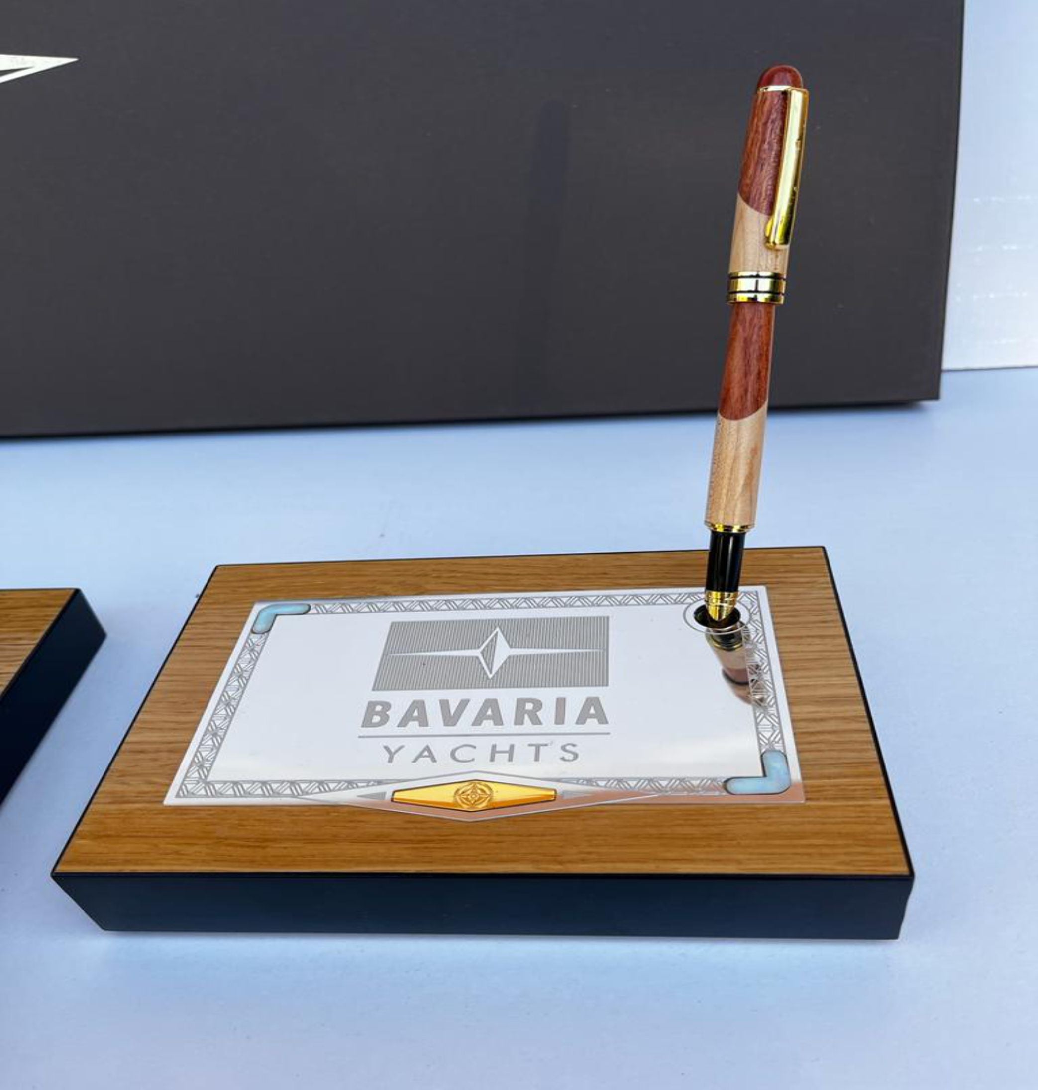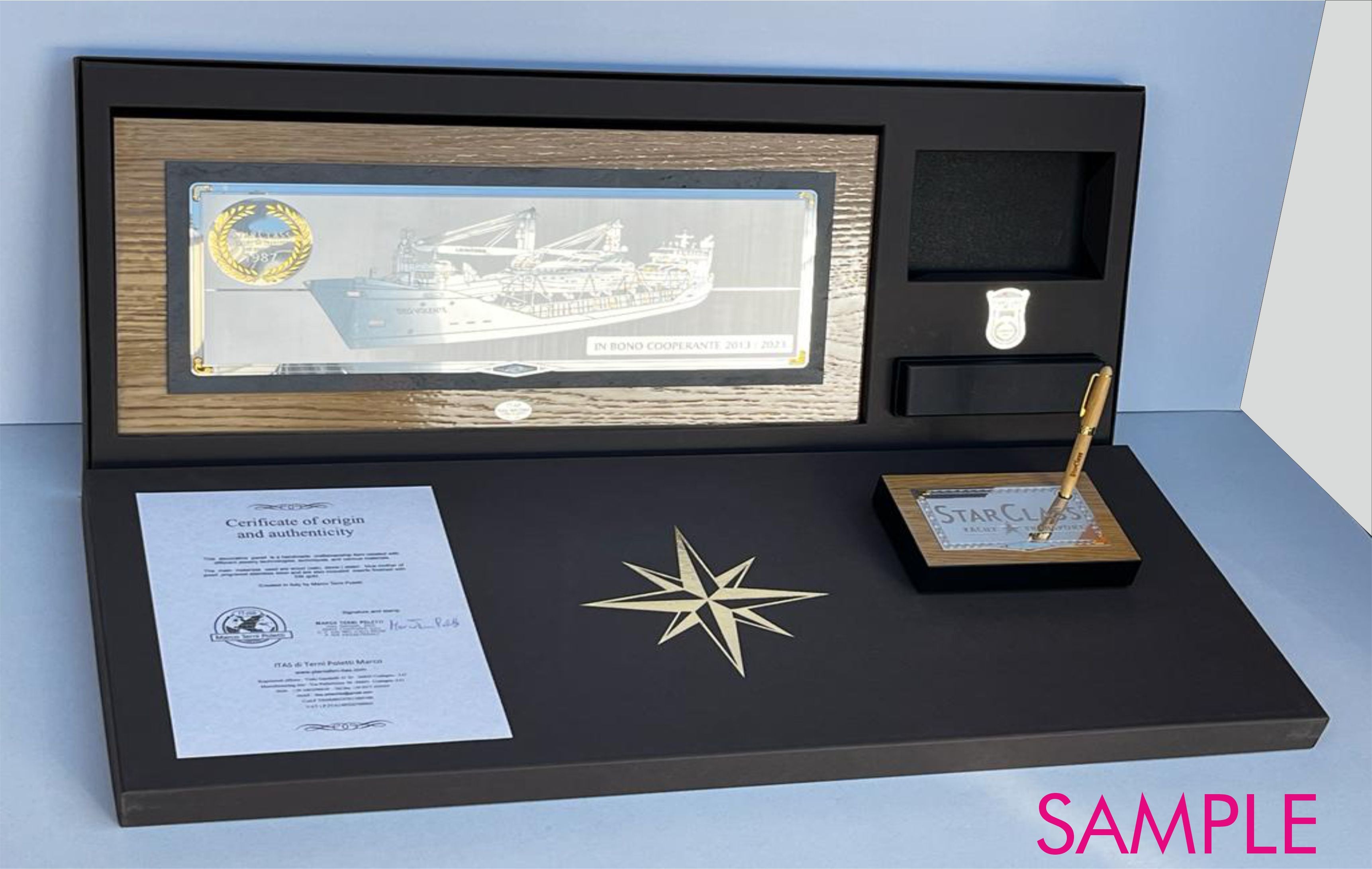 A beautiful set including the artistic metal replica and a pen holder made with engraved stainless steel and 4 corner details with 24k gold finishes. Mother of pearl and engraved metals fixed on genuine slate and wood to obtain an exclusive and pertinent decor dedicated to your boat.