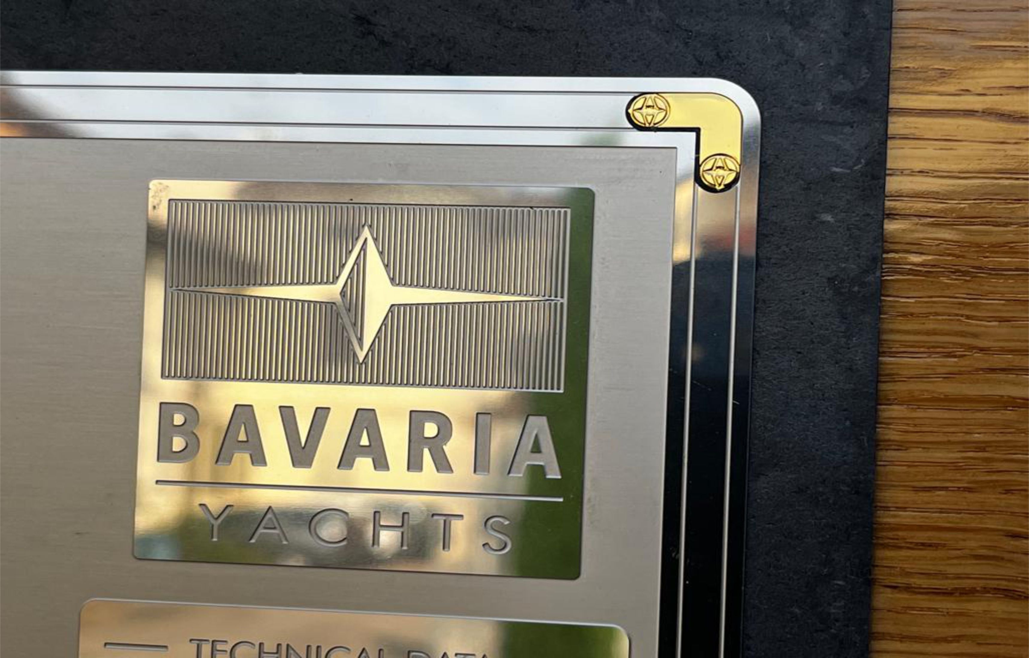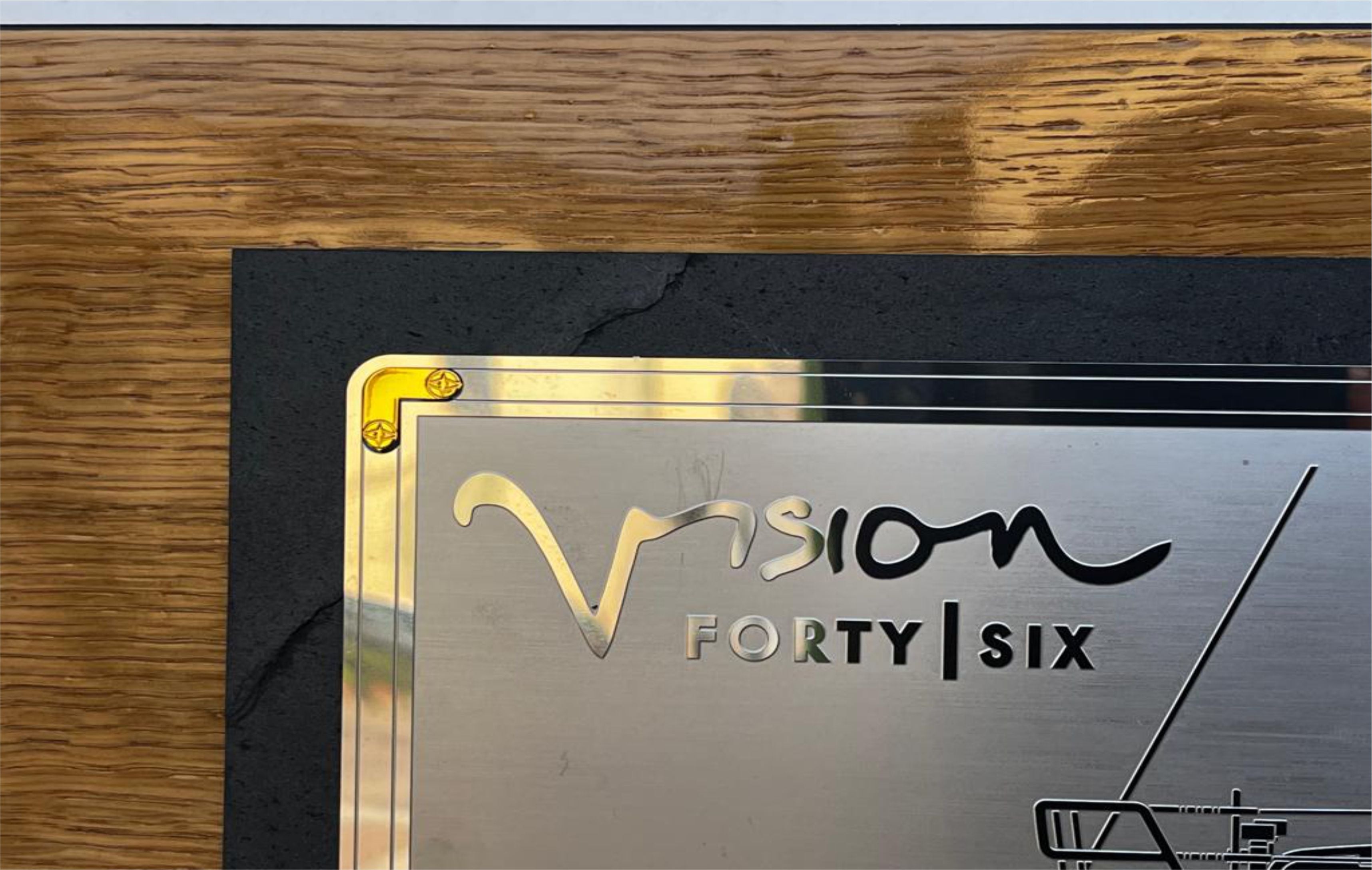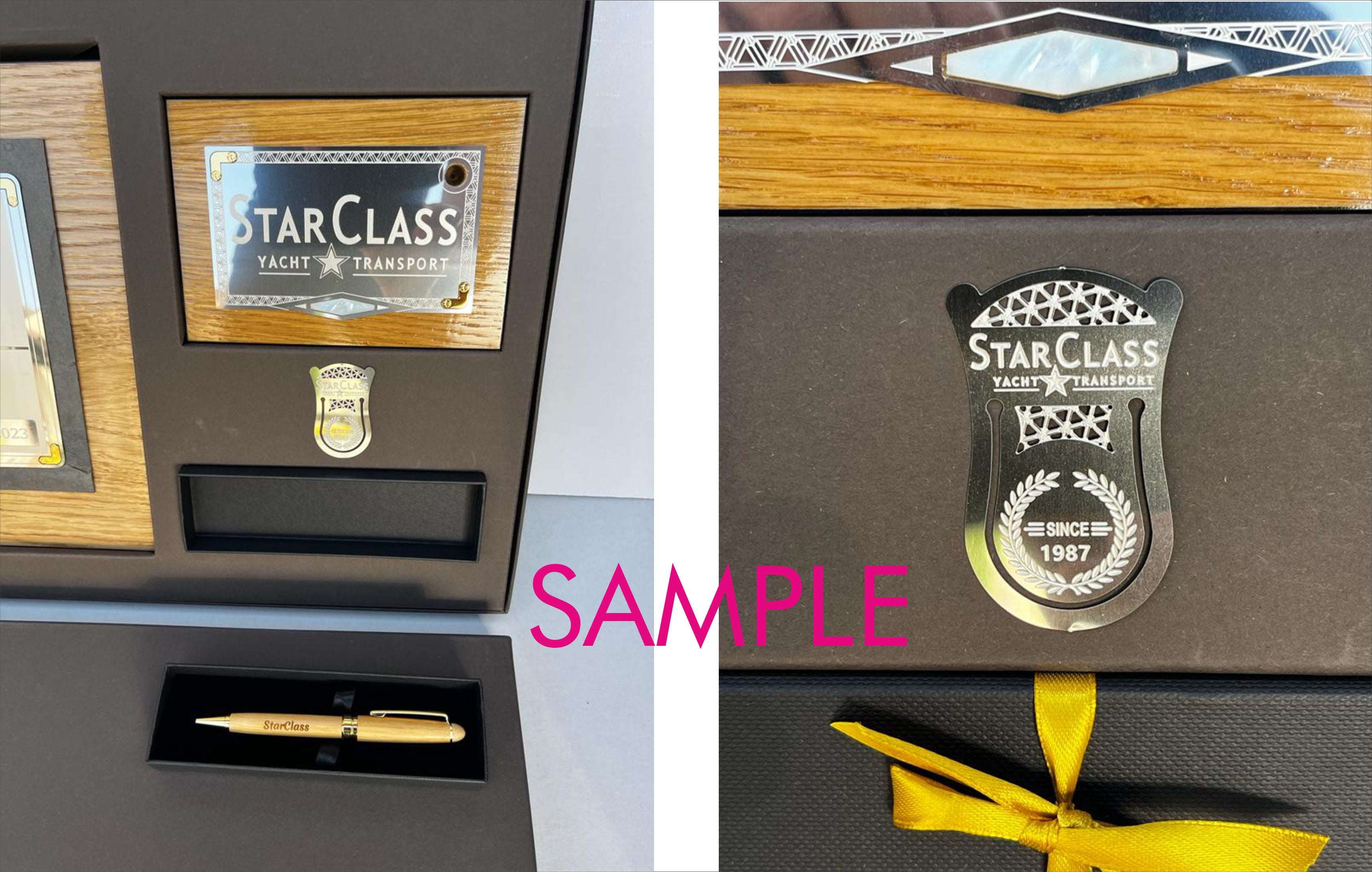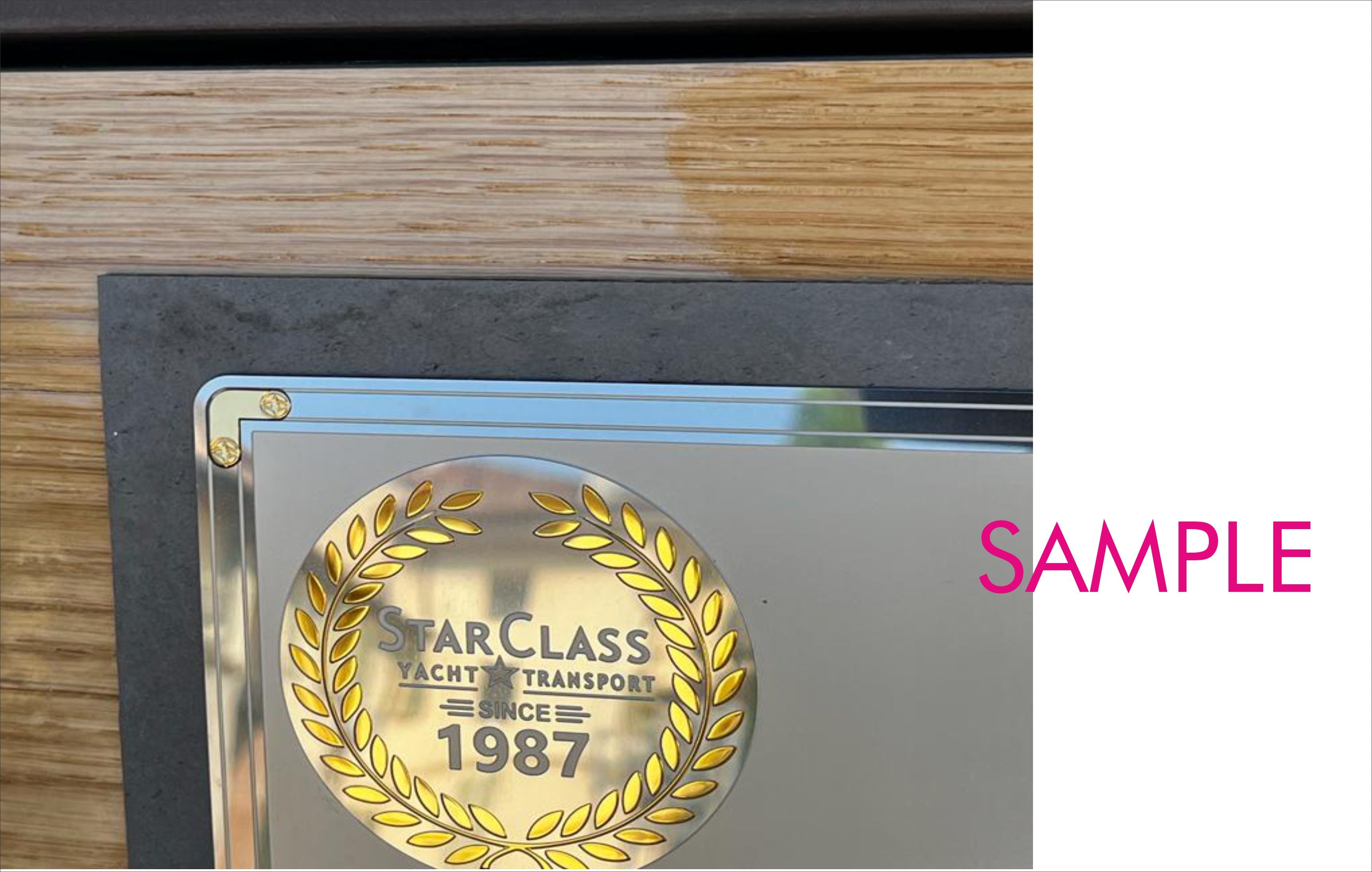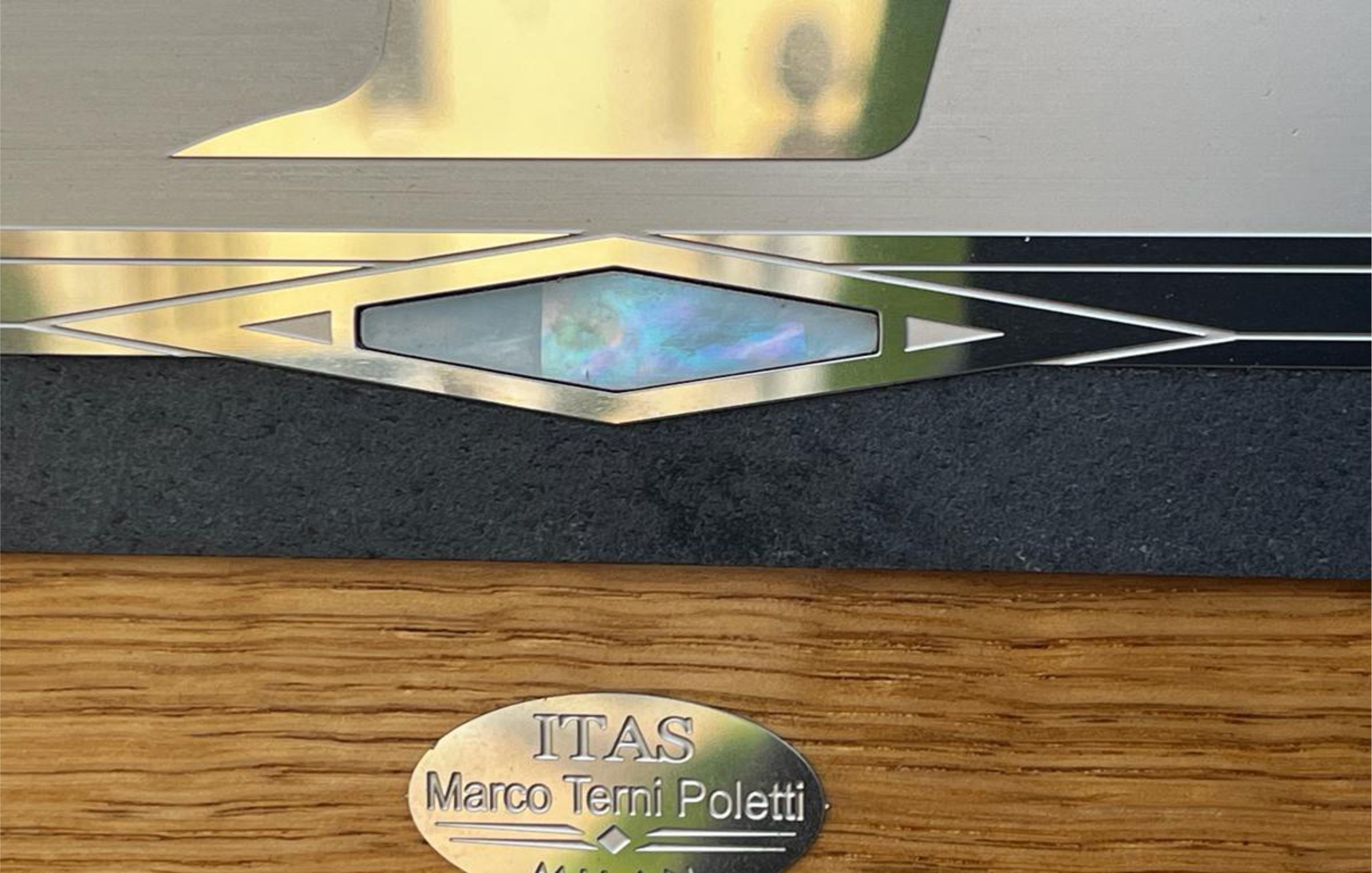 A beautiful set including the artistic metal replica and a pen holder made with engraved stainless steel and 4 corner details with 24k gold finishes. Mother of pearl and engraved metals fixed on genuine slate and wood to obtain an exclusive and pertinent decor dedicated to your boat.