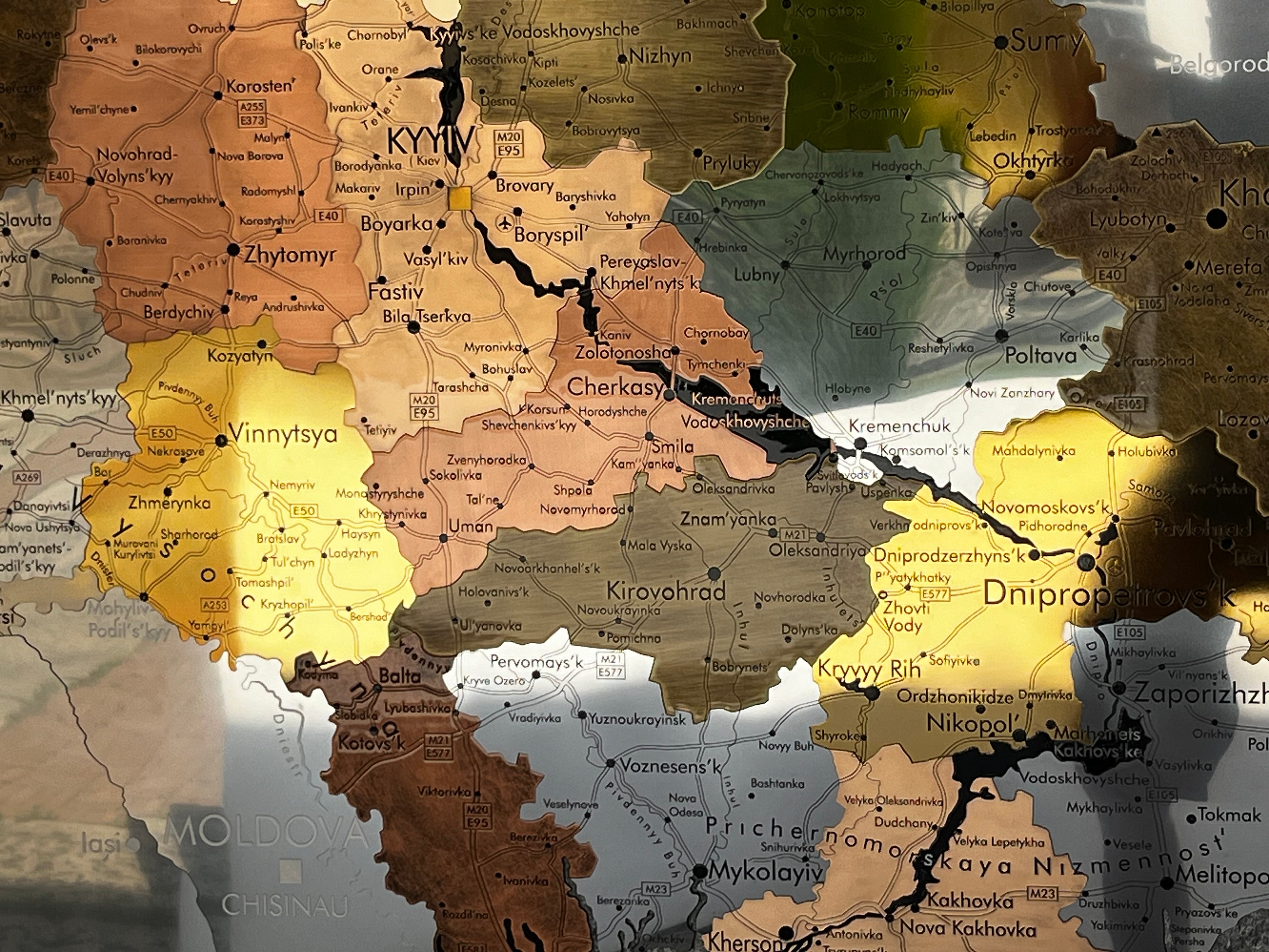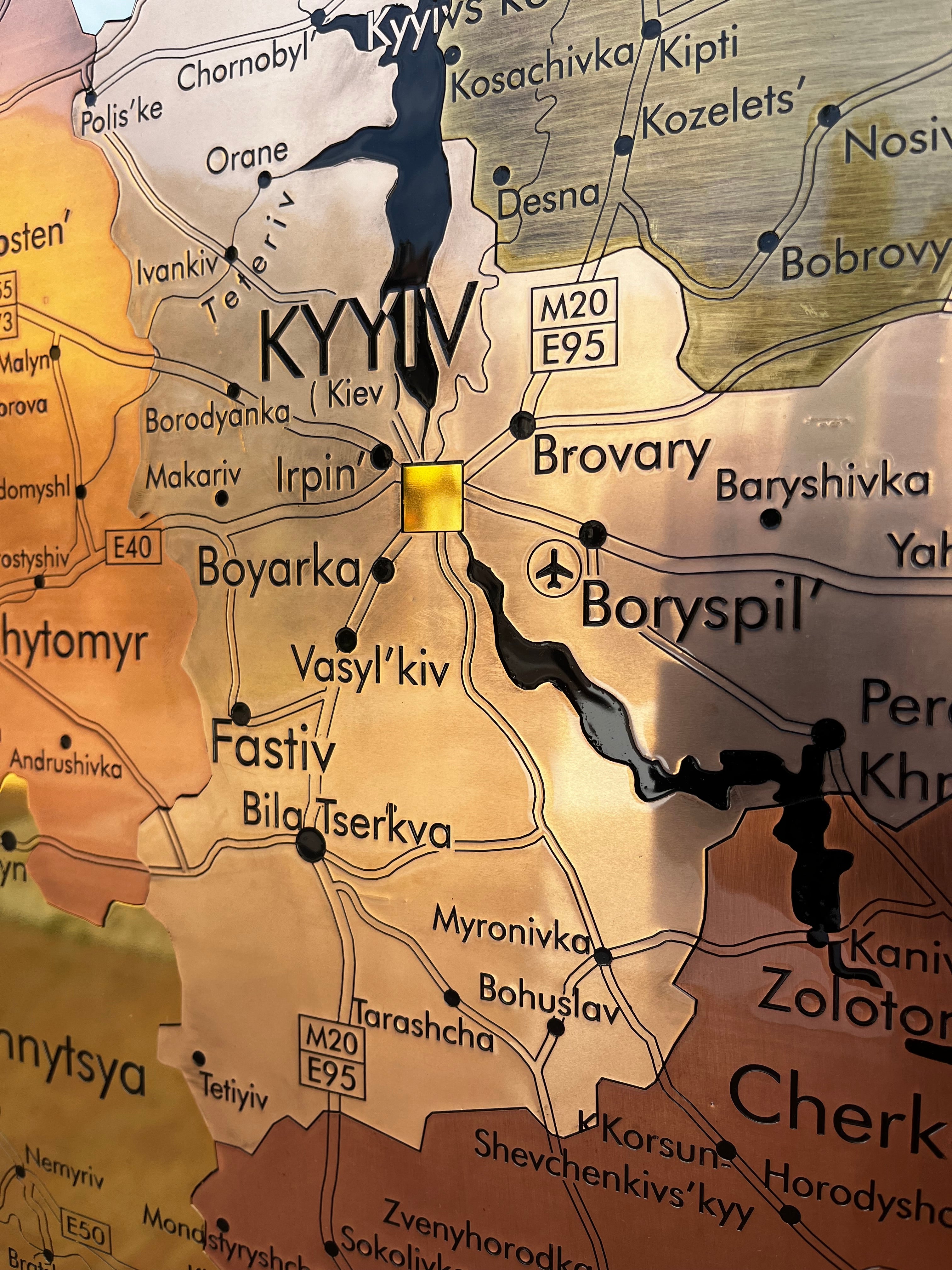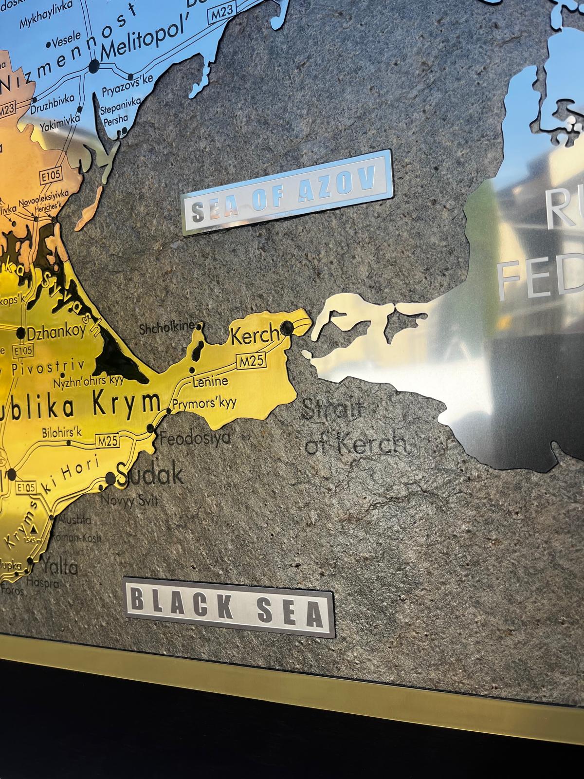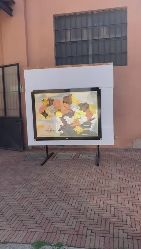 The metals used are; bronze, copper, stainless steel, brass, aluminum and 24k gold. The metal inserts are engraved in bas-relief then brushed, enameled and fixed by hand one by one transforming it into a wonderful metal mosaic on a gray stone background. This panel is made of more than 100 different pieces of metal with more than 800 engraved and enameled writings by hand. All the engraved writings indicate the most important cities, villages, highways, airports, rivers, mountains, etc. Each region is a different piece in different metal and is mounted on a sheet of real gray slate.