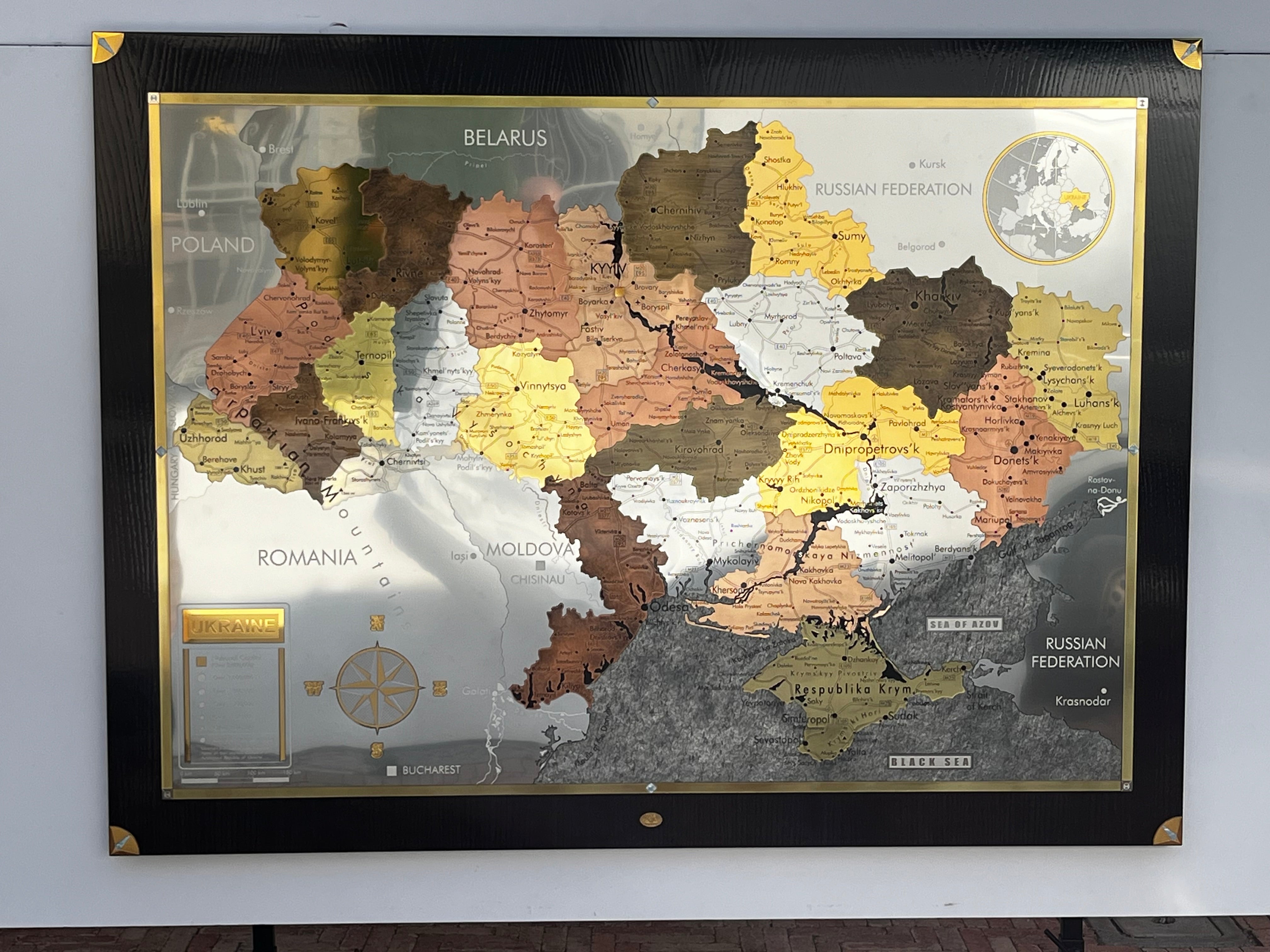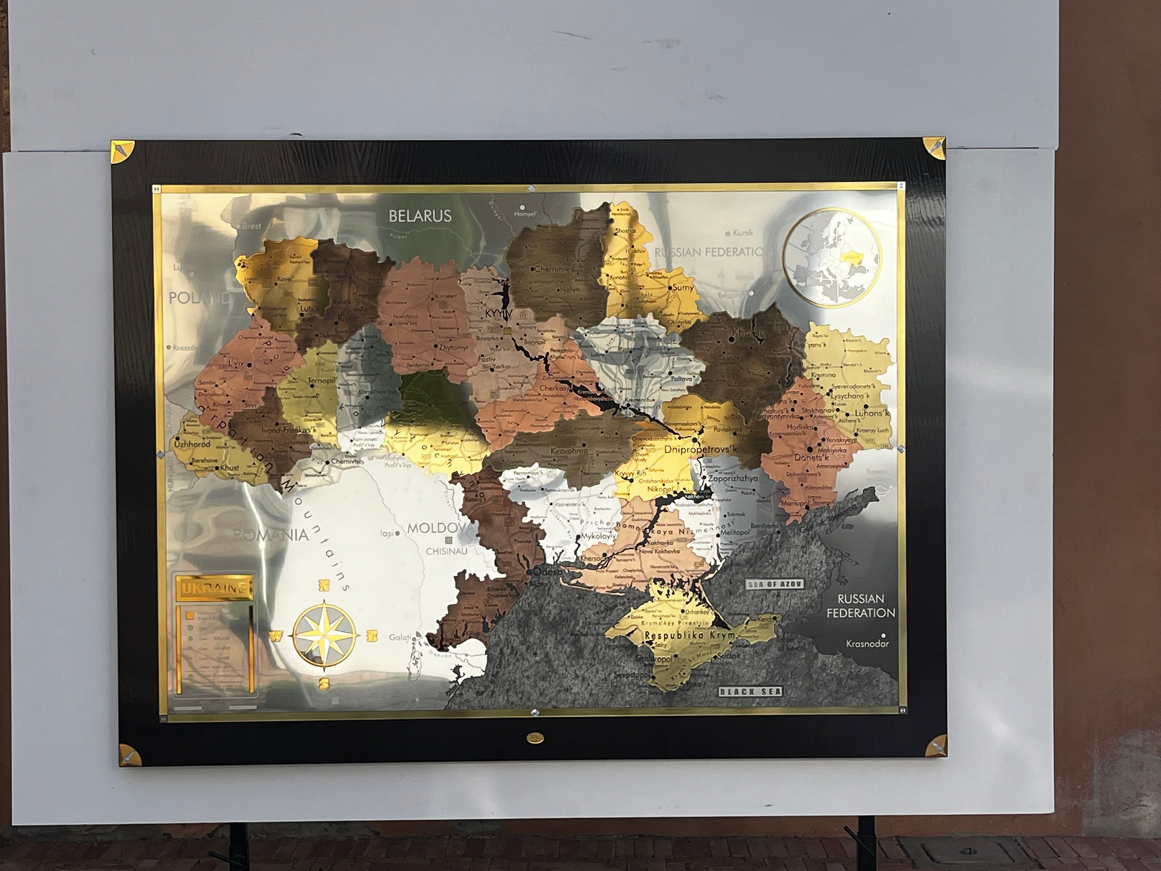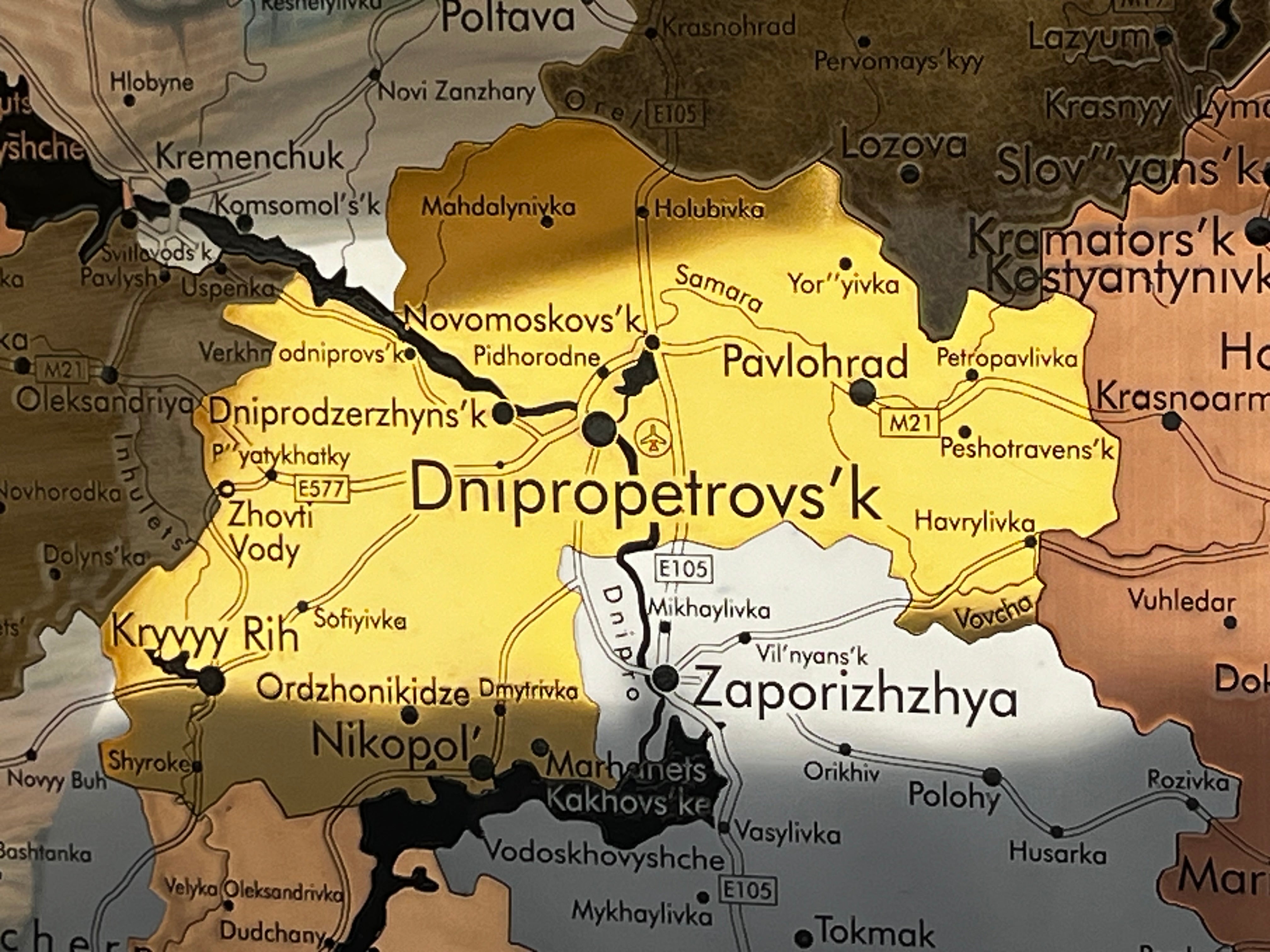 The metals used are; bronze, copper, stainless steel, brass, aluminum and 24k gold. The metal inserts are engraved in bas-relief then brushed, enameled and fixed by hand one by one transforming it into a wonderful metal mosaic on a gray stone background. This panel is made of more than 100 different pieces of metal with more than 800 engraved and enameled writings by hand. All the engraved writings indicate the most important cities, villages, highways, airports, rivers, mountains, etc. Each region is a different piece in different metal and is mounted on a sheet of real gray slate.