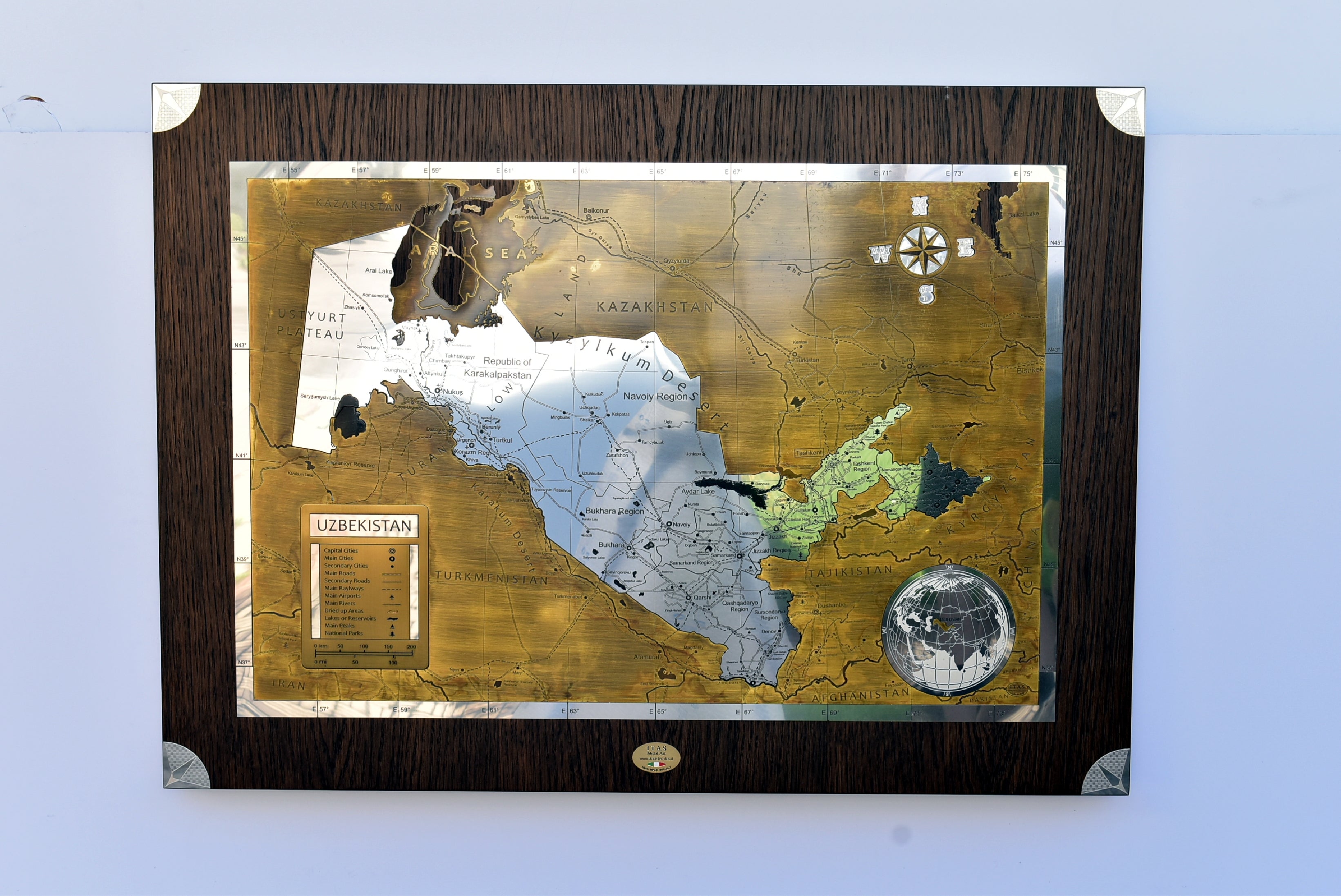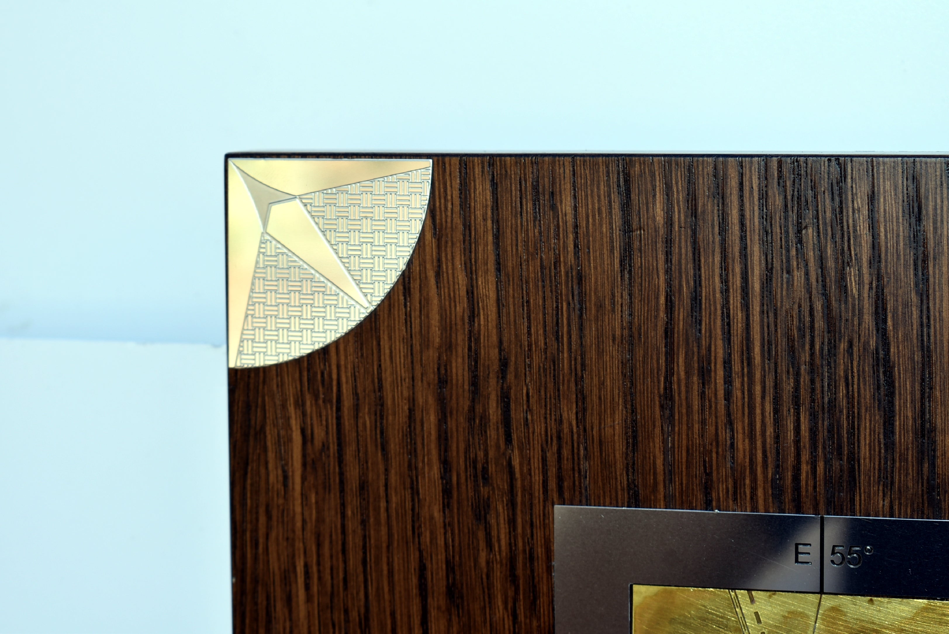 In our work, the metals are in natural finishing, and the mother of pearl-like the stone and the wood is totally genuine. Also, the varnishes used are on a water base. This art panel is realized with one bronze sheet and different steel inserts, fully engraved in low relief after that is painted by hand inside the engravings.