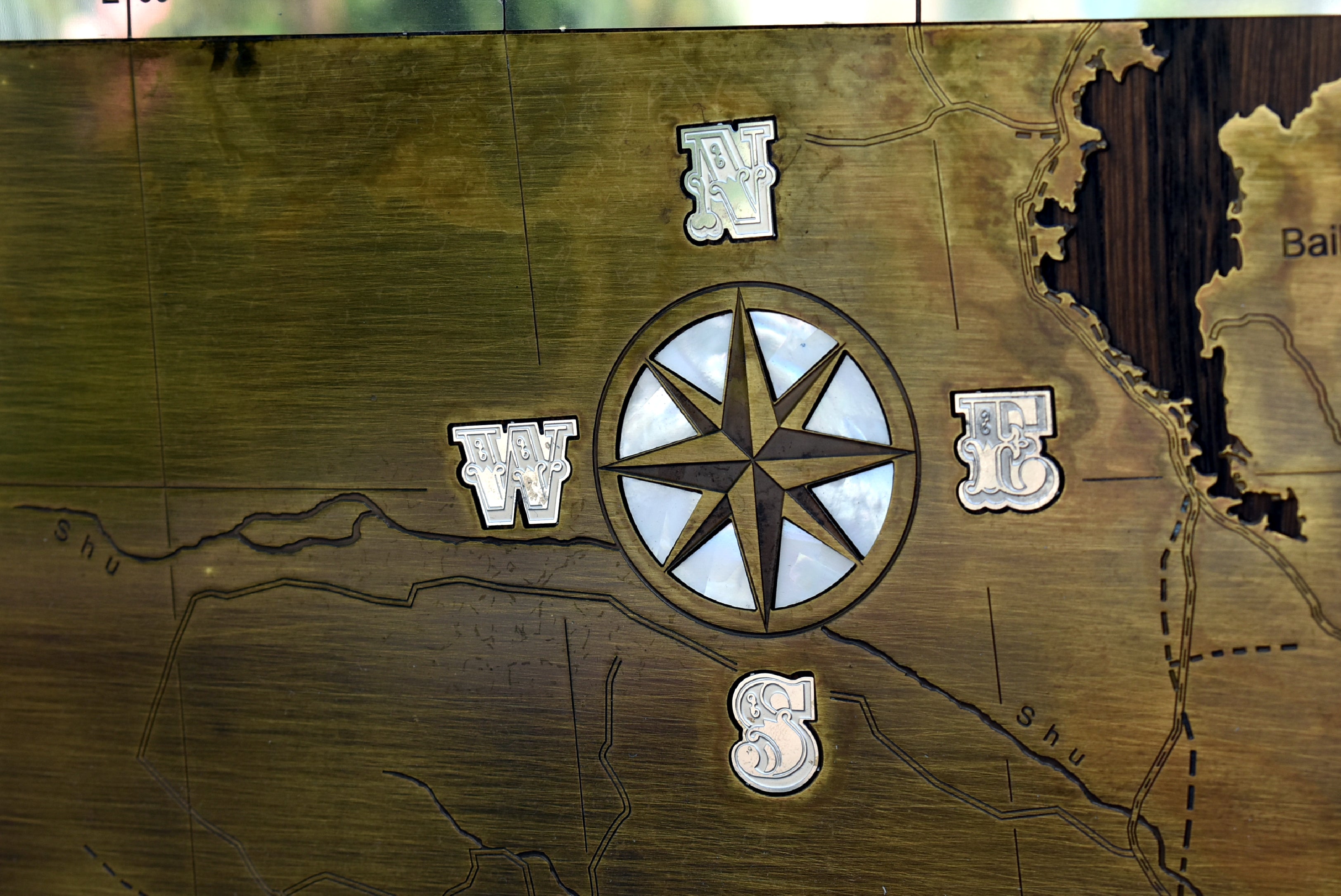 Antiqued with citric acid, brushed by hand, and furthermore coated with transparent varnish it contains more than 300 writes engraved and enameled one by one by hand. The panel is inlaid with other stainless steel inserts ( frame, corners, summary, cardinal points, etc) all engraved and hand-polished. Other 8 inserts made with genuine mothers of pearl inlay in the compass rose. Overall all metals worked are fixed on an oak panel painted wengè.
