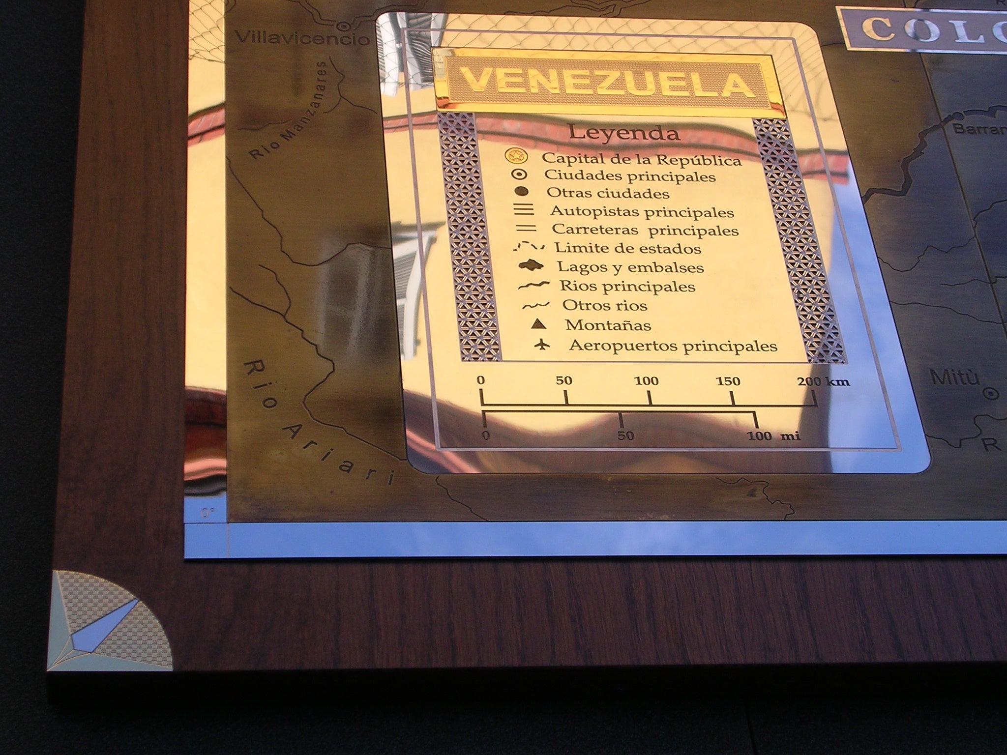 This panel is made with more than 80 different large metal pieces with more than 600 engraved writings glazed by hand. All the engraved writings indicate the most important cities, railroads, highways, airports, lakes, rivers, mountains, etc.  All metals are mounted on a sheet of genuine pink stone named '' quartzite''.  The stone is contoured, varnished, and digitally printed in the names of the islands, seas, etc. Overall metals fixed on the stone are then fixed on an oak base panel varnished walnut color and polished by hand with wax.