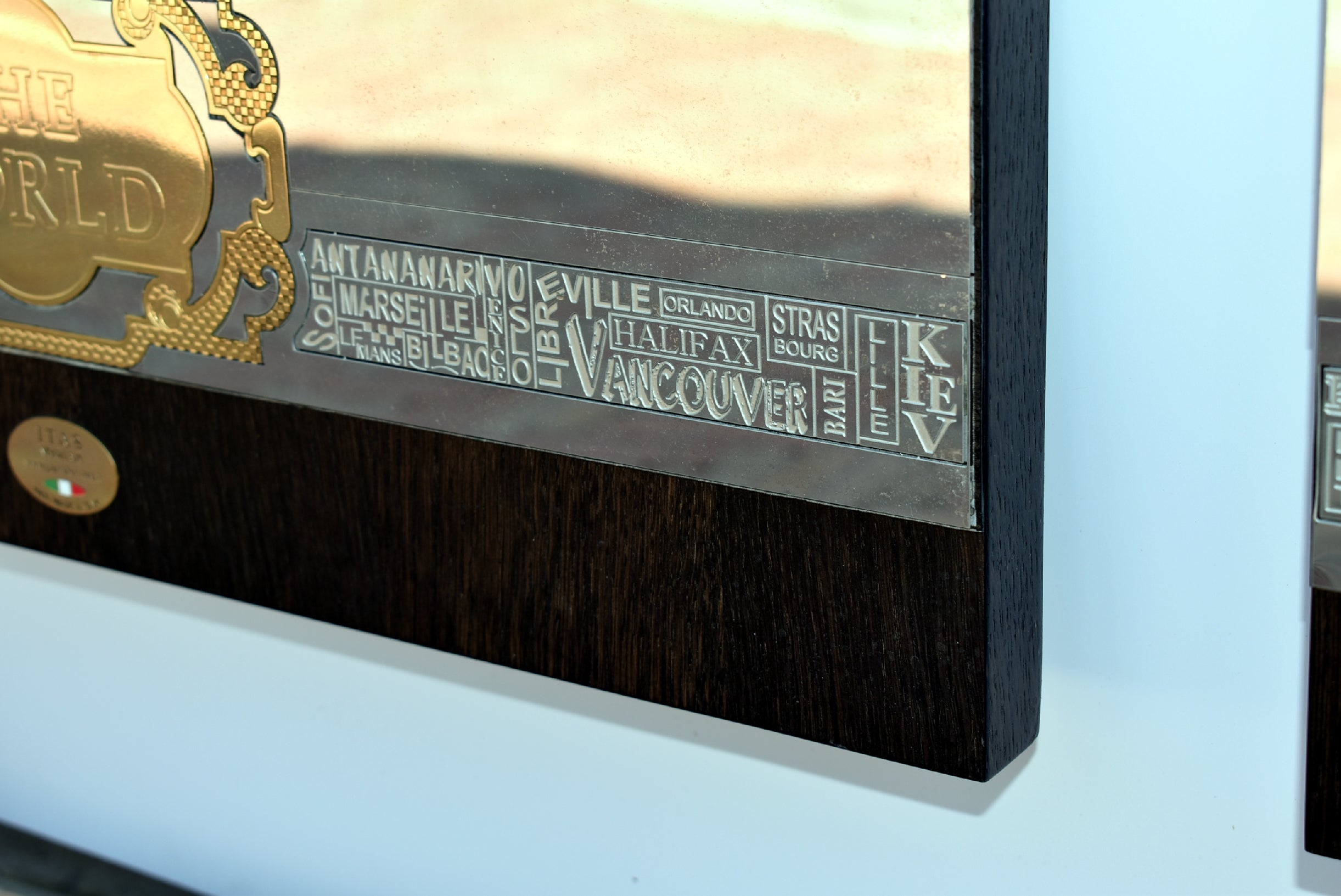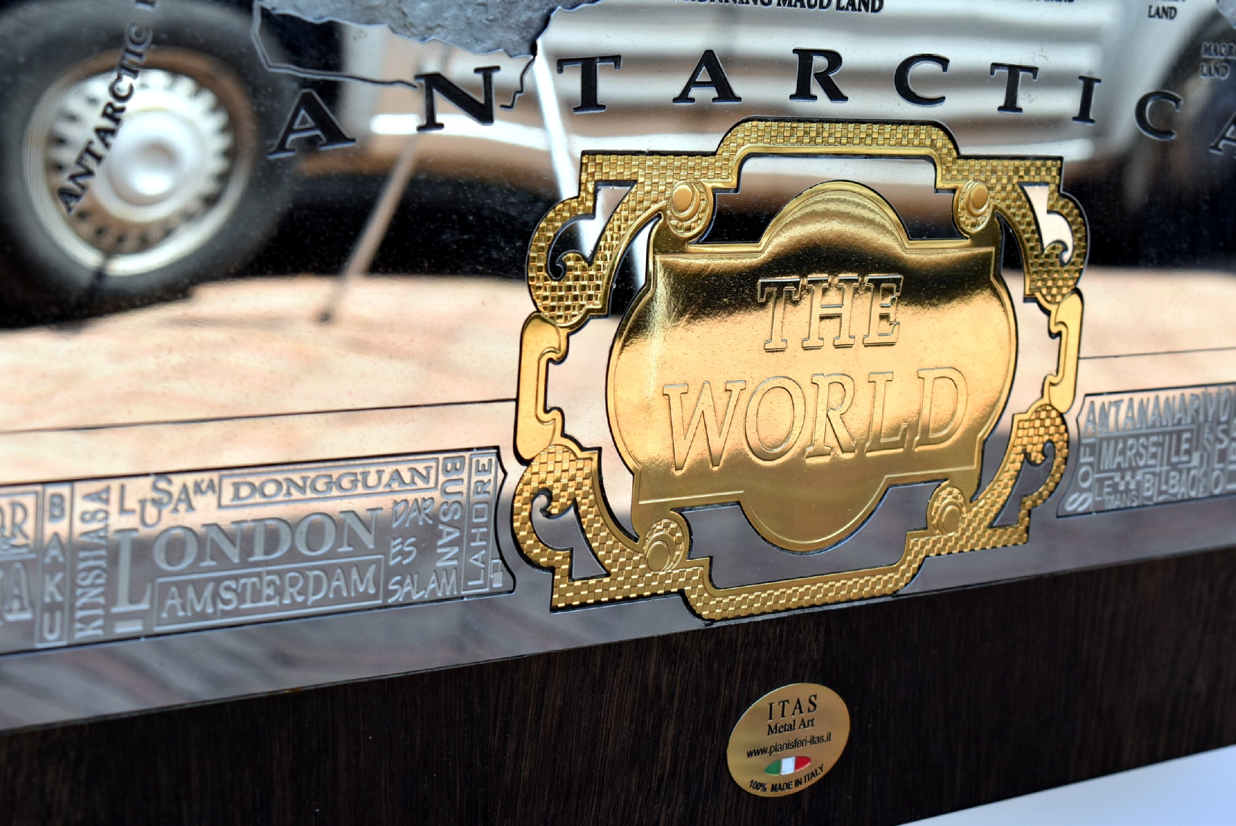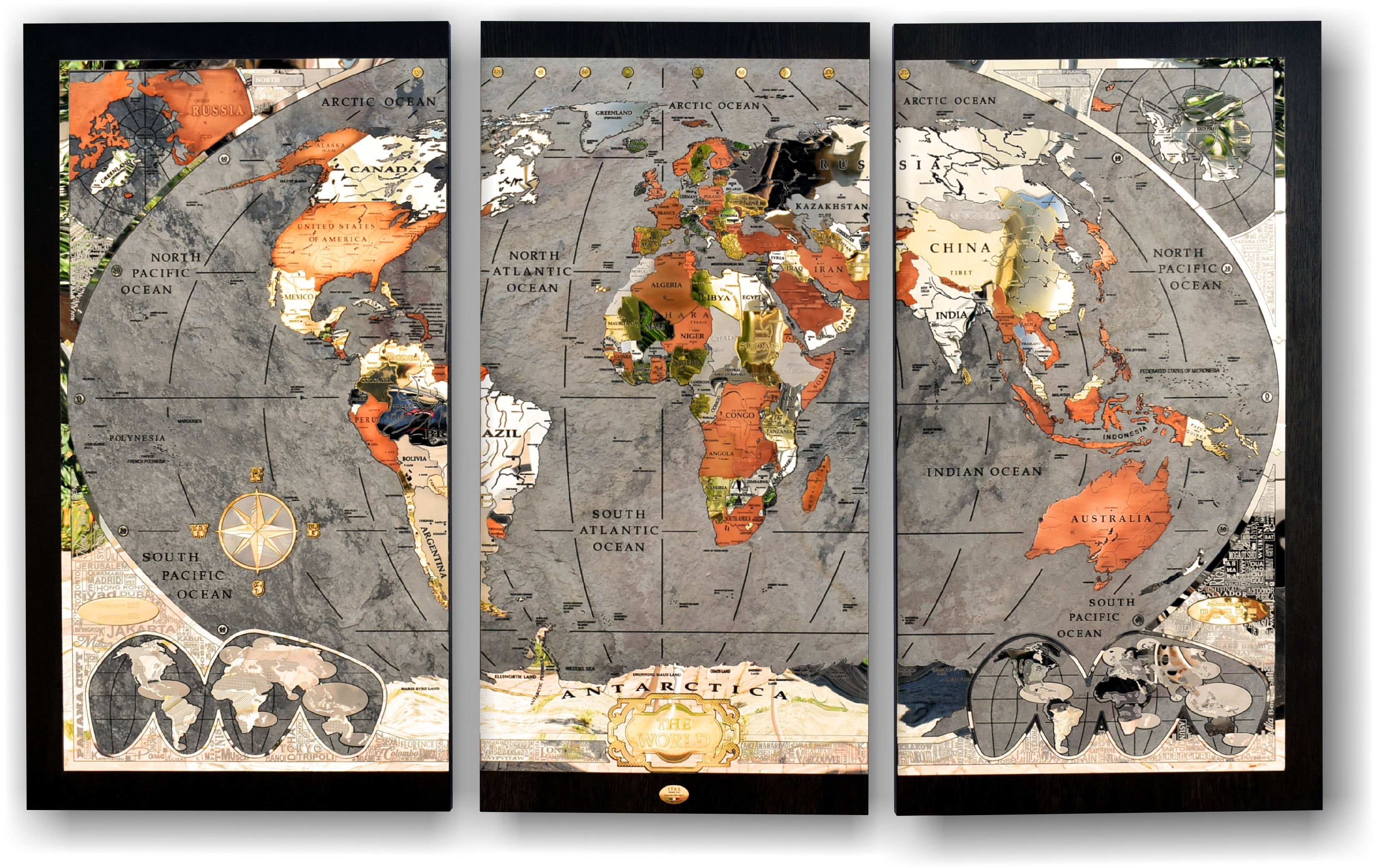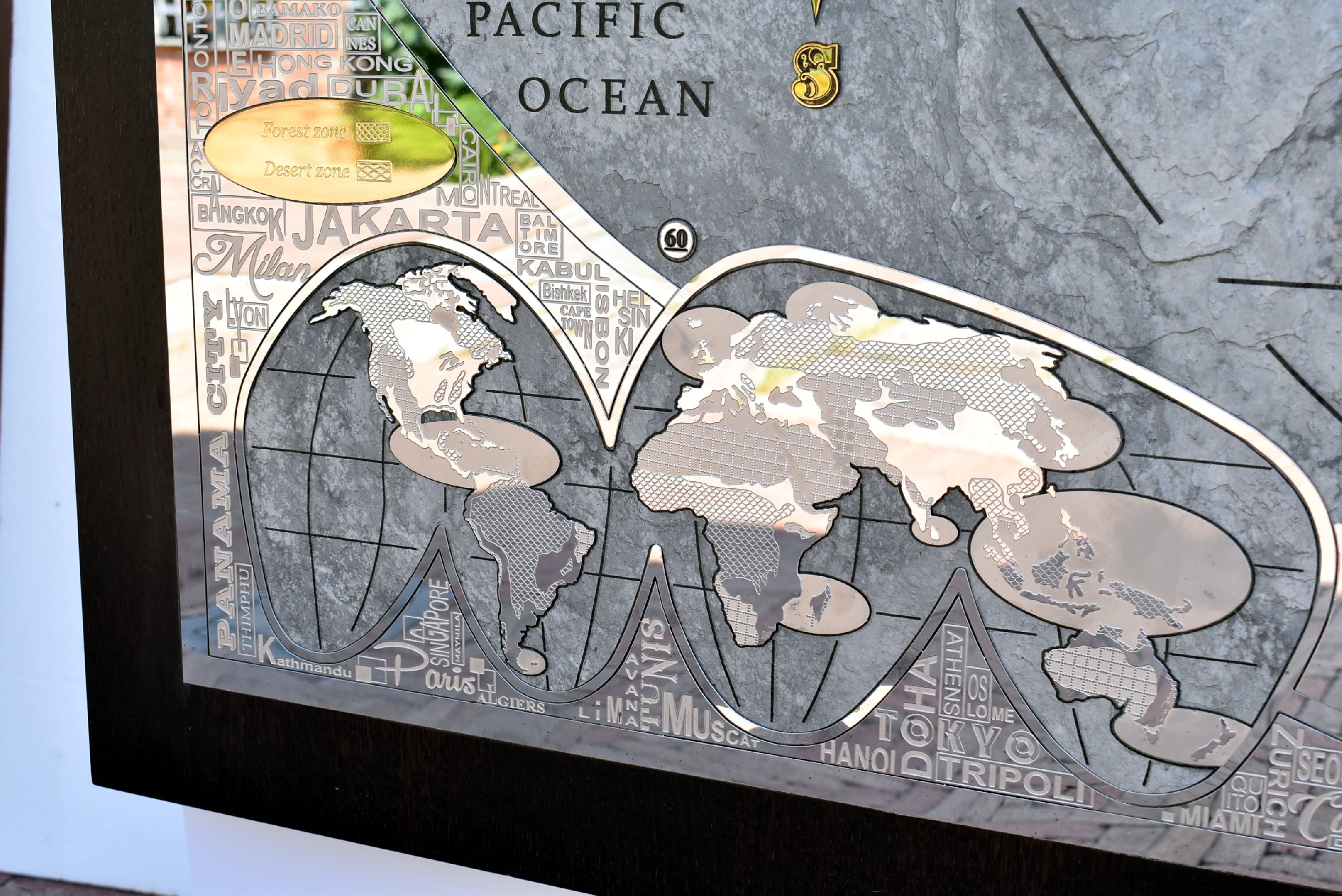 The perimetral frame is made with stainless steel engraved and many names of the most important cities of the world are present. The frame includes also 2 small metal world maps that show forest zones and the most populated areas of the world. The most metal inserts made with brass are 24k gold finished.