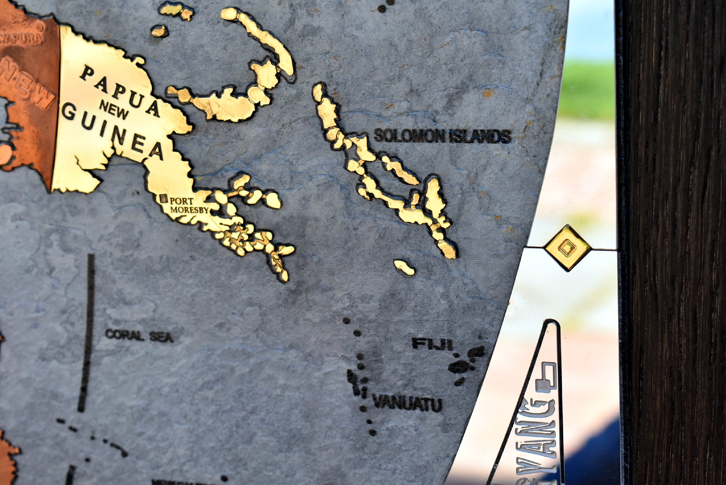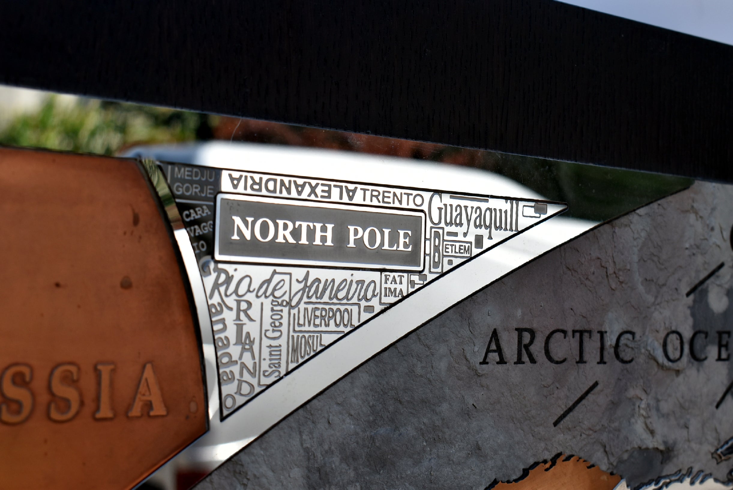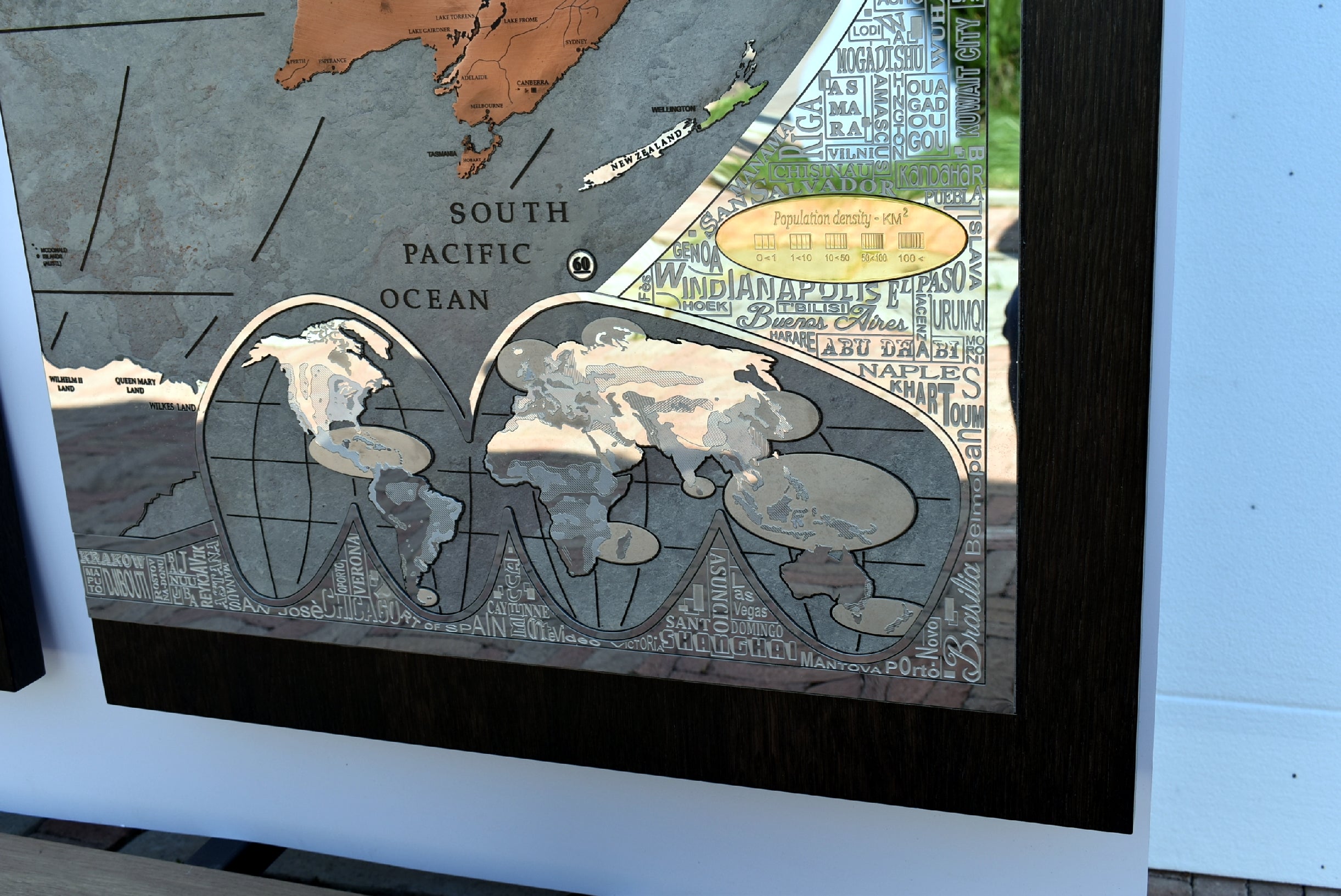 The perimetral frame is made with stainless steel engraved and many names of the most important cities of the world are present. The frame includes also 2 small metal world maps that show forest zones and the most populated areas of the world. The most metal inserts made with brass are 24k gold finished.