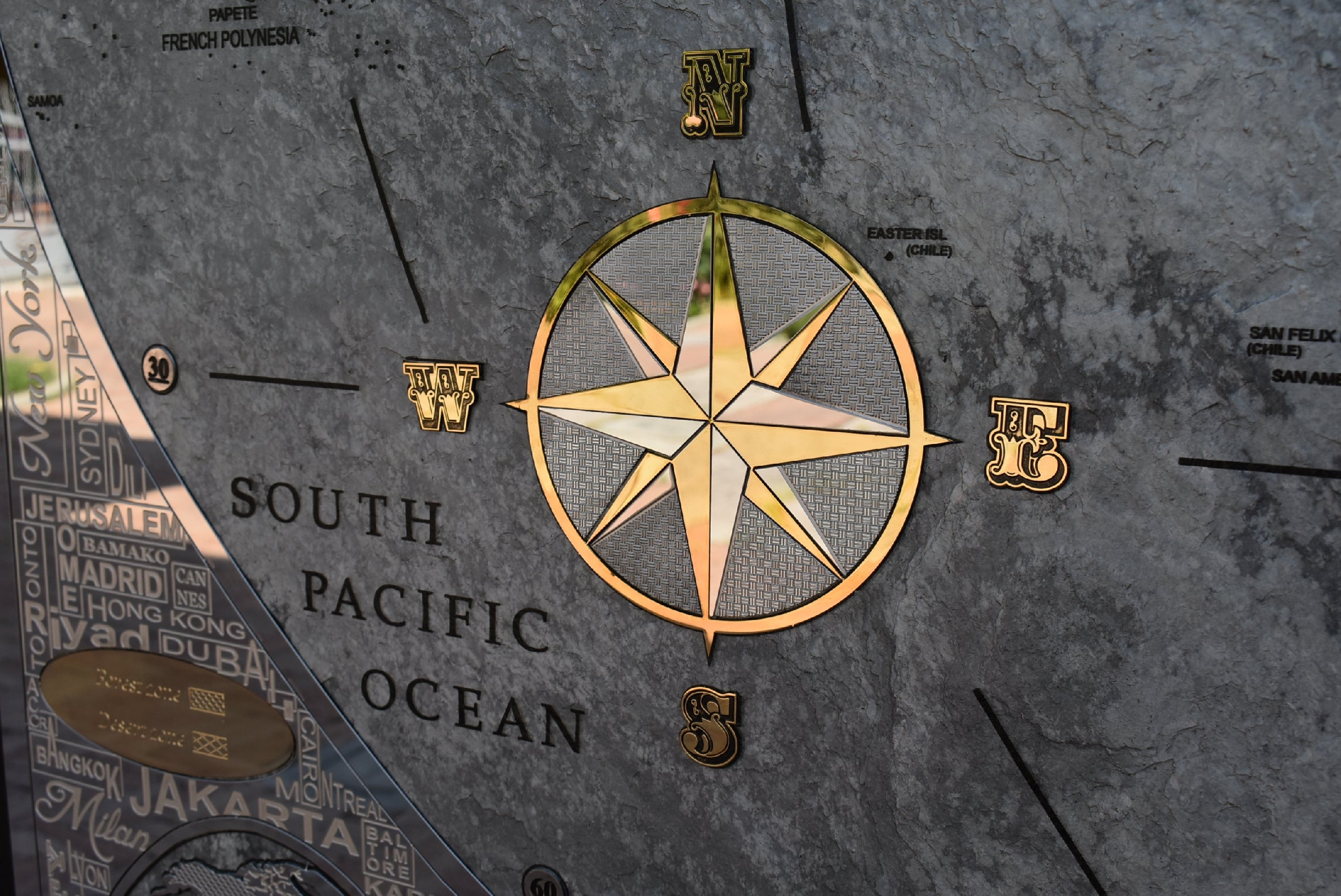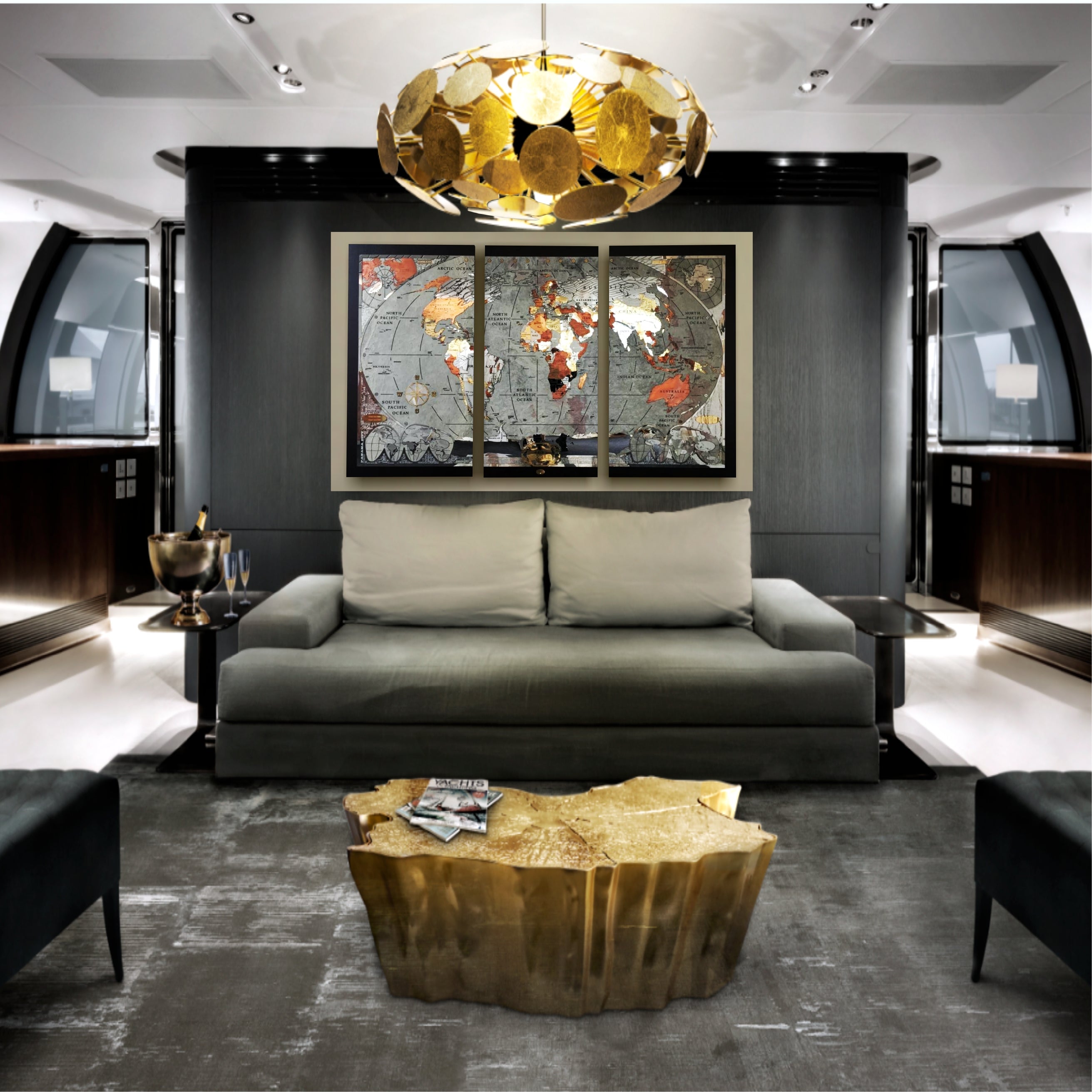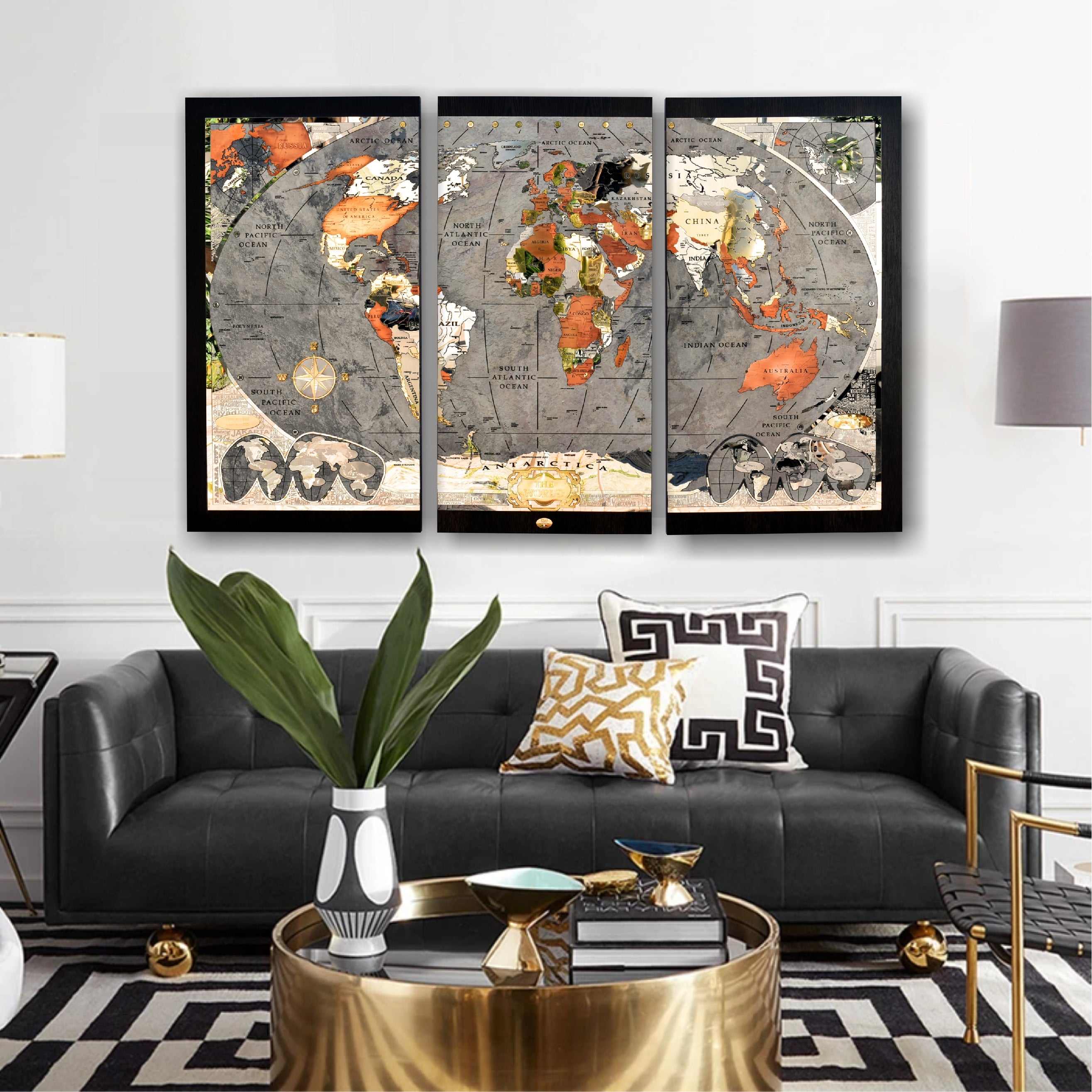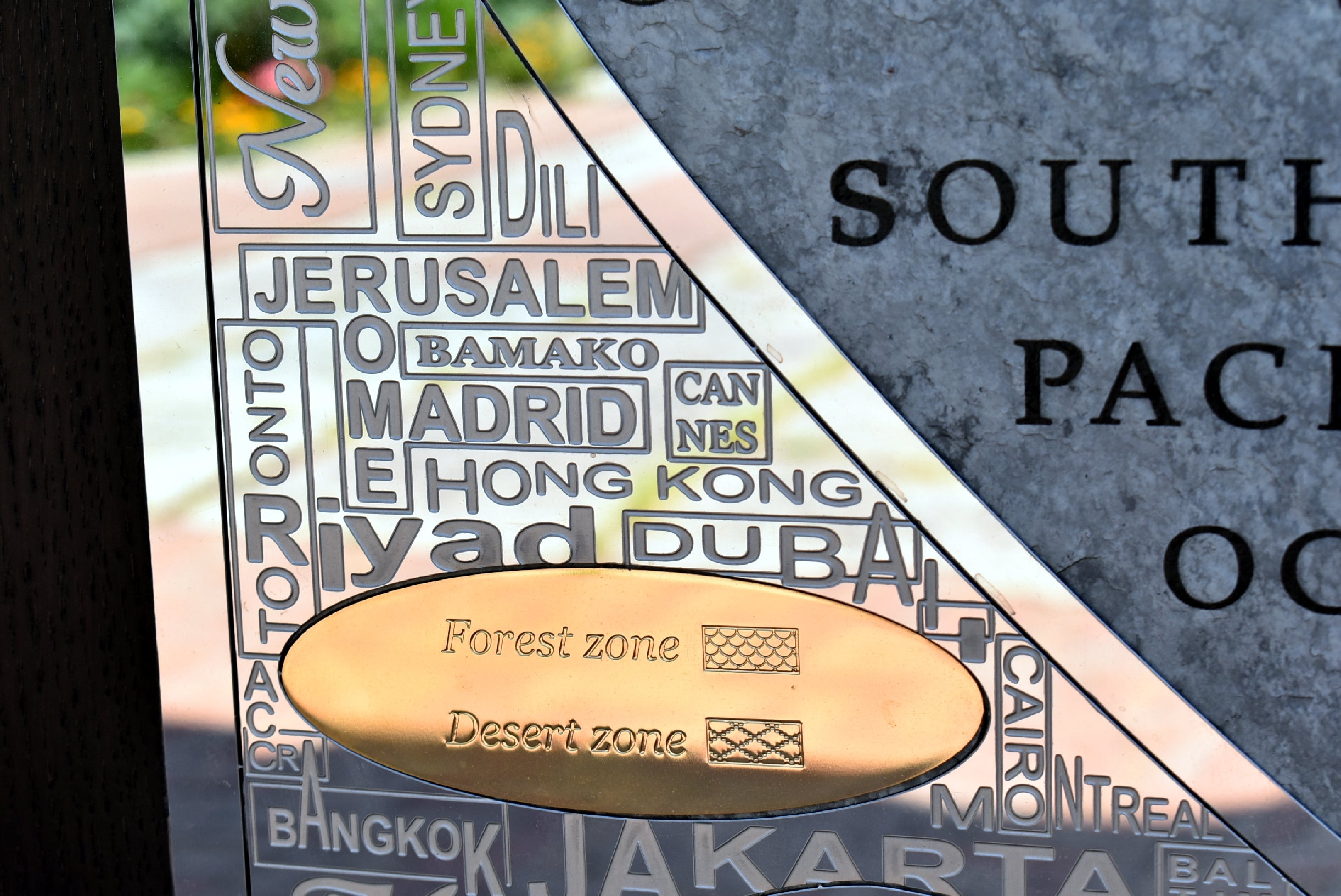 The perimetral frame is made with stainless steel engraved and many names of the most important cities of the world are present. The frame includes also 2 small metal world maps that show forest zones and the most populated areas of the world. The most metal inserts made with brass are 24k gold finished.