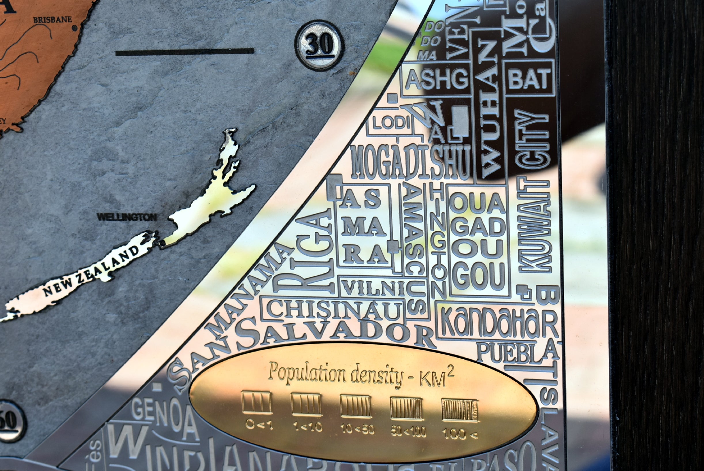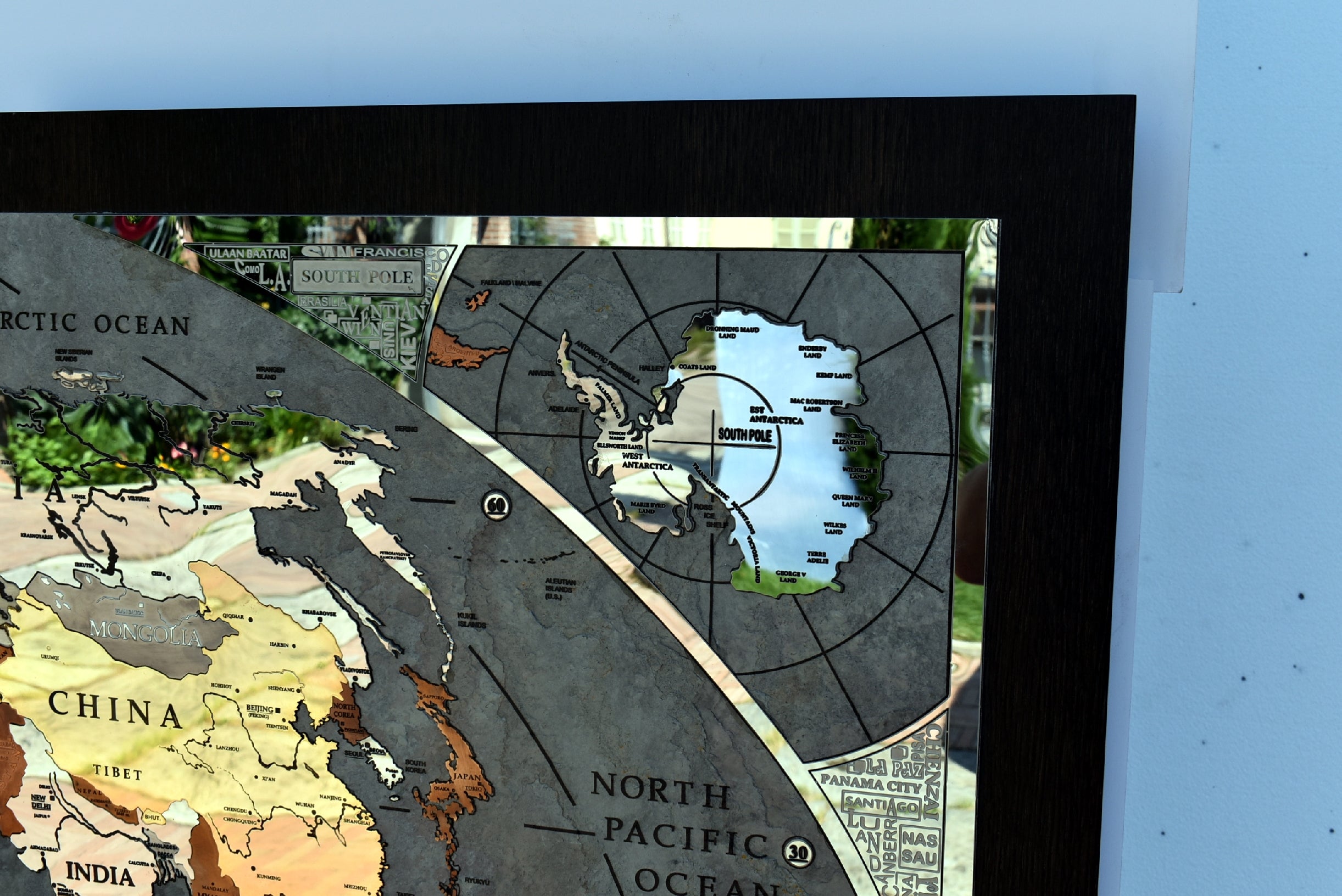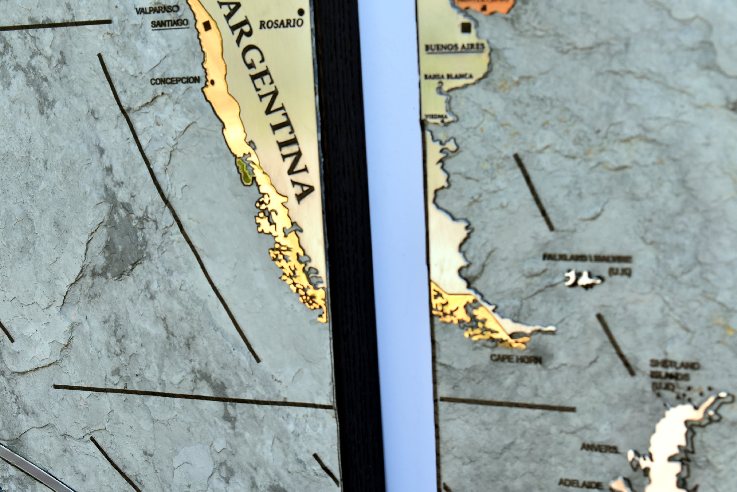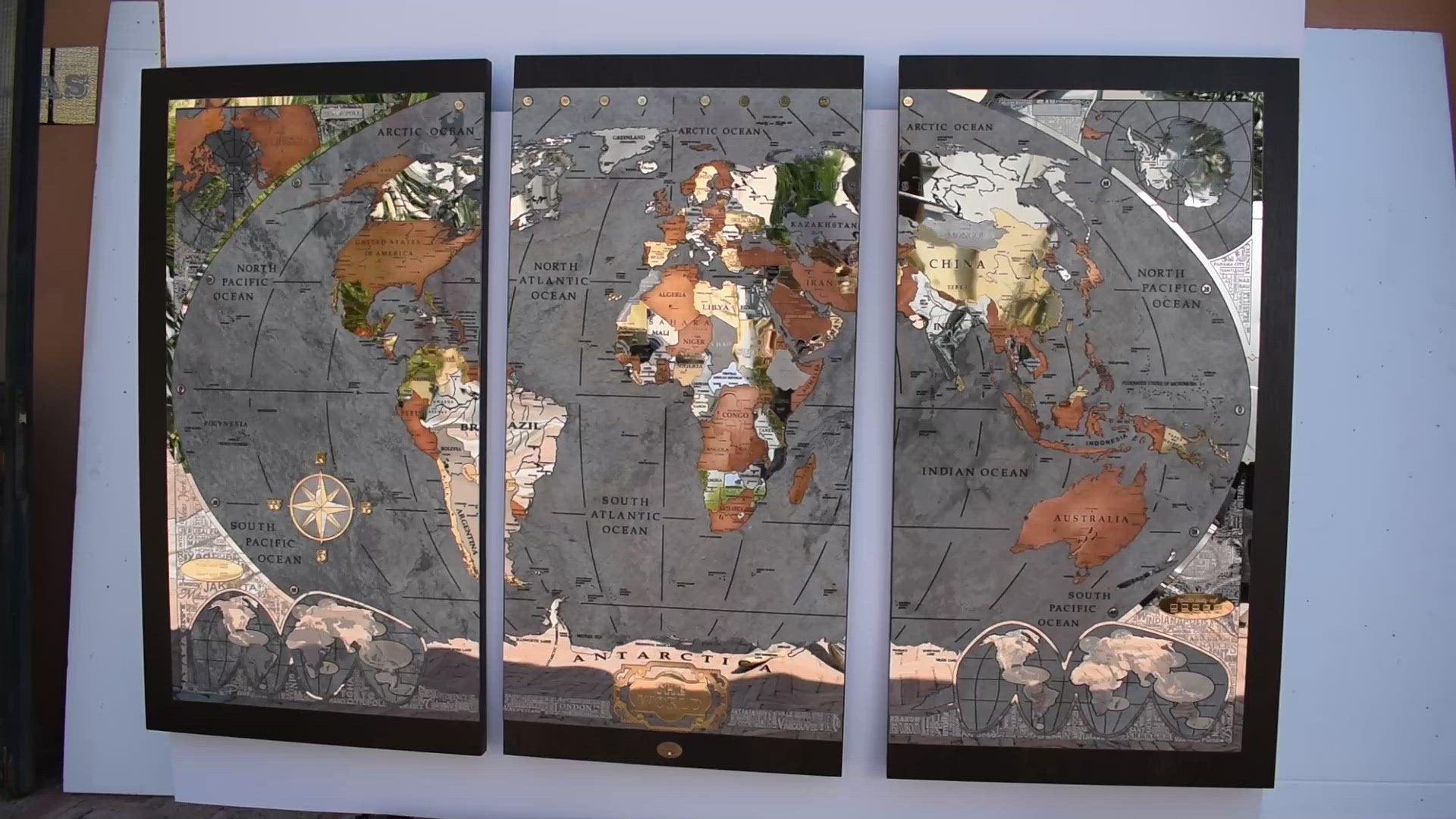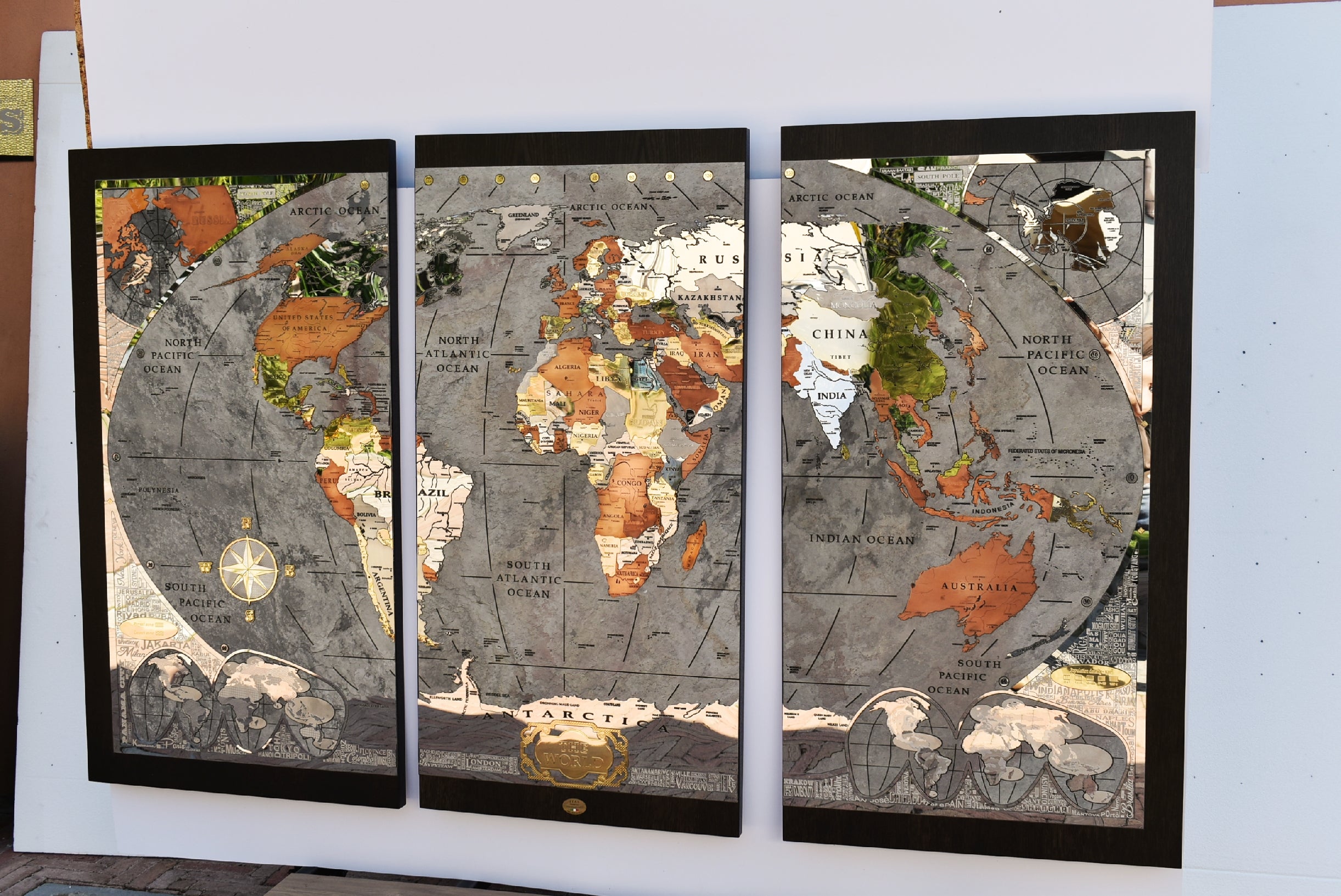 A good part of the around 500 metal inserts contains engraved writings, more than 400 writings are glazed by hand one by one inside engraving. Each nation is a different insert made with different metal as well as the most important islands and the poles too.