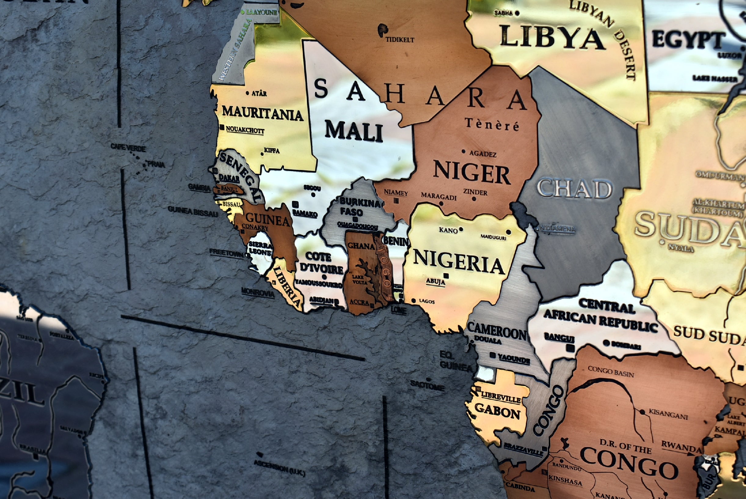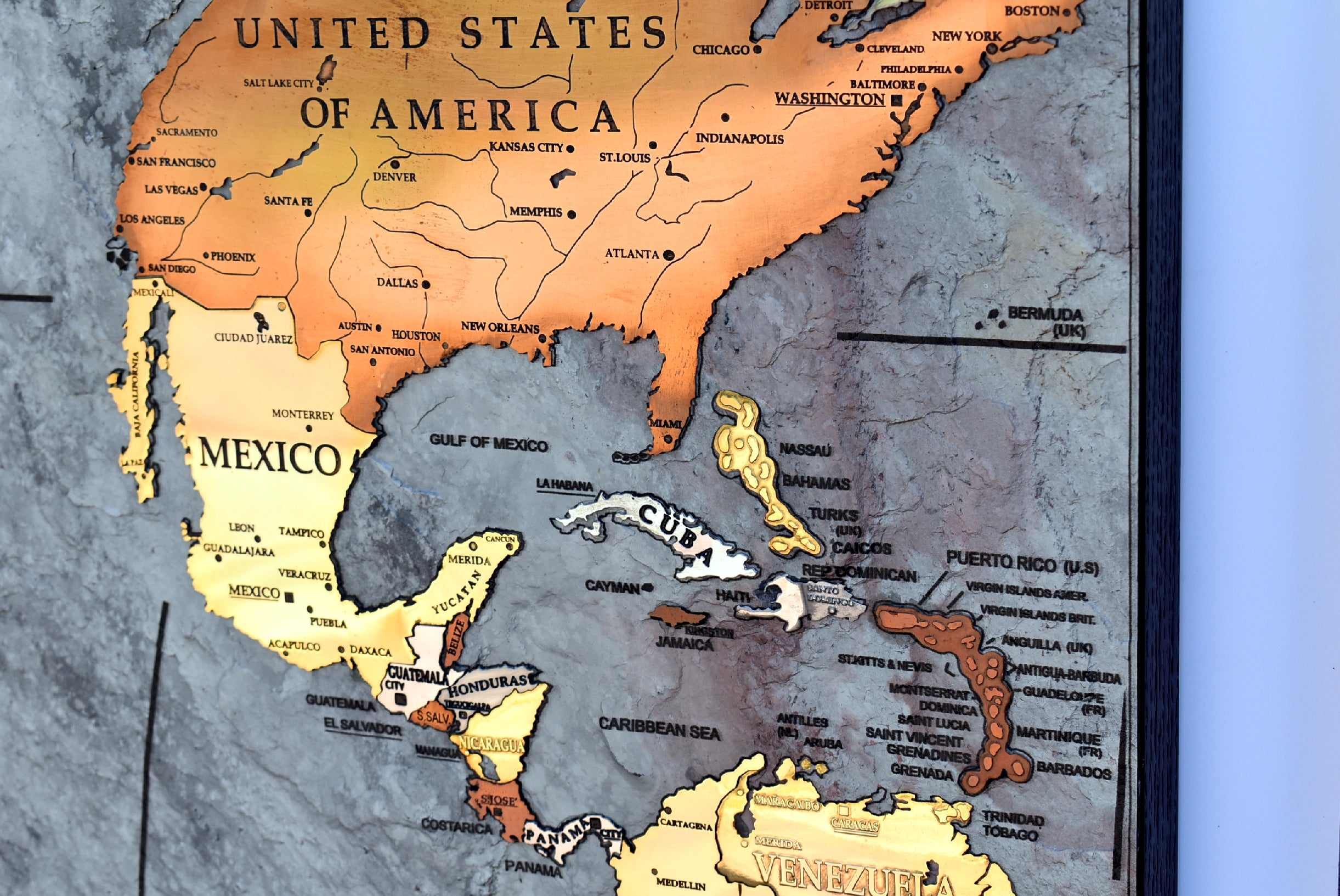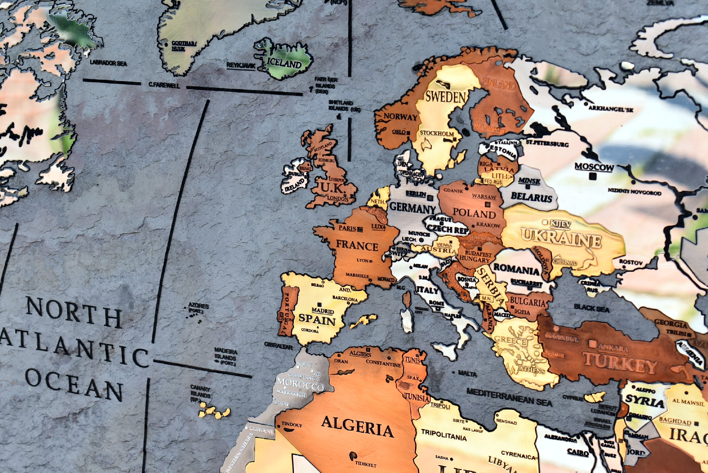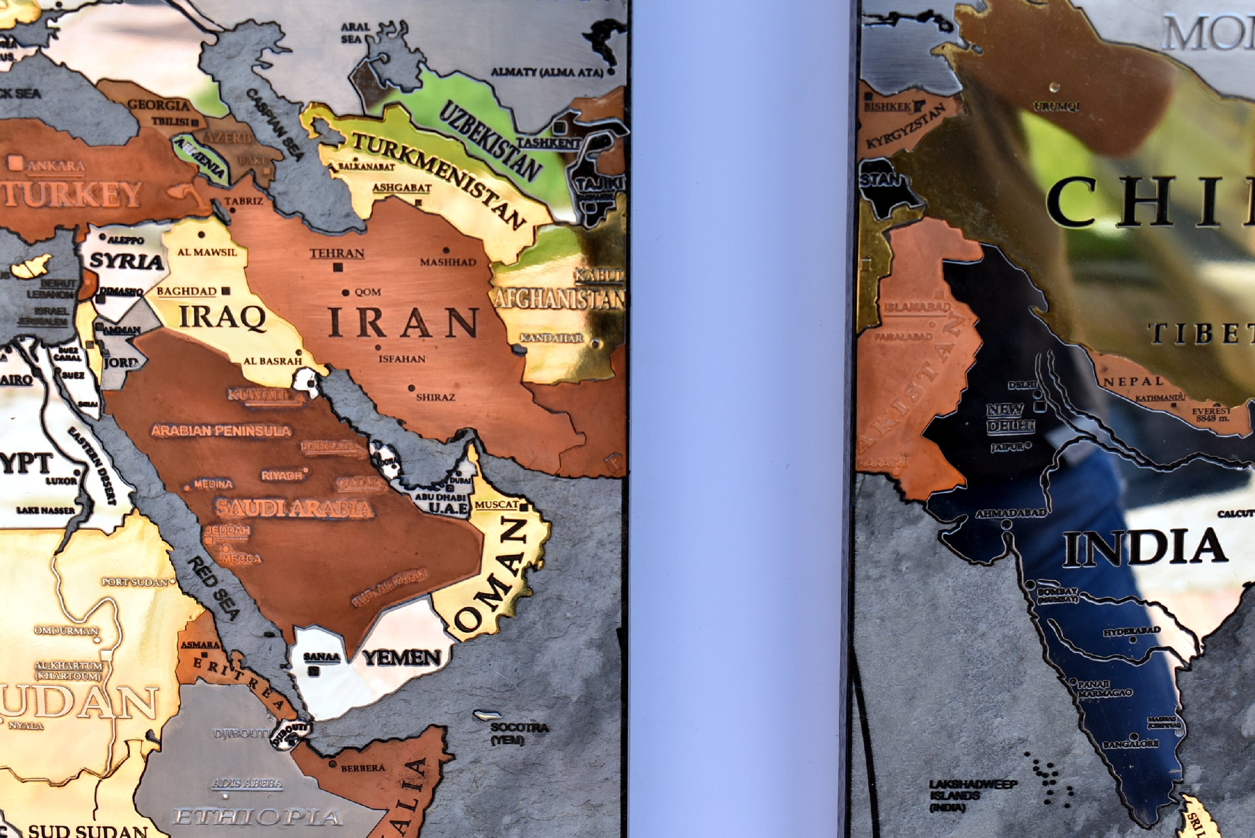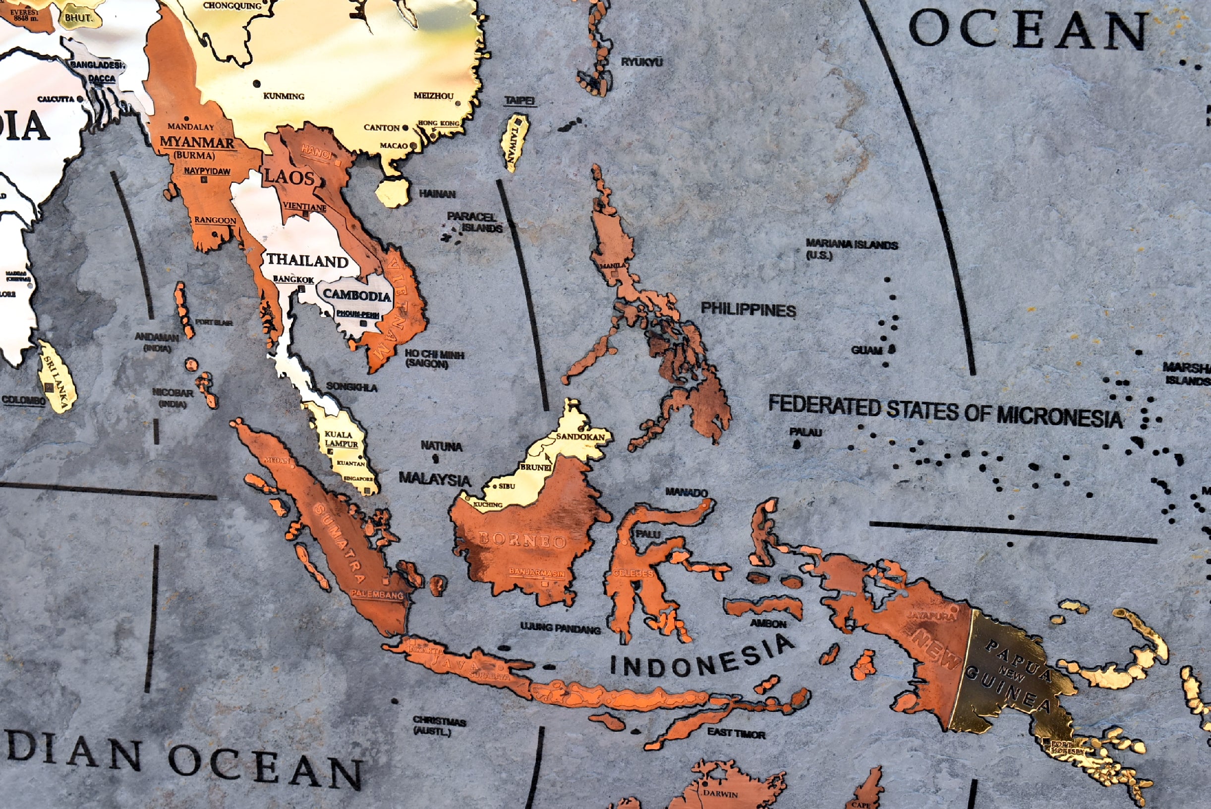 A good part of the around 500 metal inserts contains engraved writings, more than 400 writings are glazed by hand one by one inside engraving. Each nation is a different insert made with different metal as well as the most important islands and the poles too.