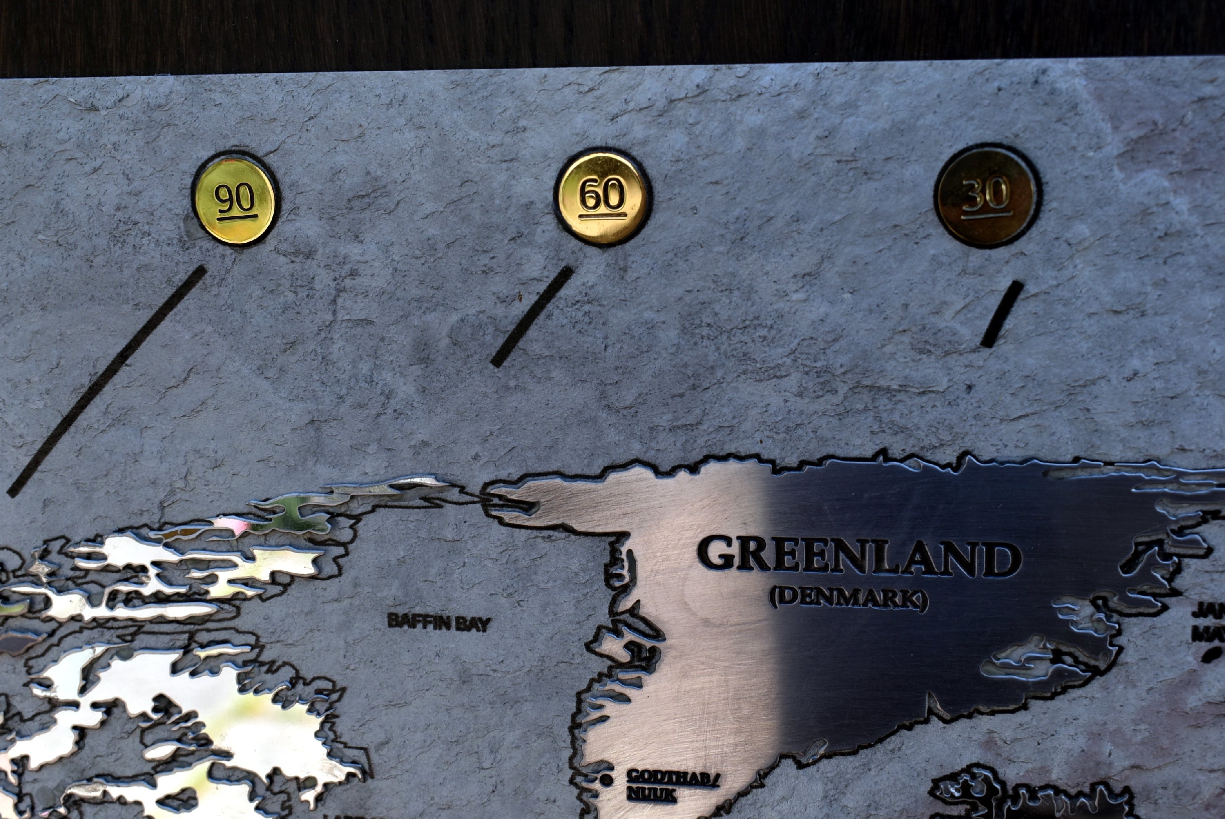 All the metal inserts are mounted on 3 bases made with sheets of genuine grey slate. The stone is all frosted and leveled by hand in order to apply in a planar way all the metal inserts in such a way as not to create height differences between the metals. The slate is contoured, by CNC technologies, digitally printed with and is fixed on a wood panel. The oak wood panels are polished by hand with wax.